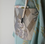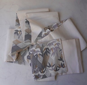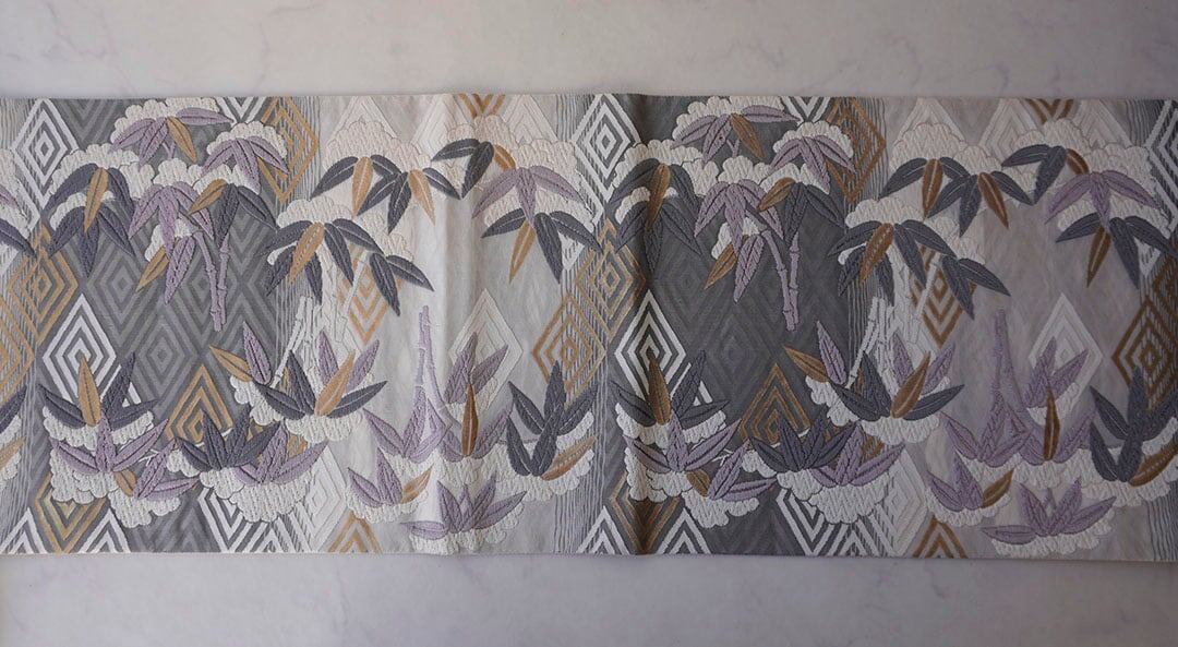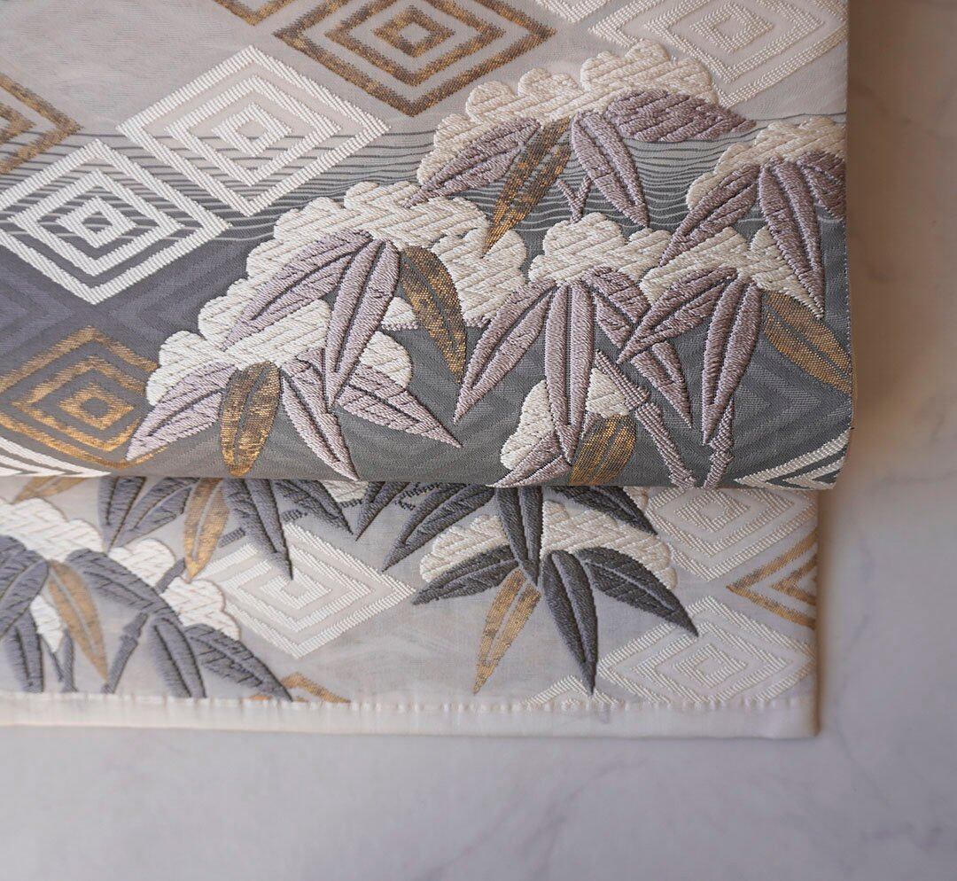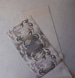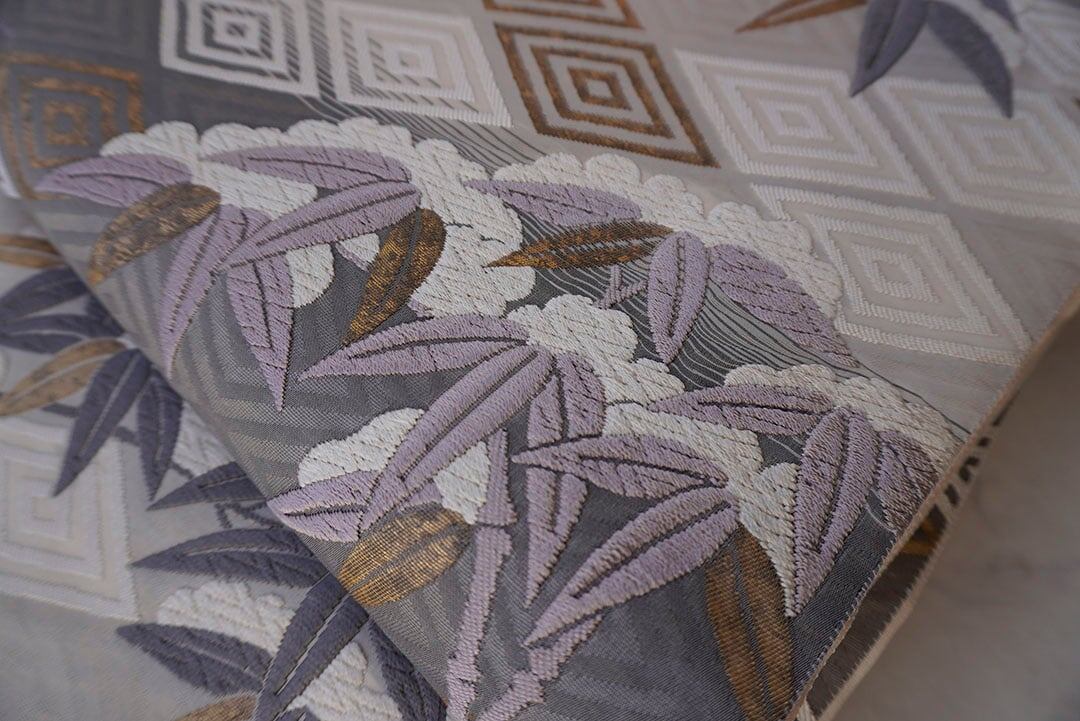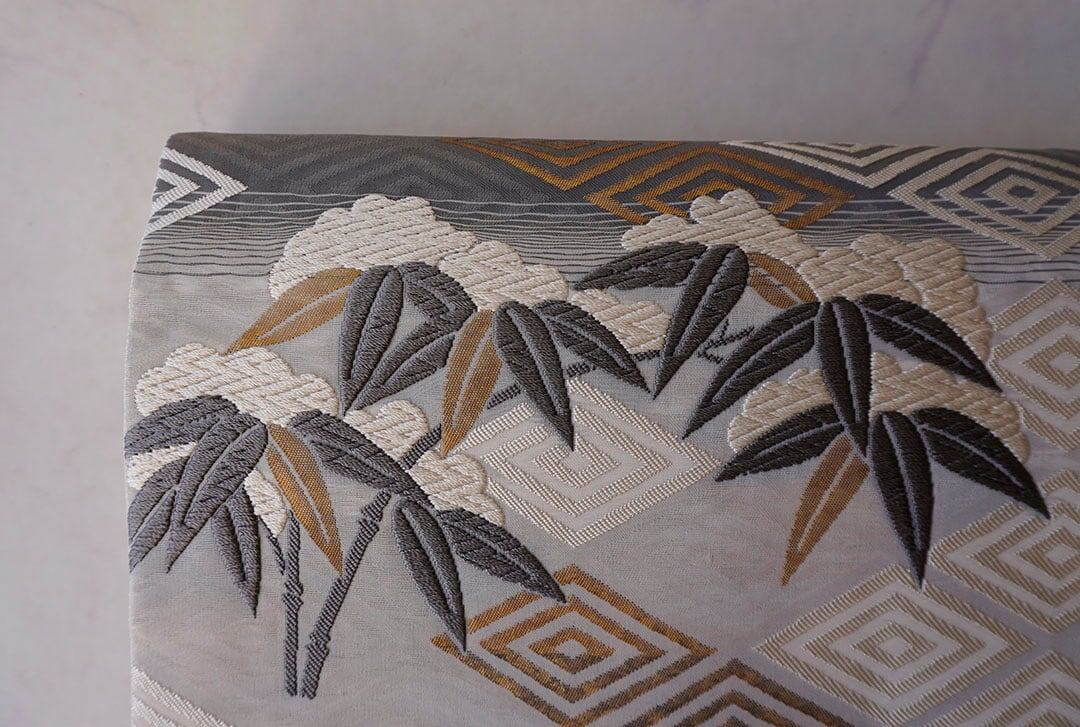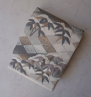 縞柄に雪持ち笹文を配したふくろ帯です。