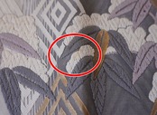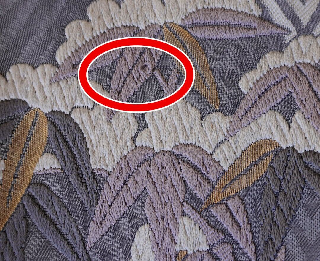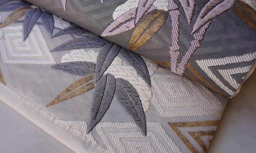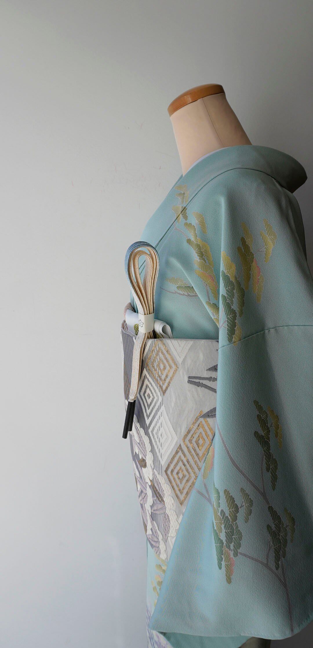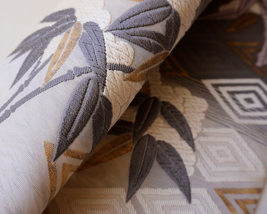 縞柄に雪持ち笹文を配したふくろ帯です。