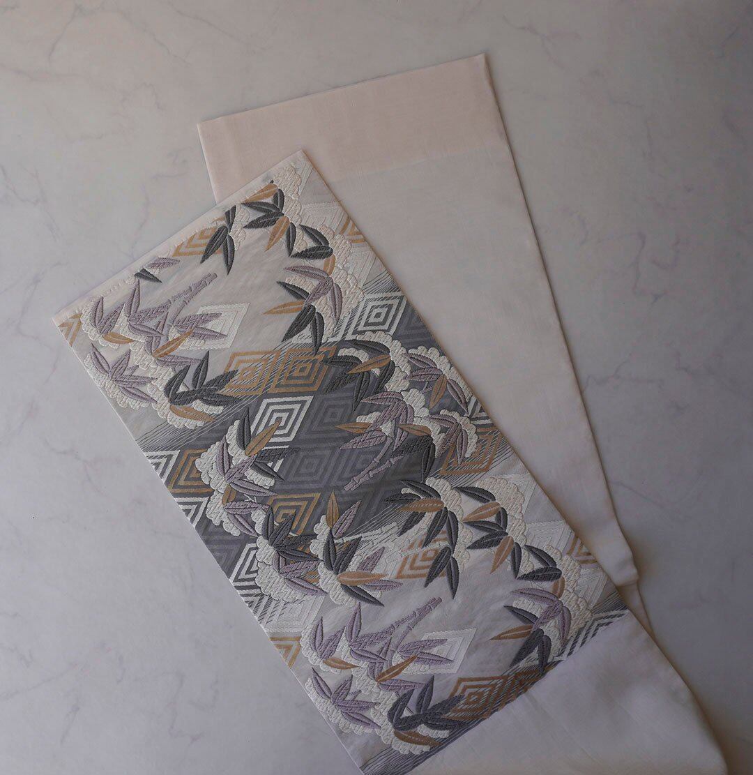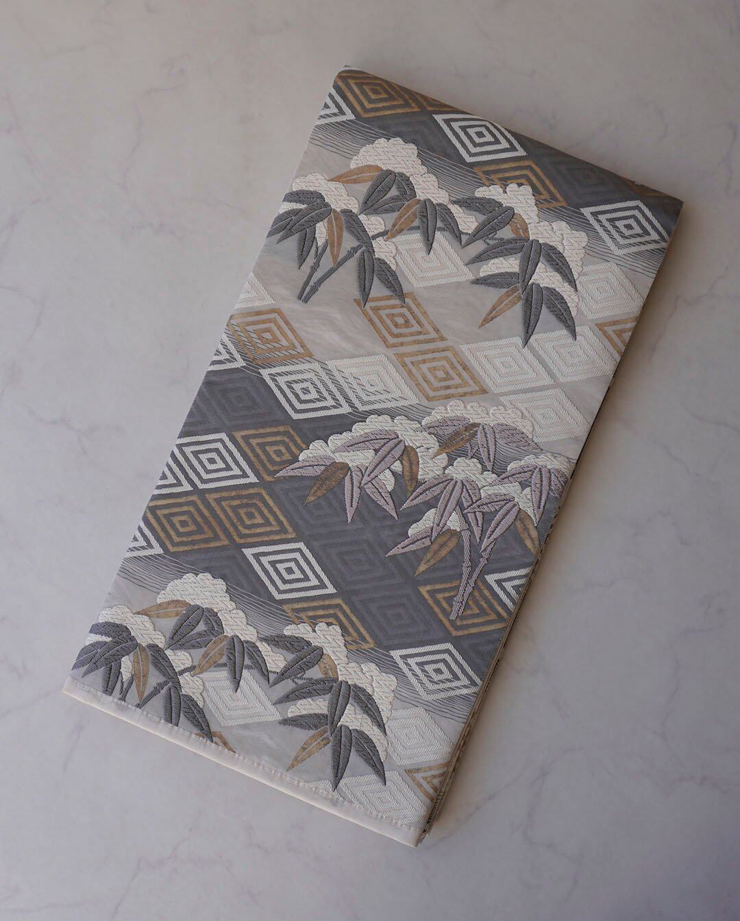 【ふくろ帯】 薄墨色×白鼠地 緯縞柄 雪持ち笹文 ふくろ帯
