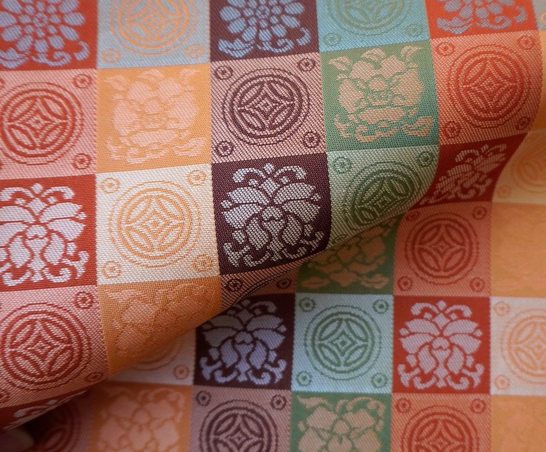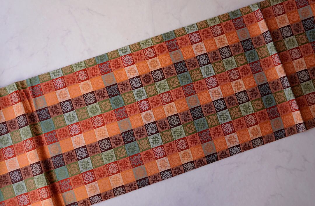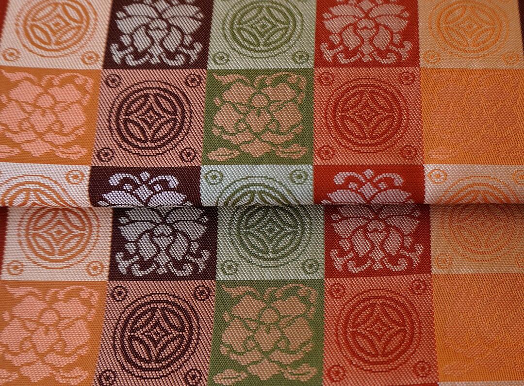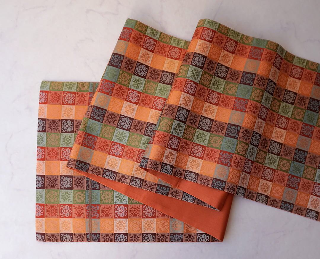 【ふくろ帯】蜜柑色地 格子に七宝と花文 ふくろ帯