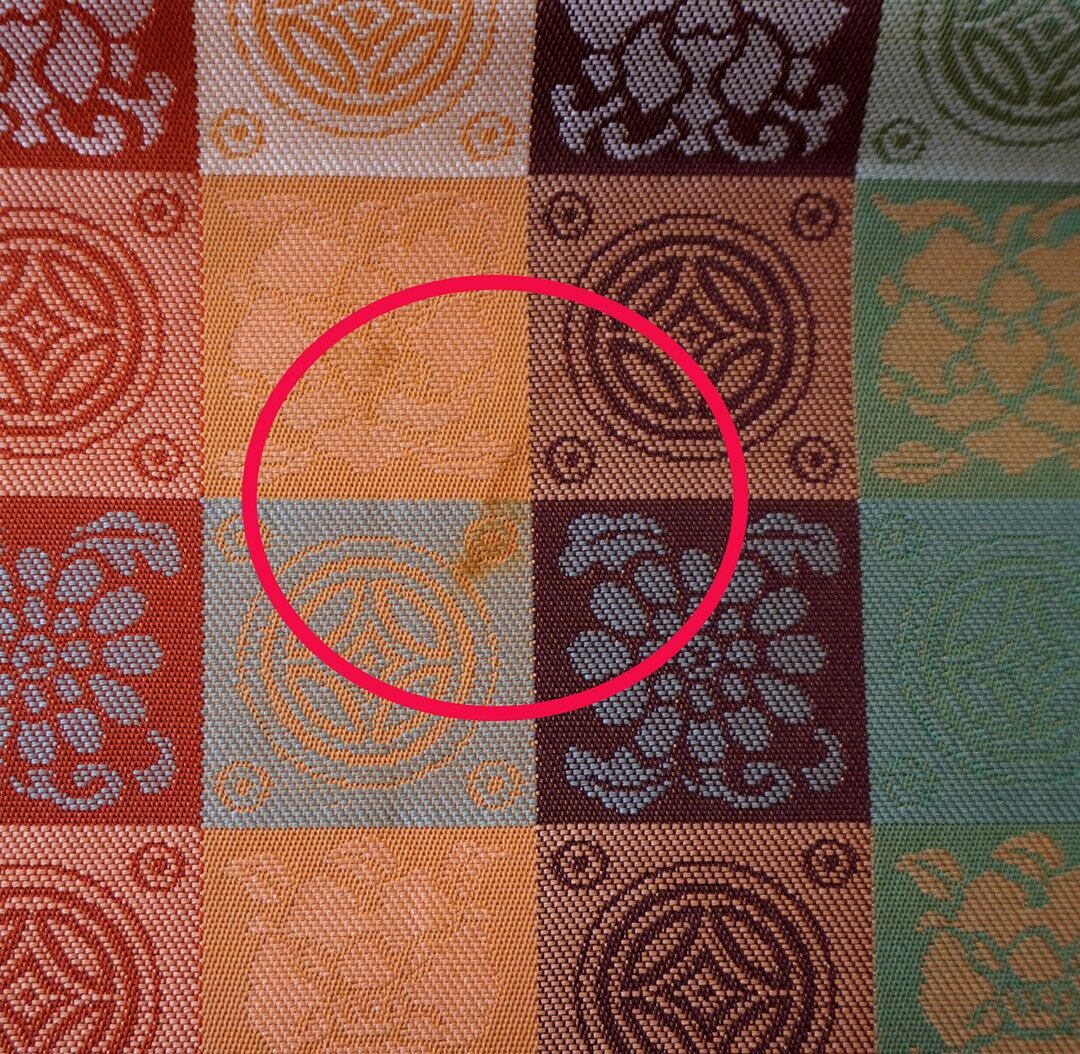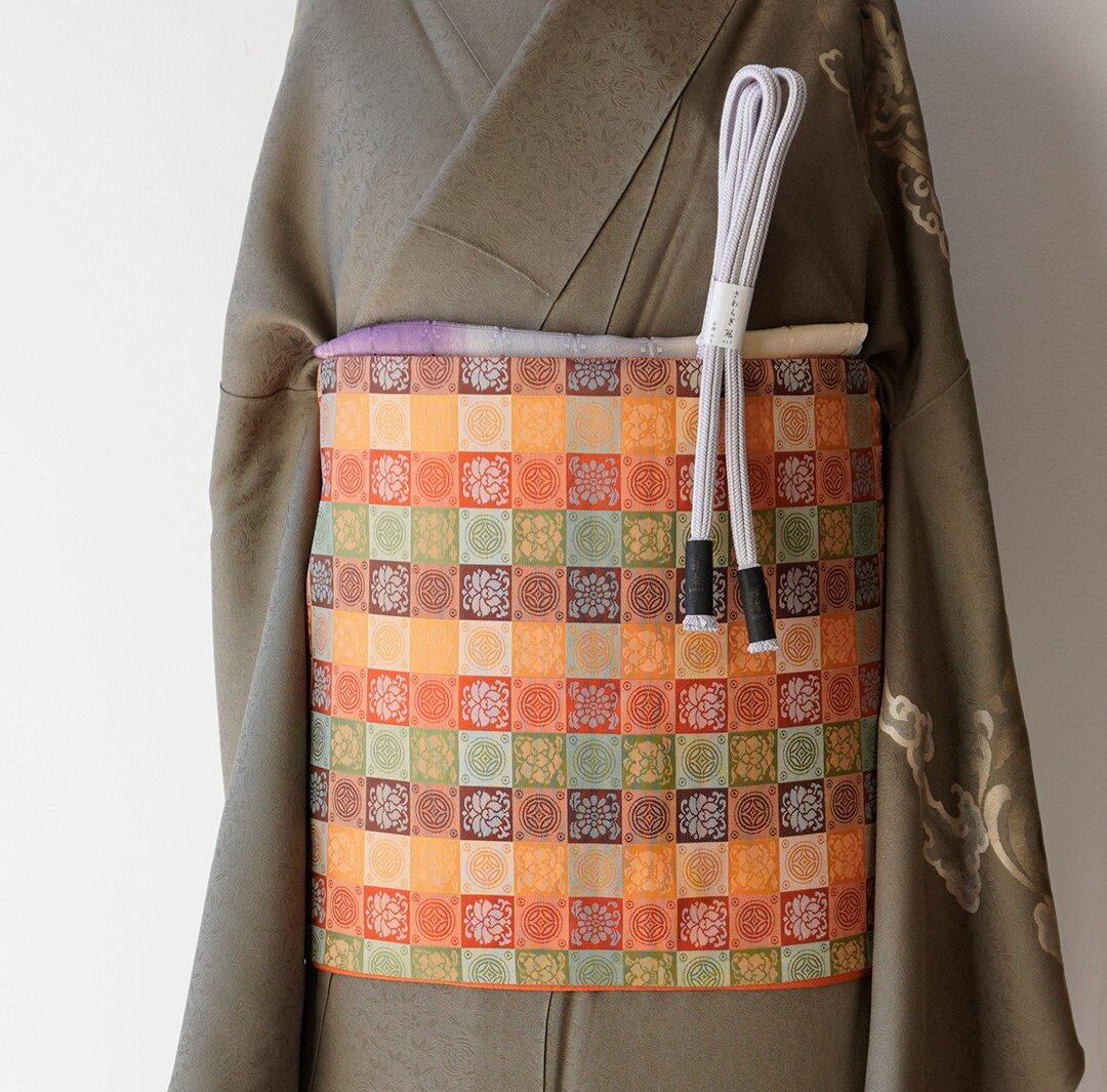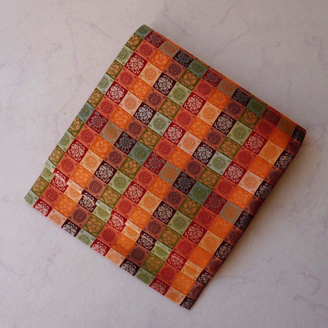 【ふくろ帯】蜜柑色地 格子に七宝と花文 ふくろ帯