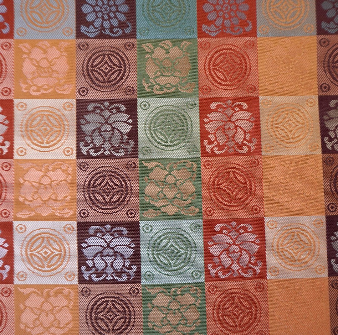 格子文の中に、七宝や椿、菊などの