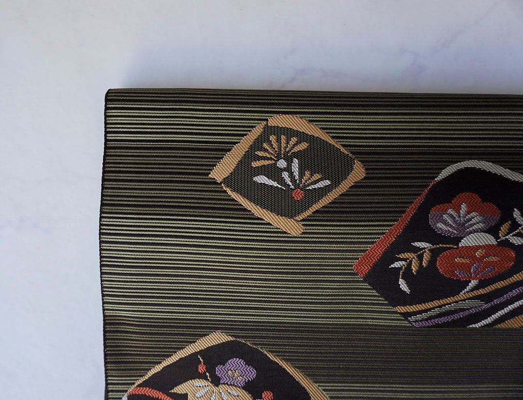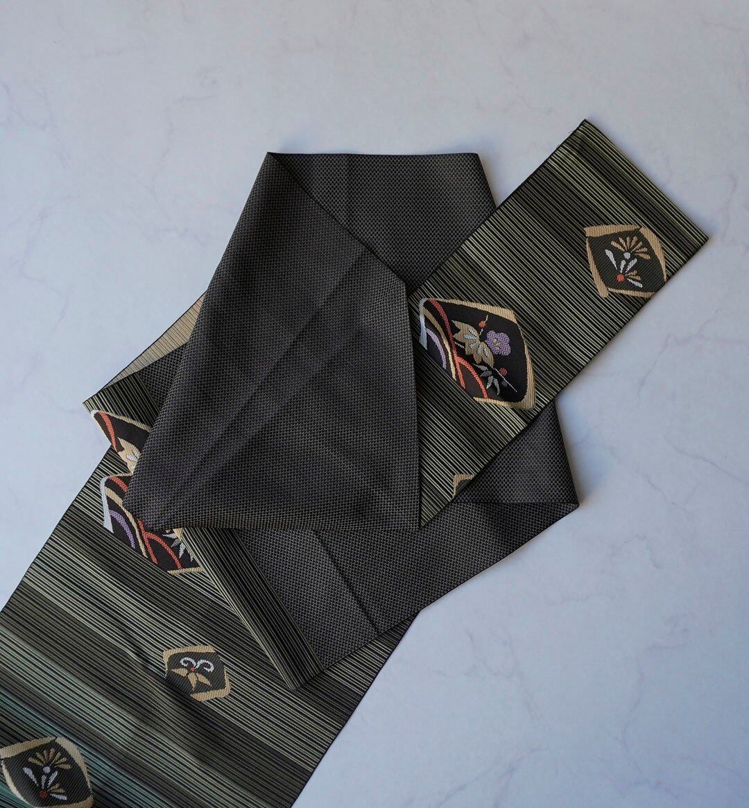 【なごや帯】 黒色地 緯縞柄 松竹梅文 変わり博多なごや帯