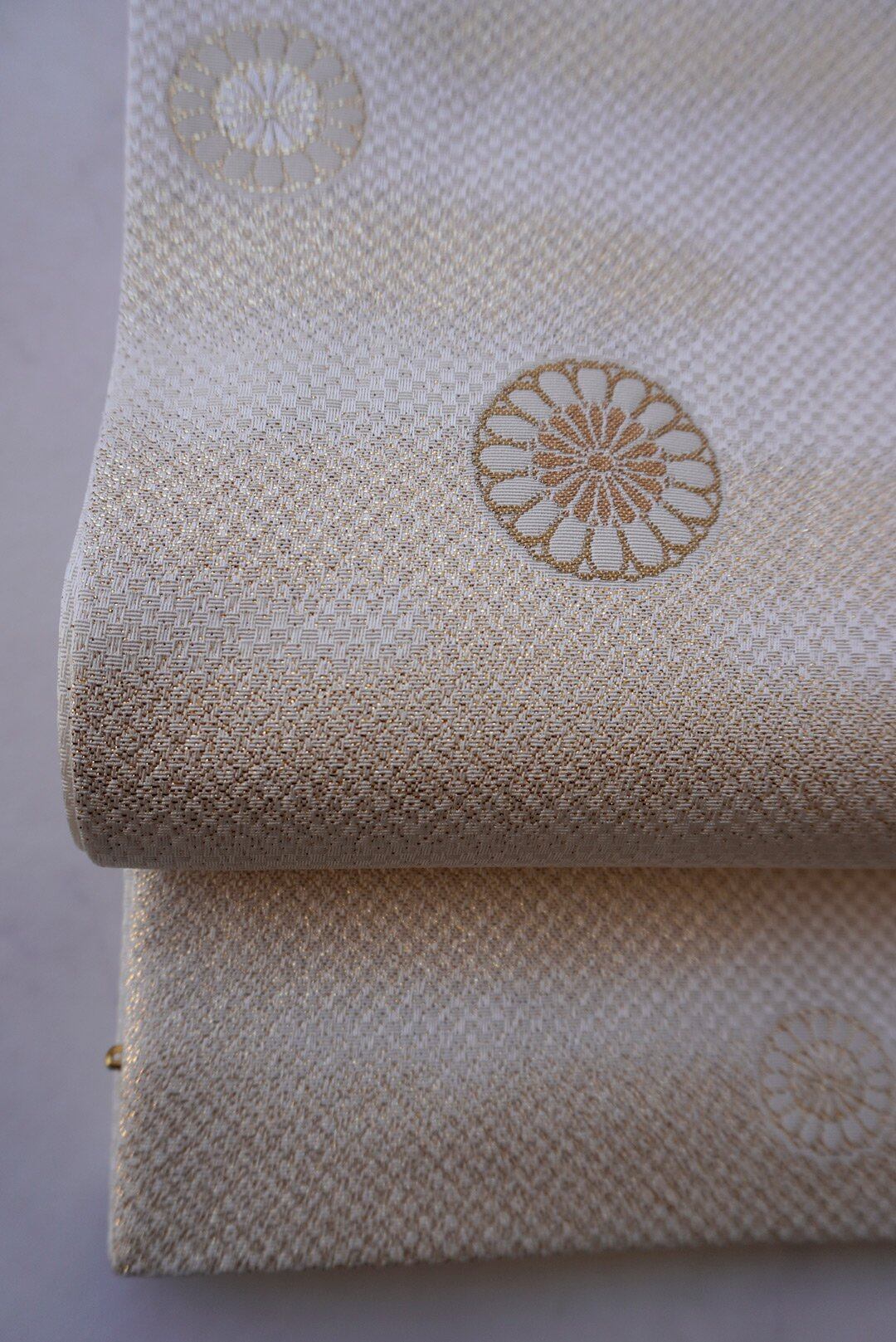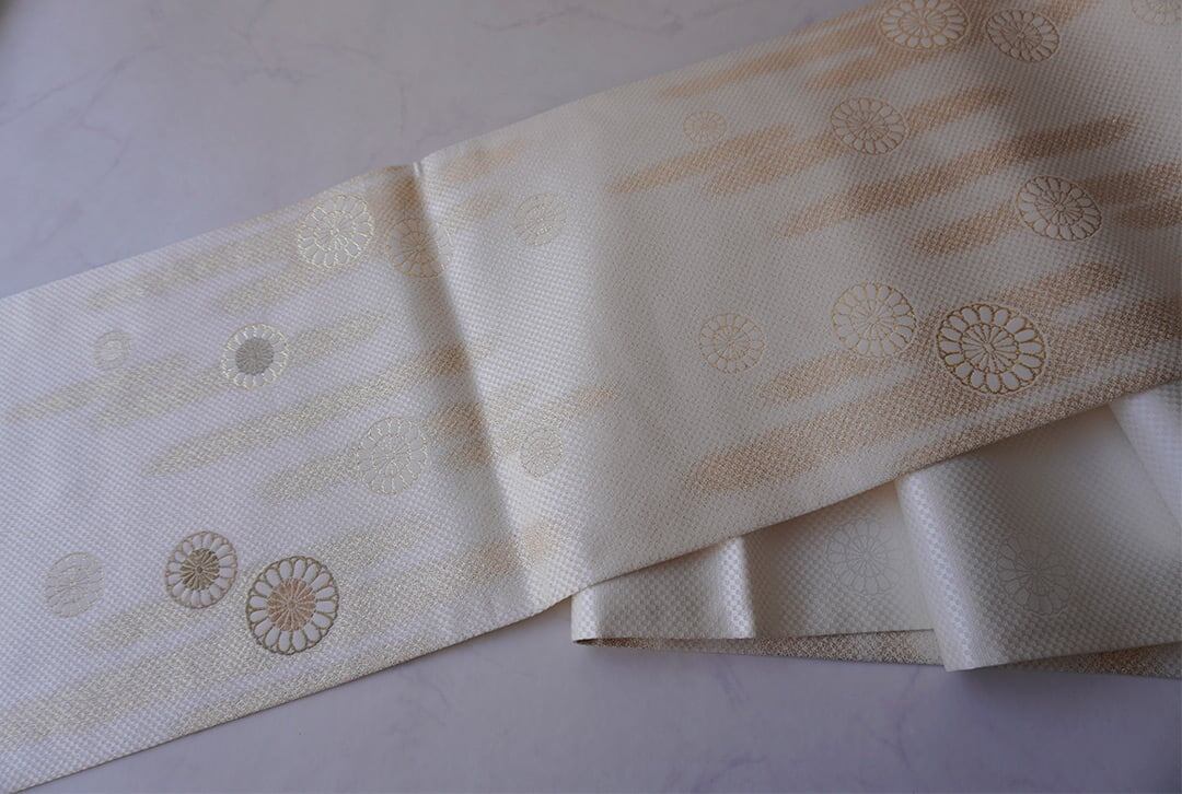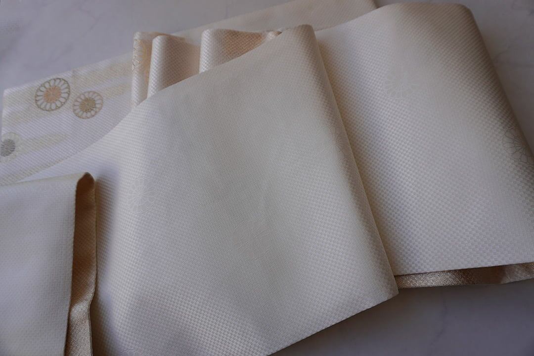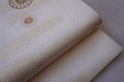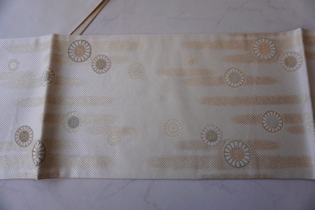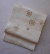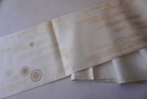 生成り地に菊華と霞紋のふくろ帯です。