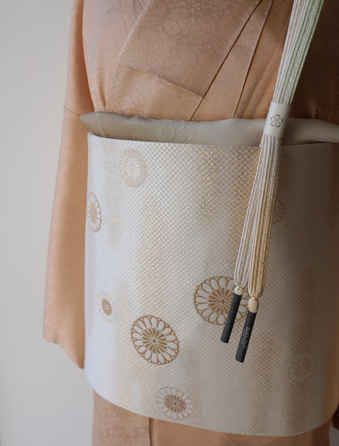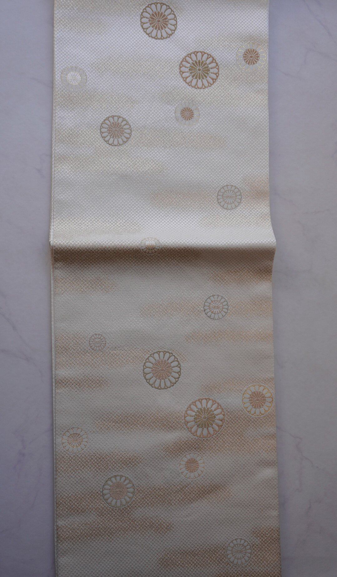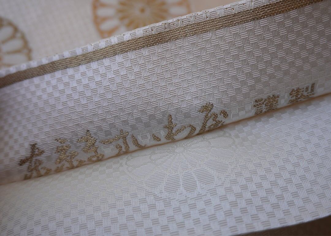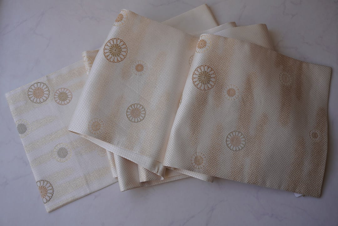 生成り地に菊華と霞紋のふくろ帯です。
