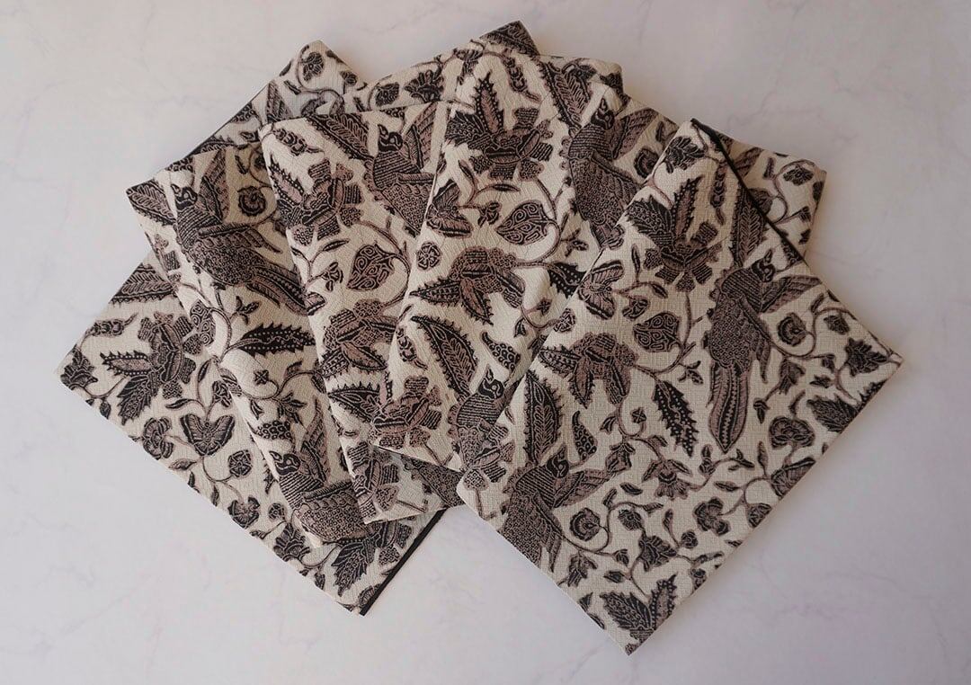 バティック調で描かれた鳥と抽象草花