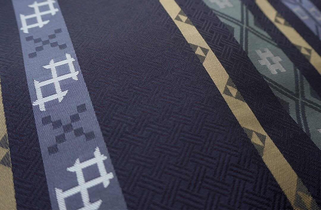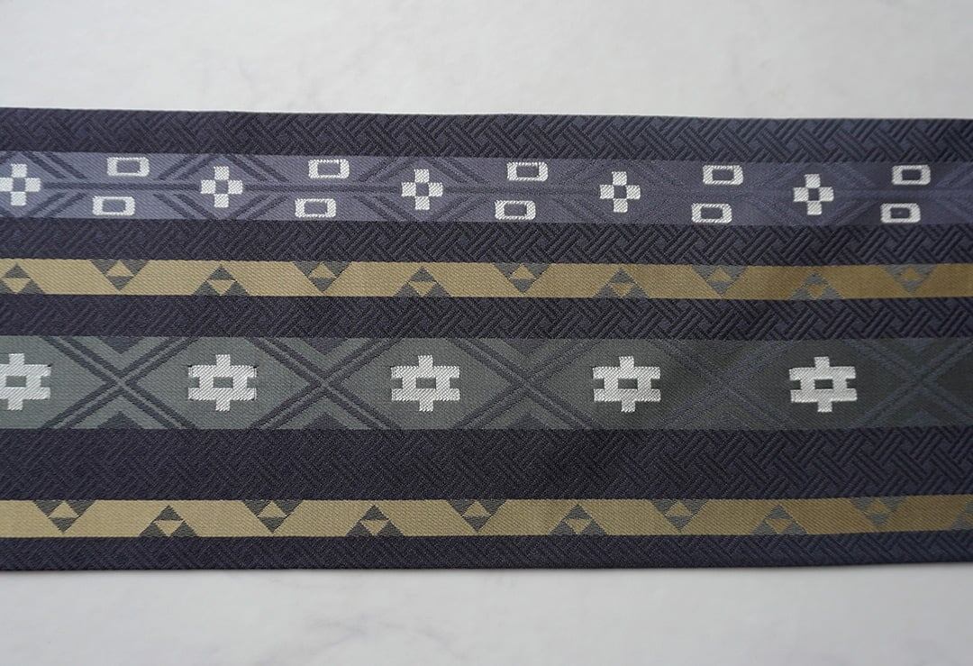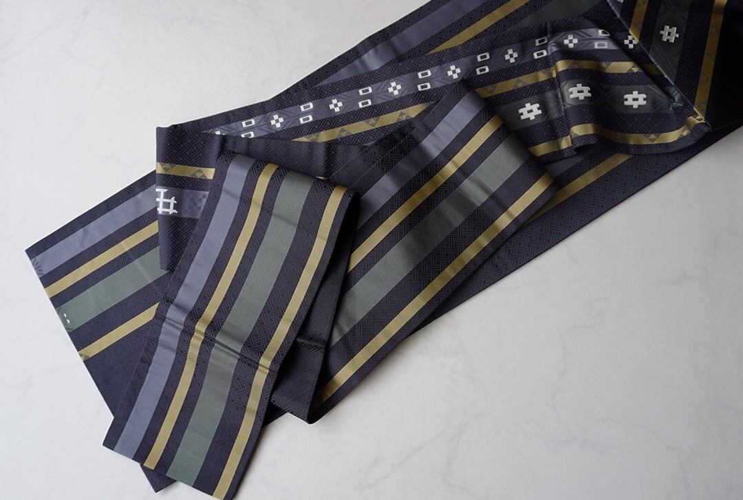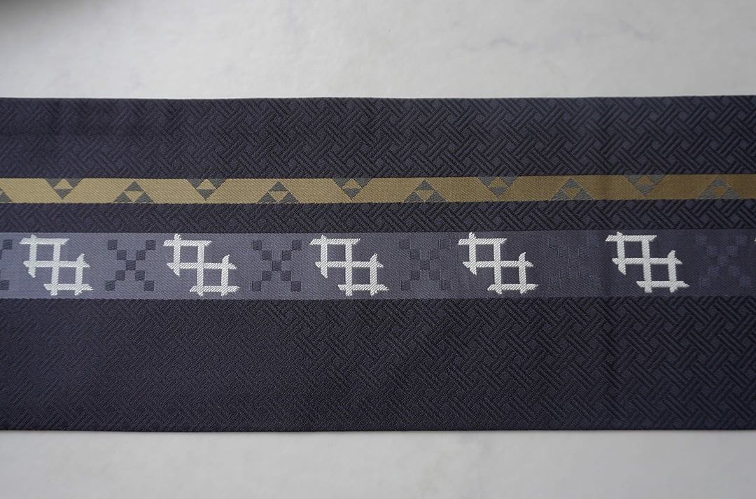 【なごや帯】藍鉄色 井桁と縞 なごや帯