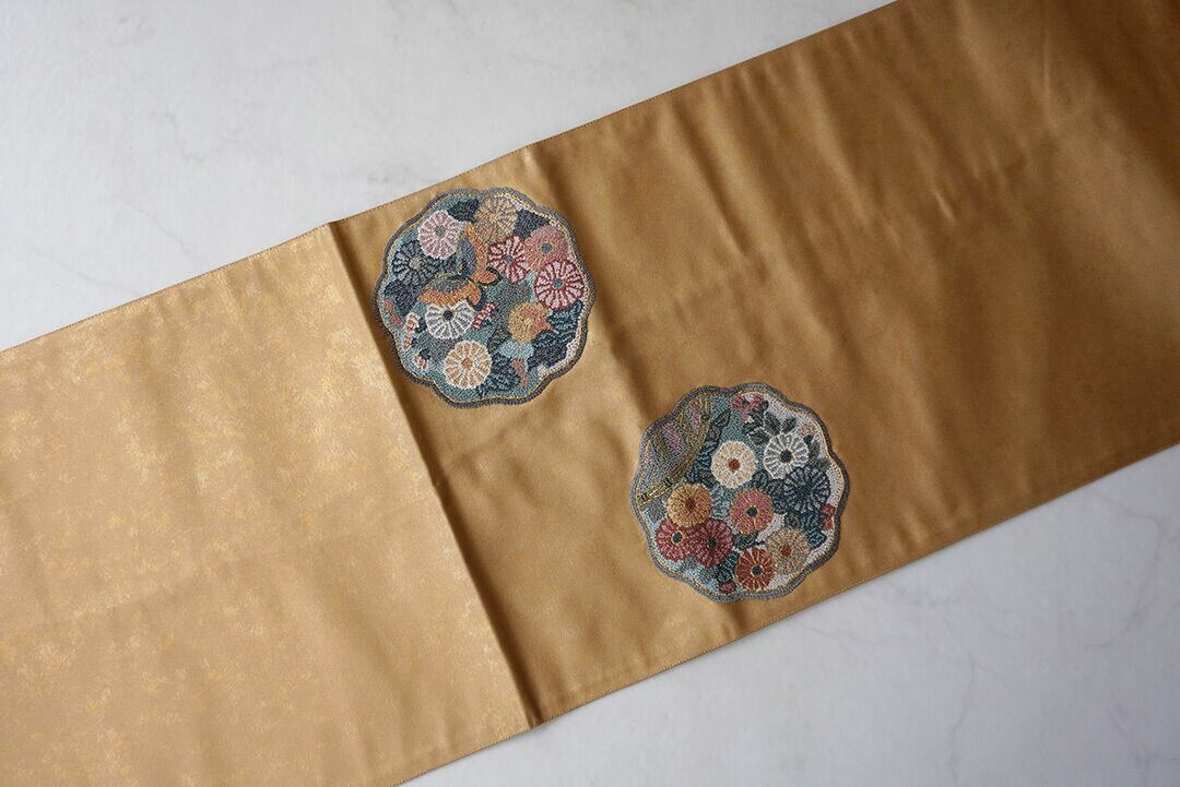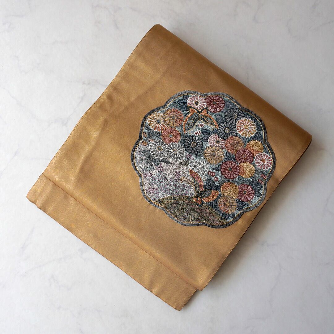 【ふくろ帯】黄土色地 相良刺繍菊に蝶文 ふくろ帯