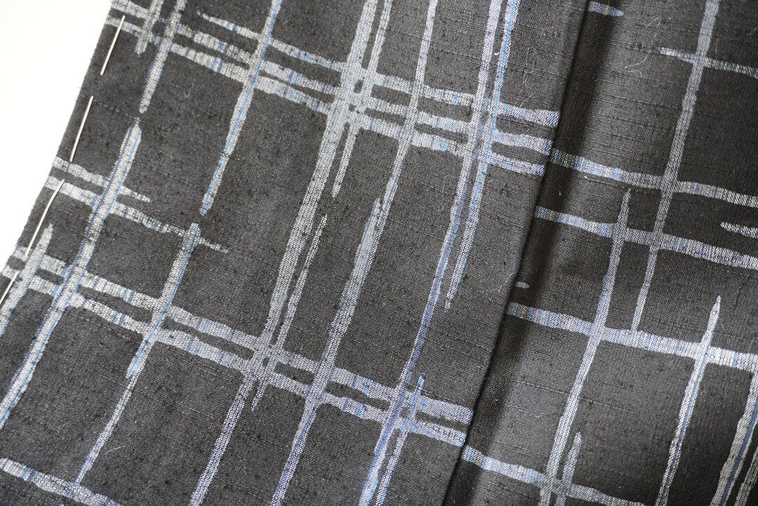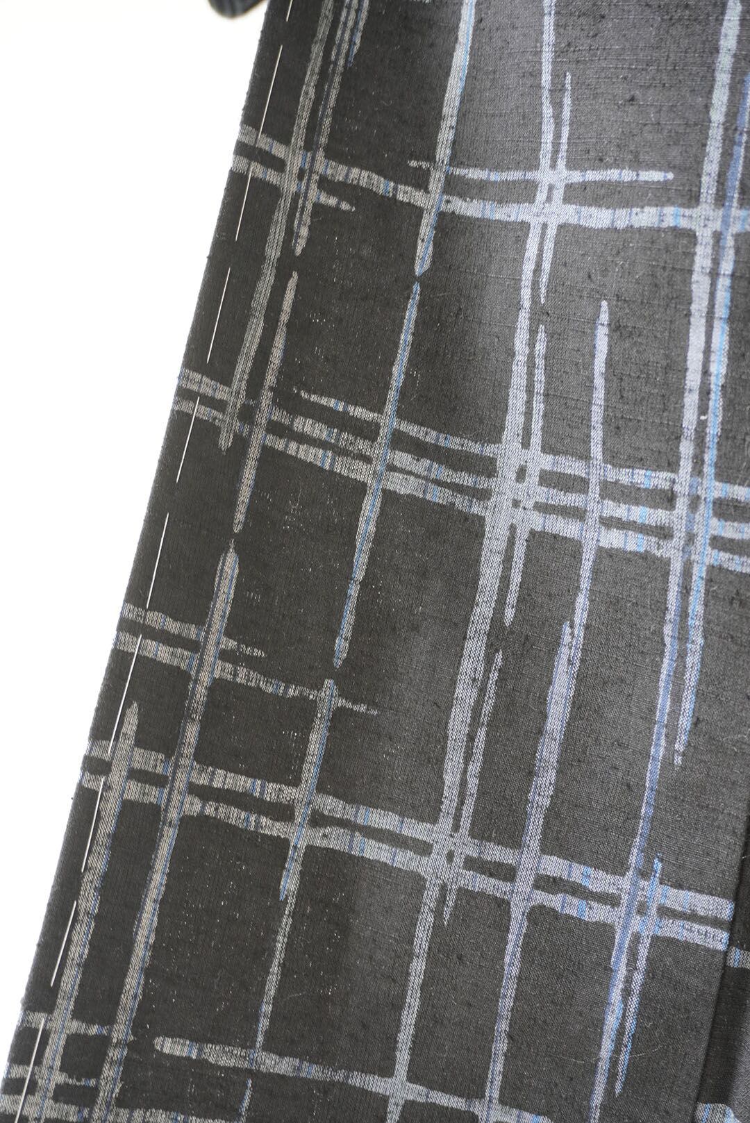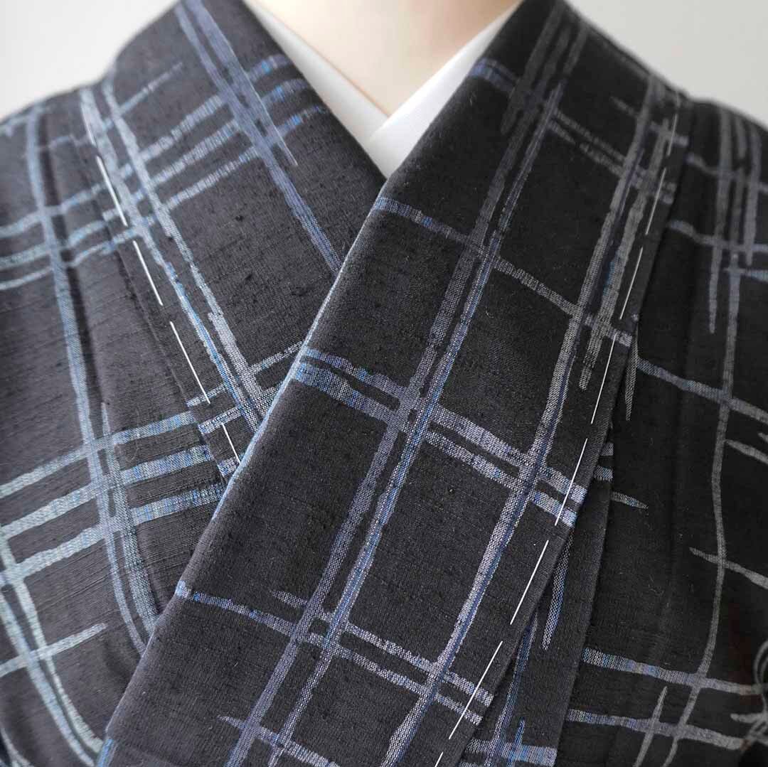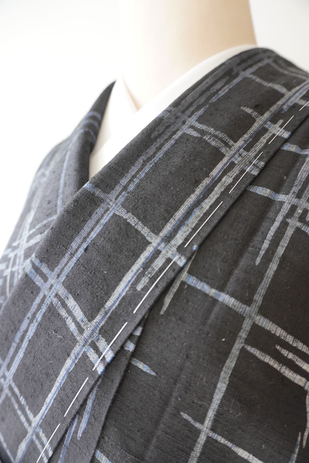 【袷】黒地に灰青 破れ格子文紬
