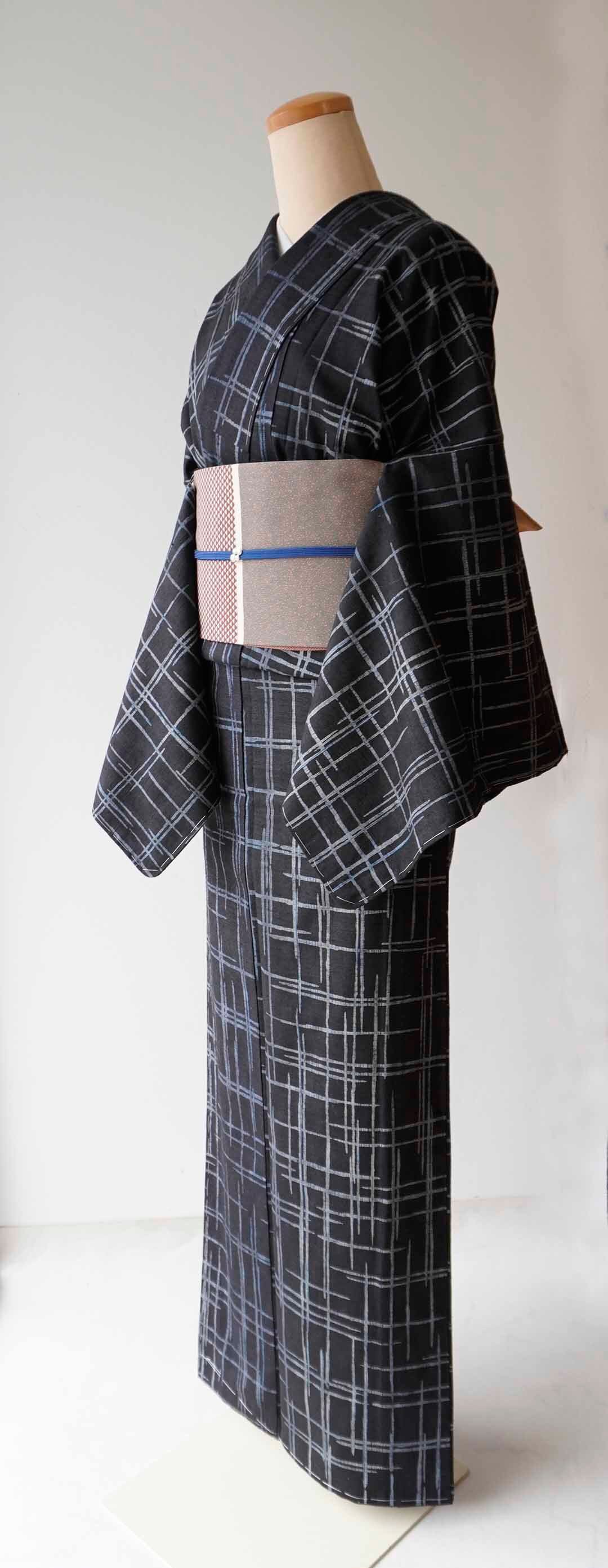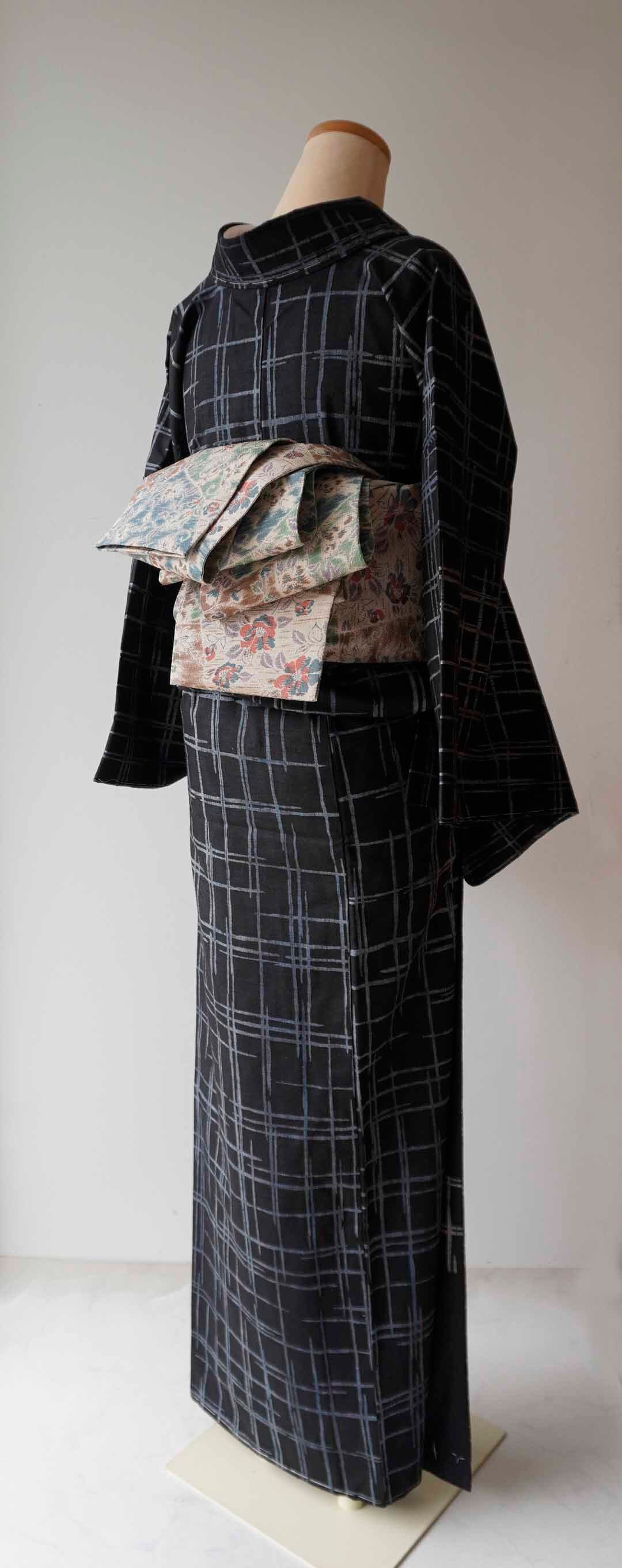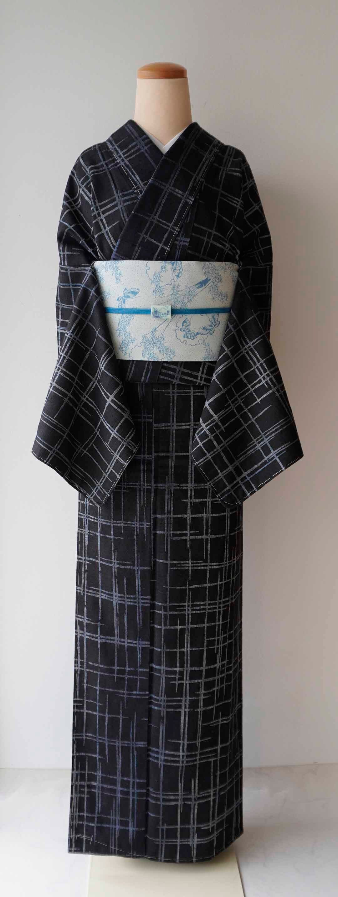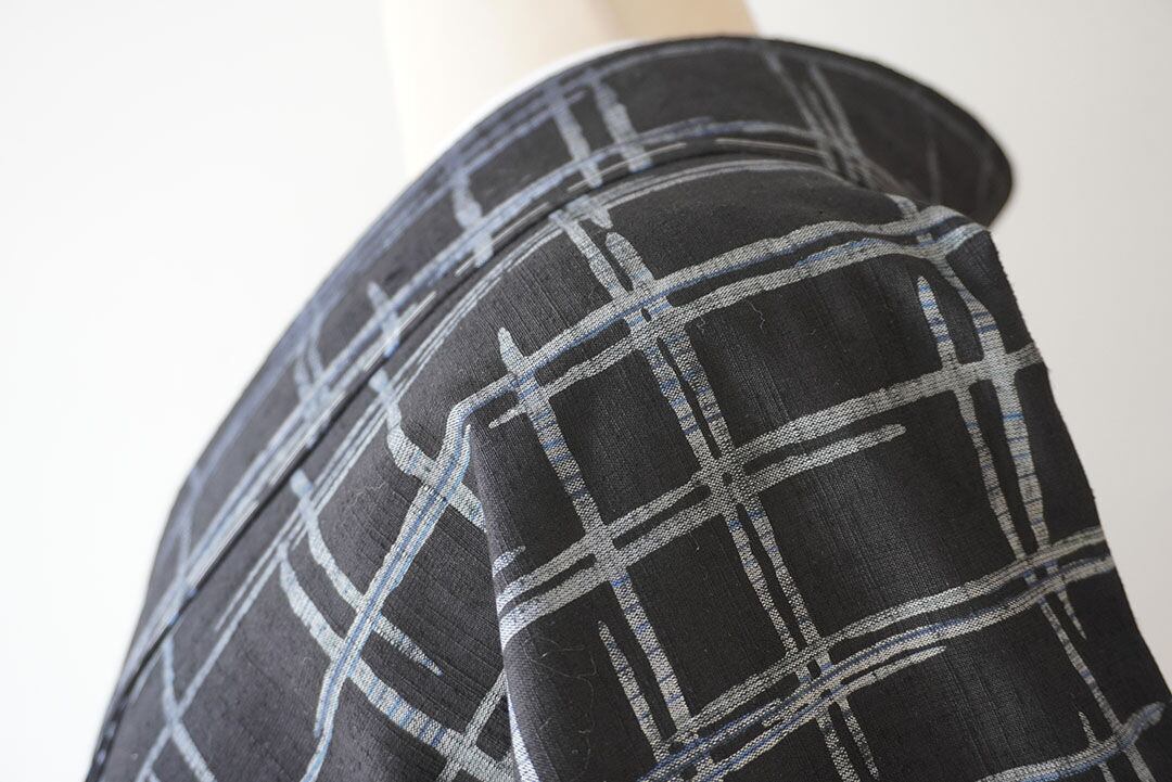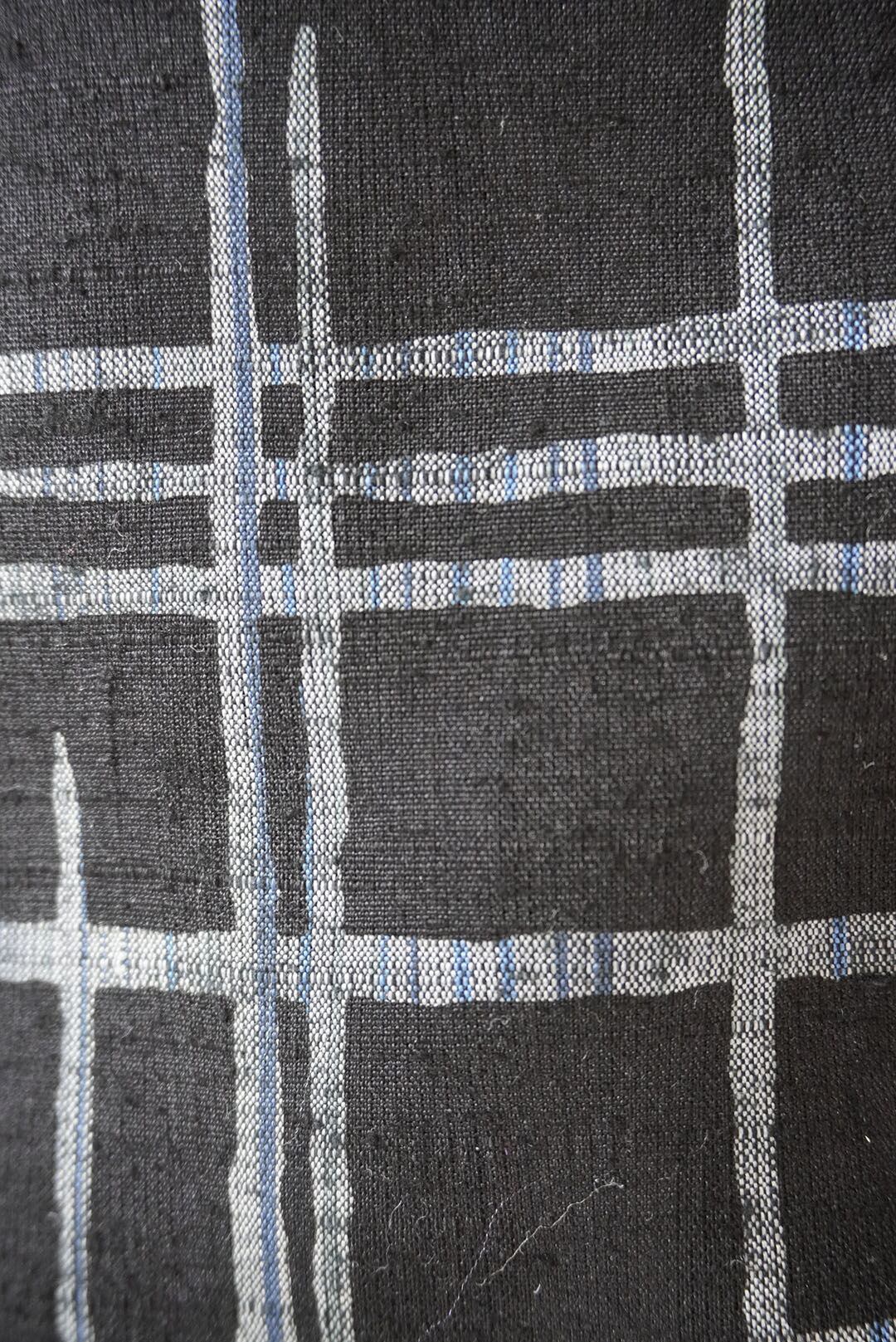 【袷】黒地に灰青 破れ格子文紬
