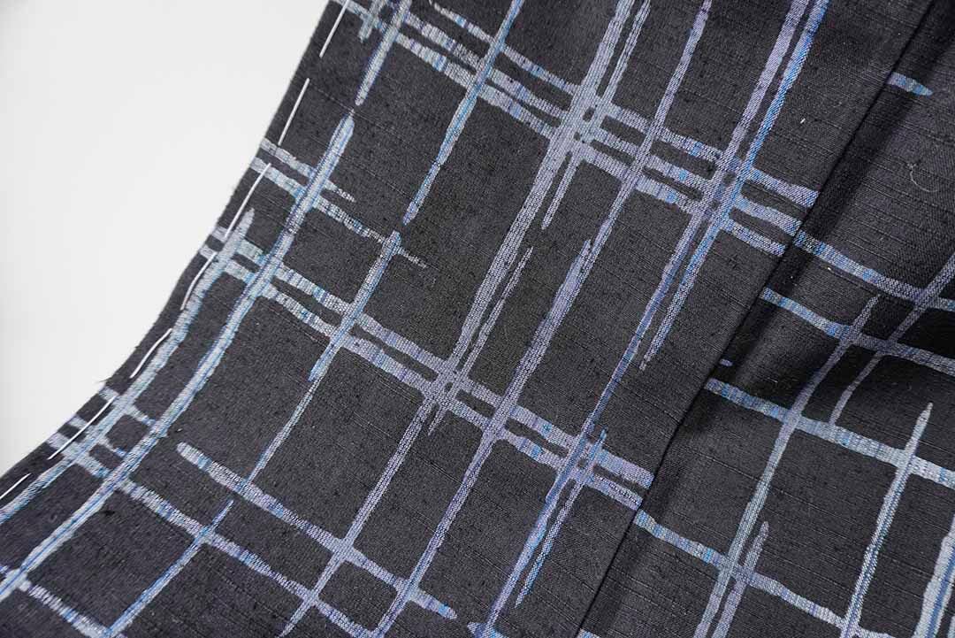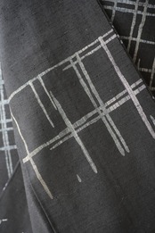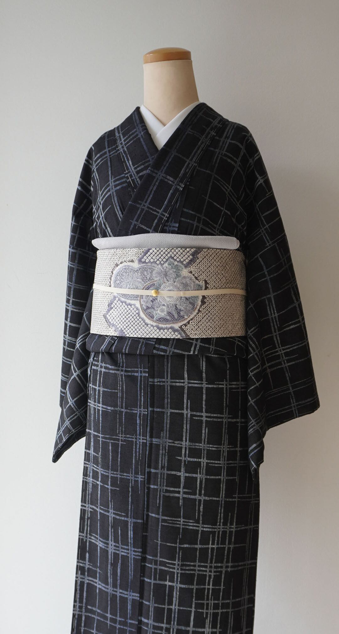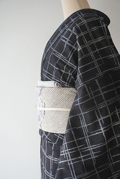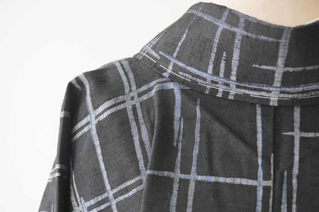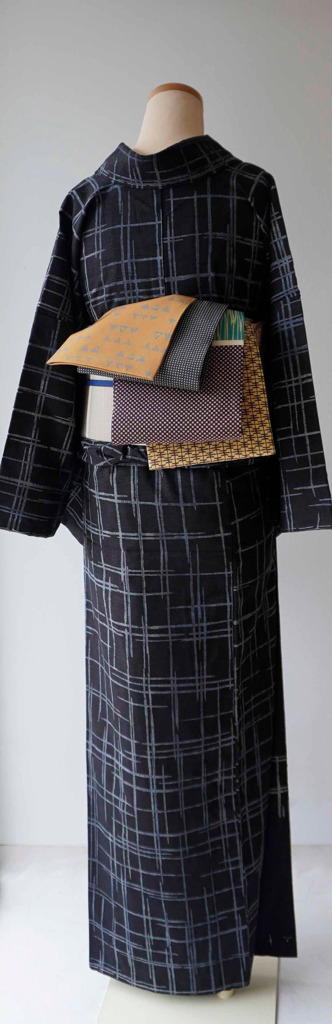 【袷】黒地に灰青 破れ格子文紬