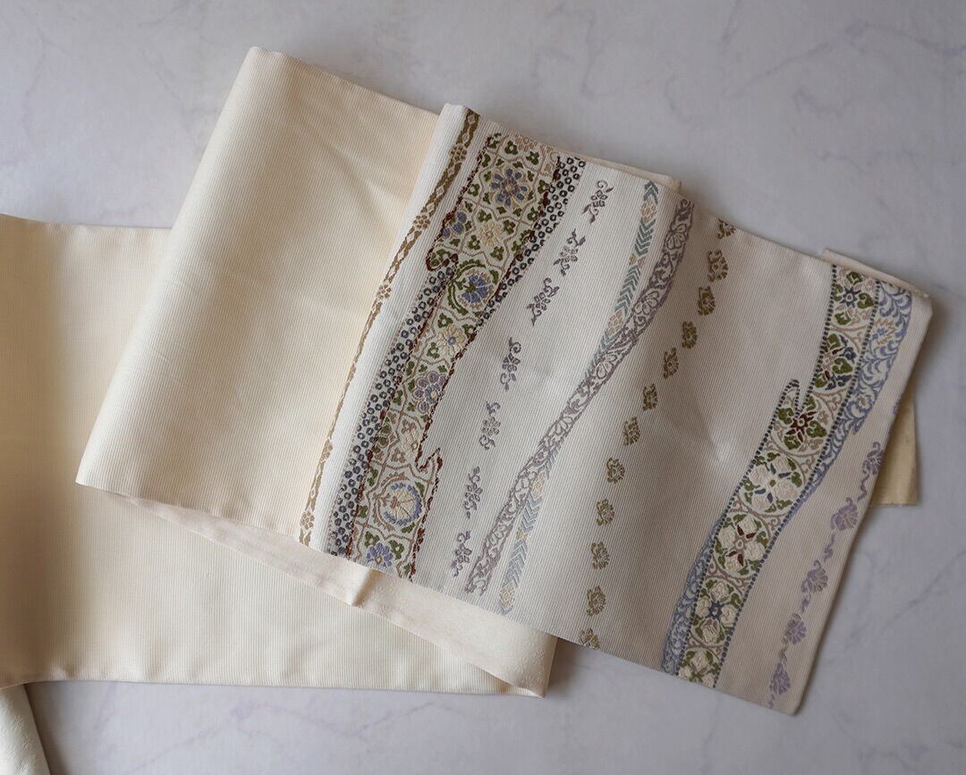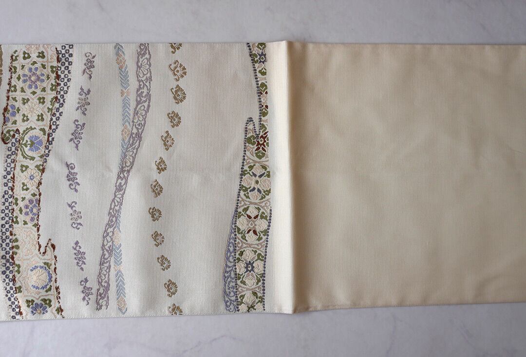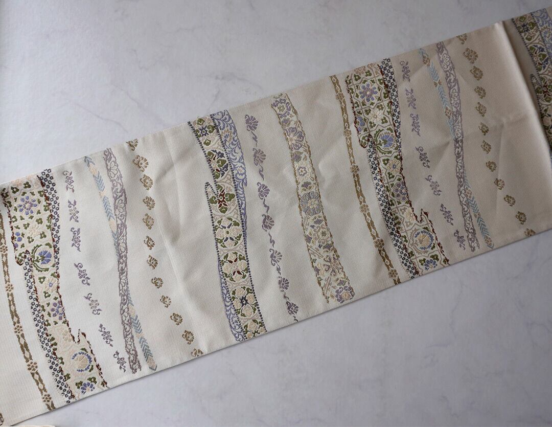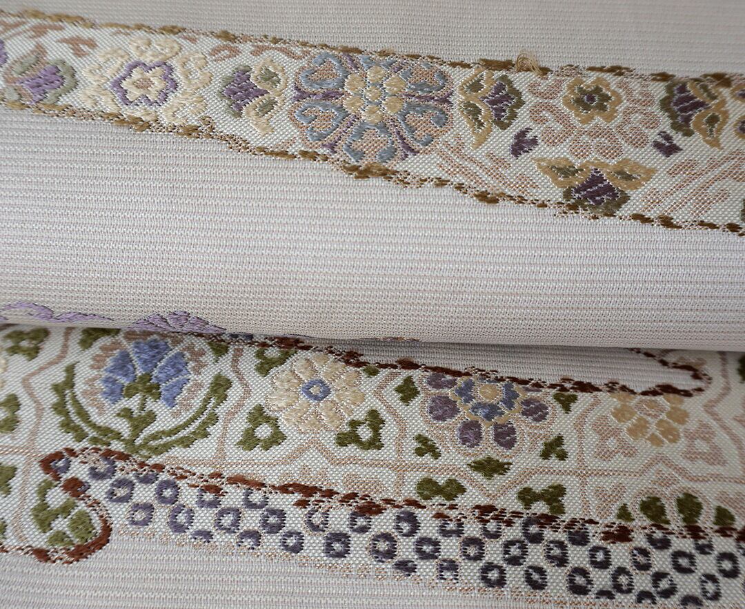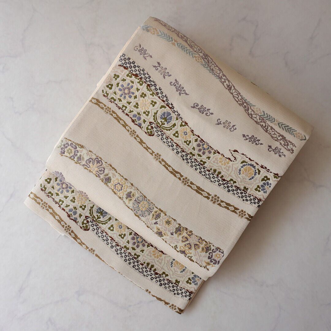 【ふくろ帯】西陣丸勇 生成り色地 花横段文 ふくろ帯