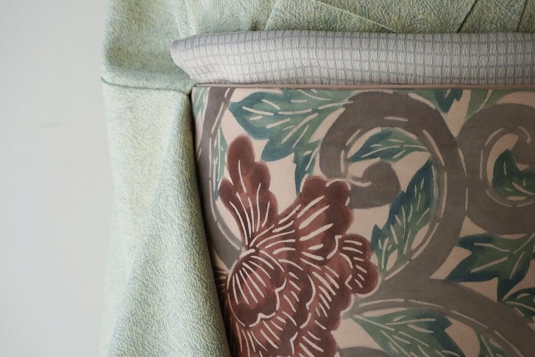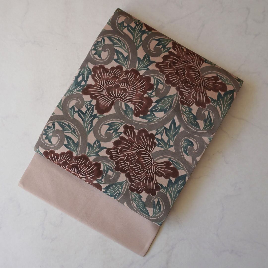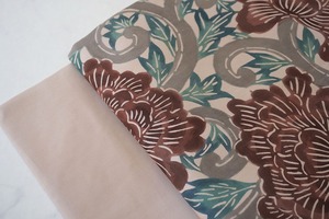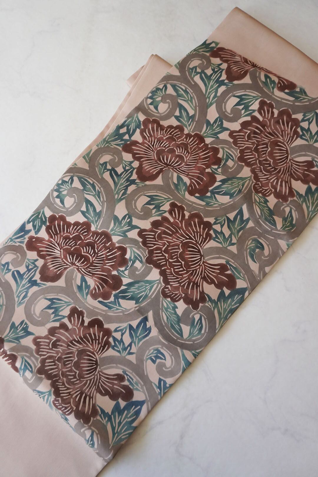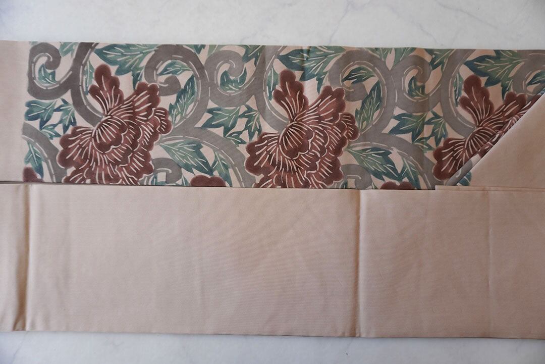 塩瀬のお生地に牡丹唐草の型染めの
