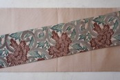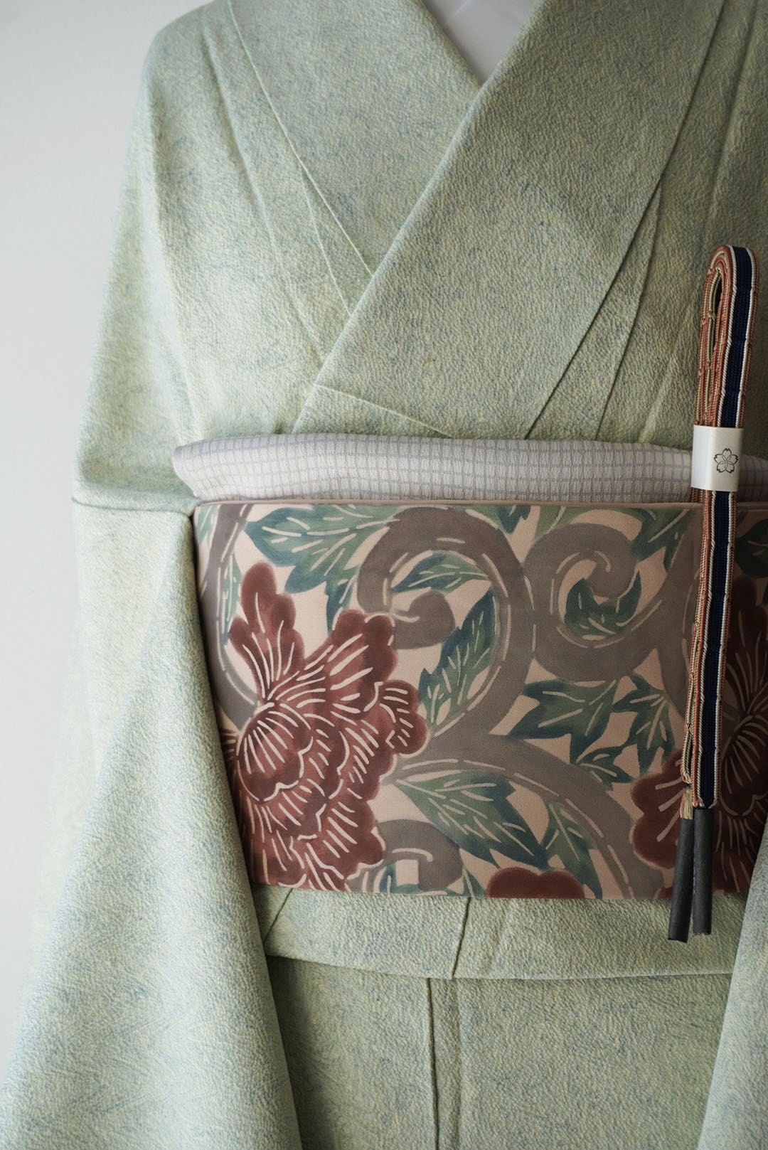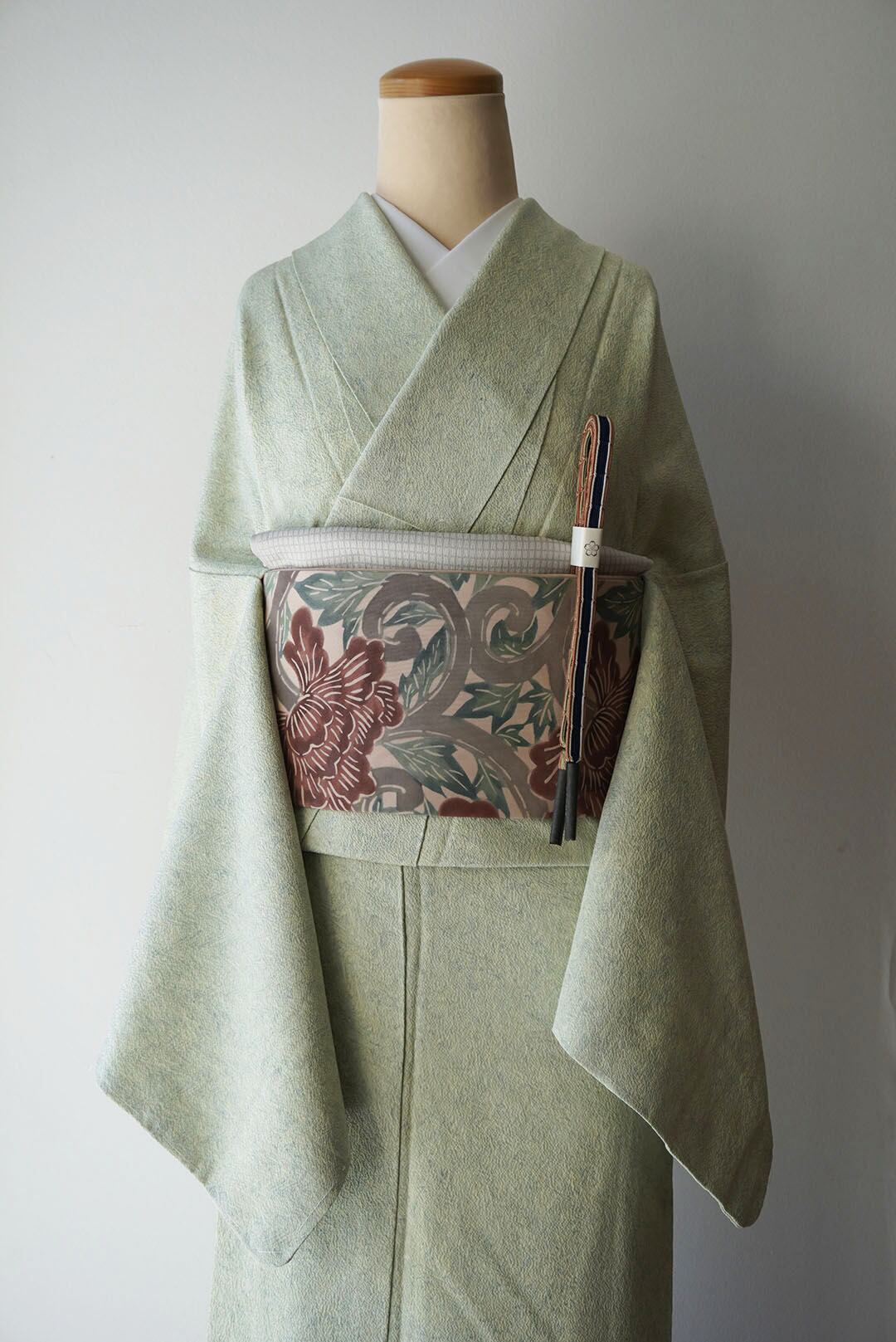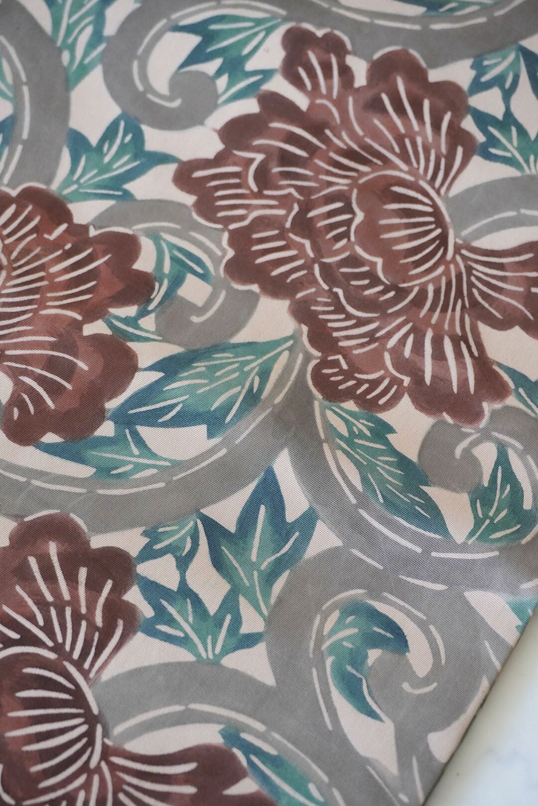 塩瀬のお生地に牡丹唐草の型染めの