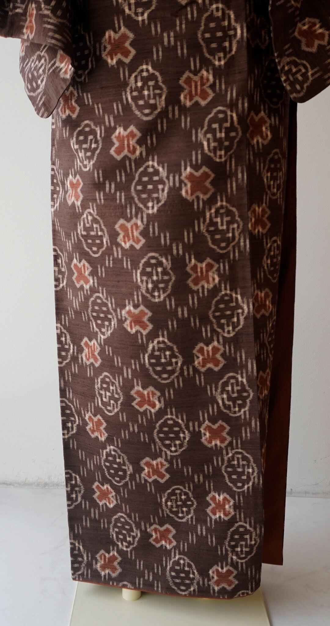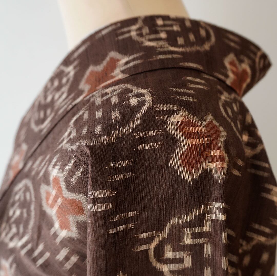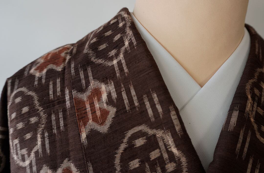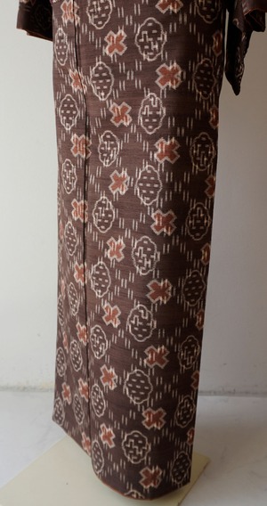 【袷】トールサイズ 黒鳶色地 幾何絣文様 置賜紬 証紙付き
