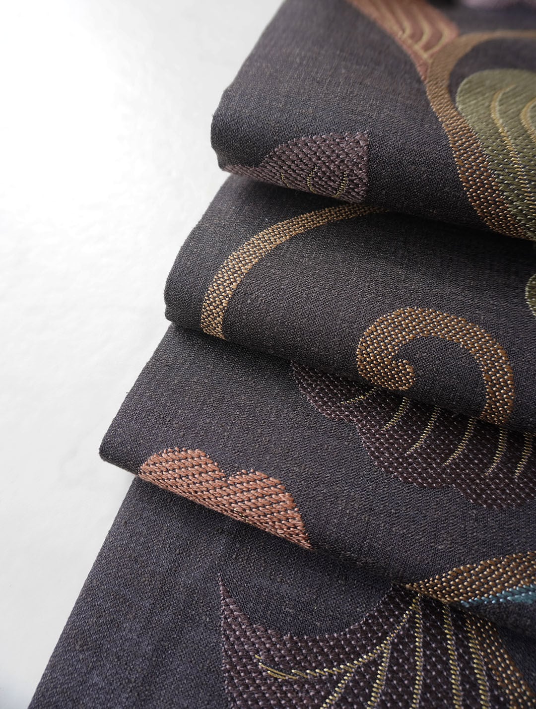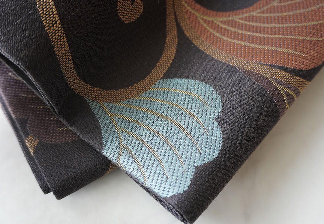 黒鳶色地に唐草文の唐織りの