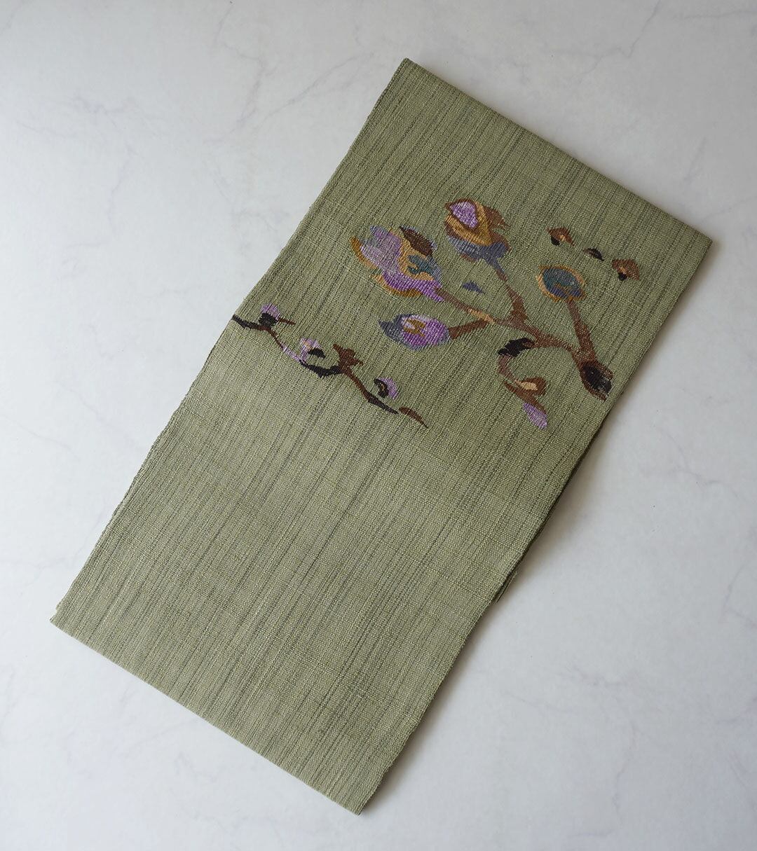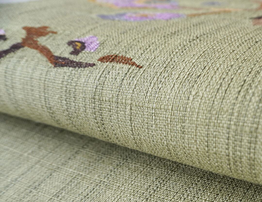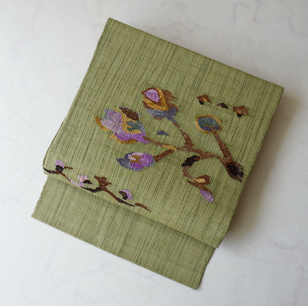 松葉色の紬地に枝花文が織出された