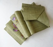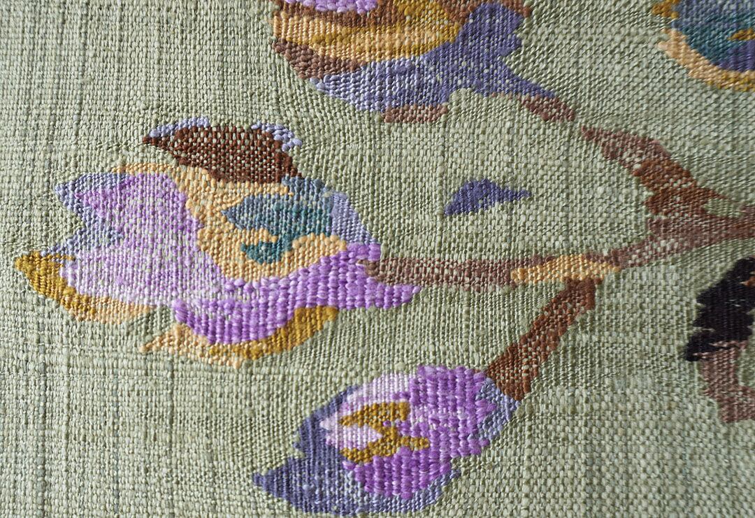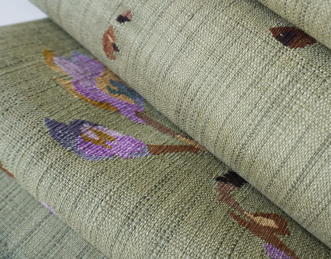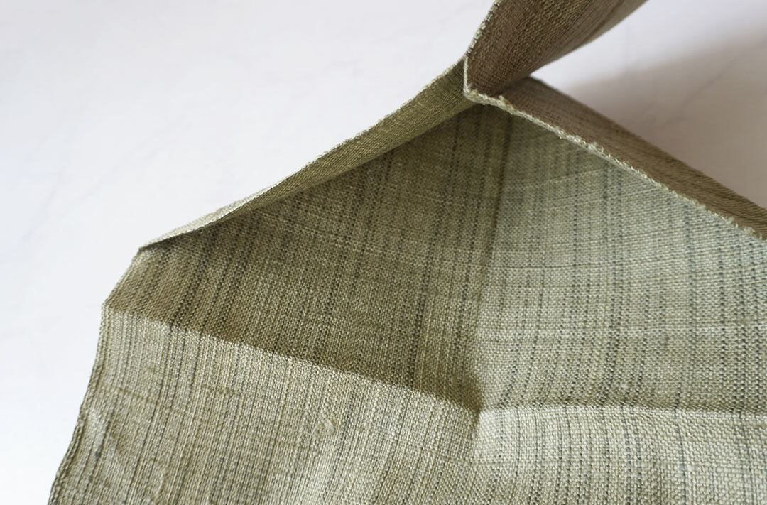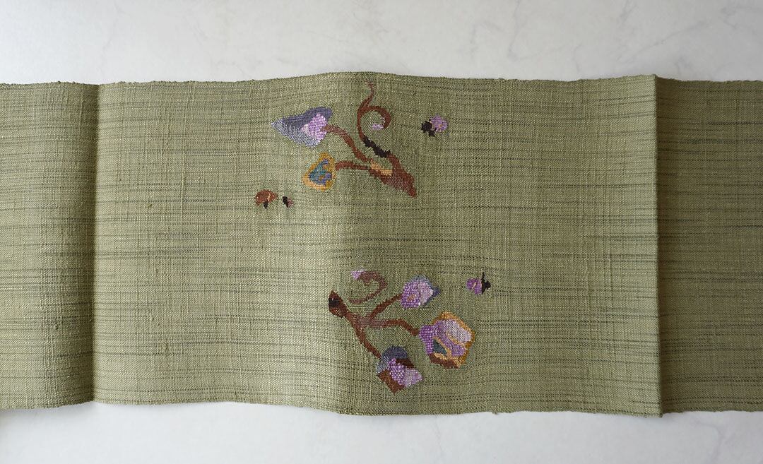 松葉色の紬地に枝花文が織出された