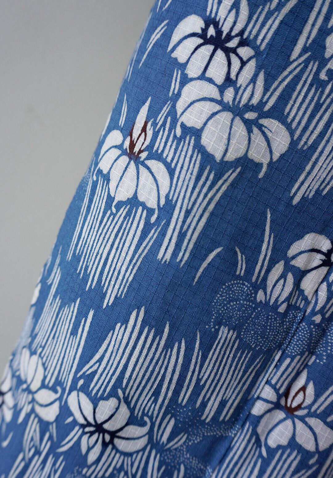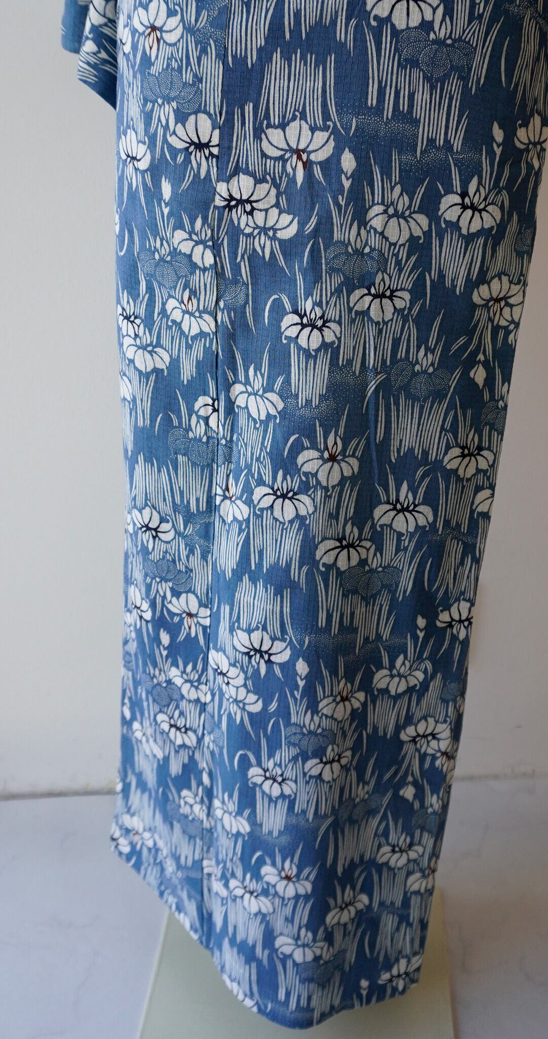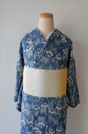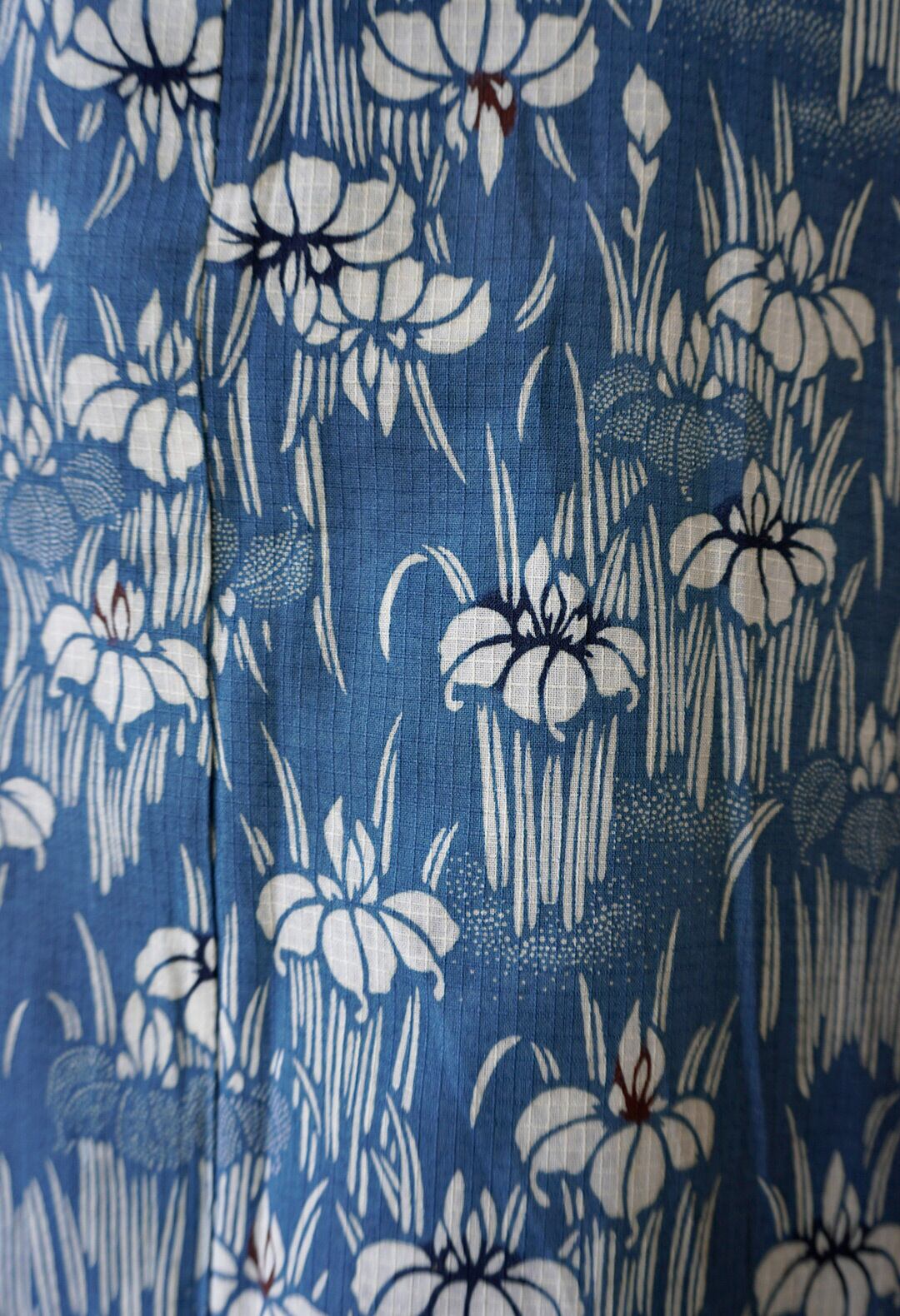 紺鼠色の綿紅梅地に、白の菖蒲柄が全面に
