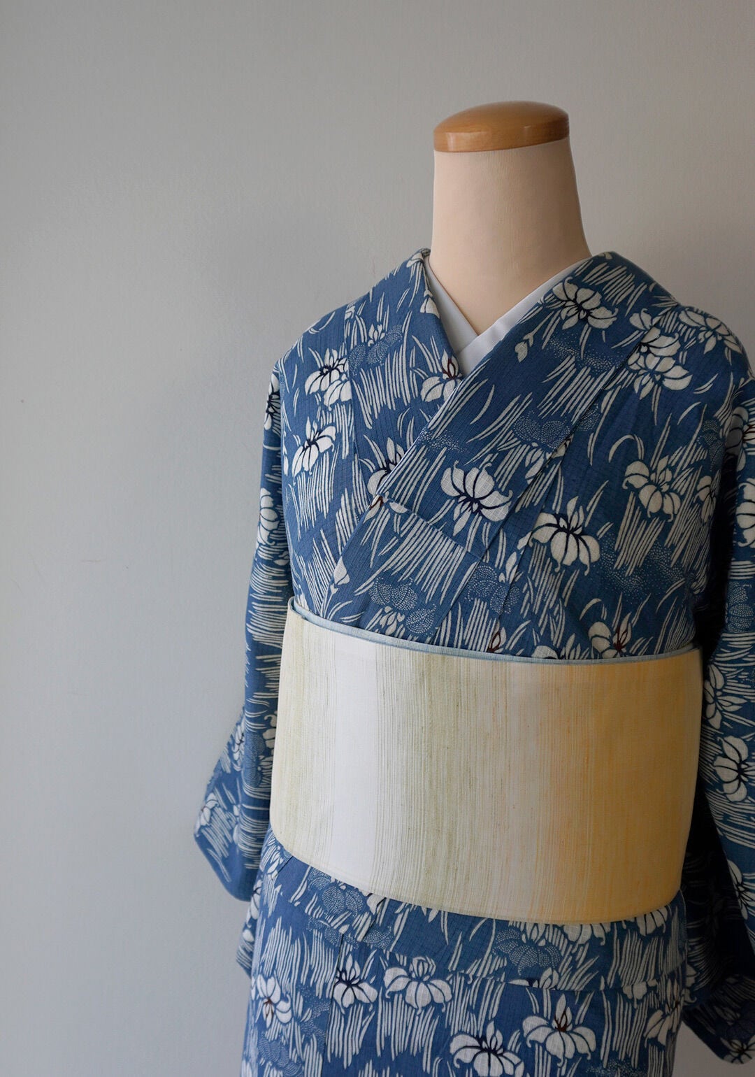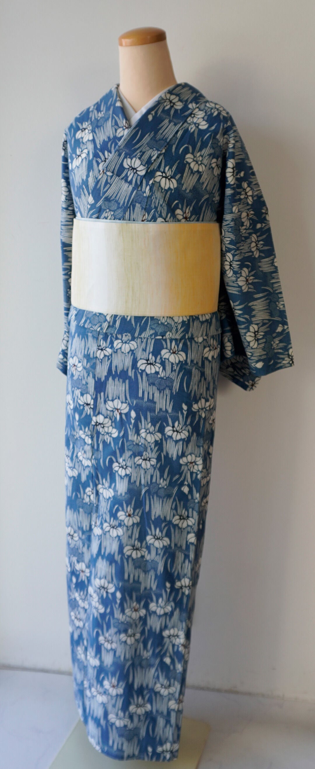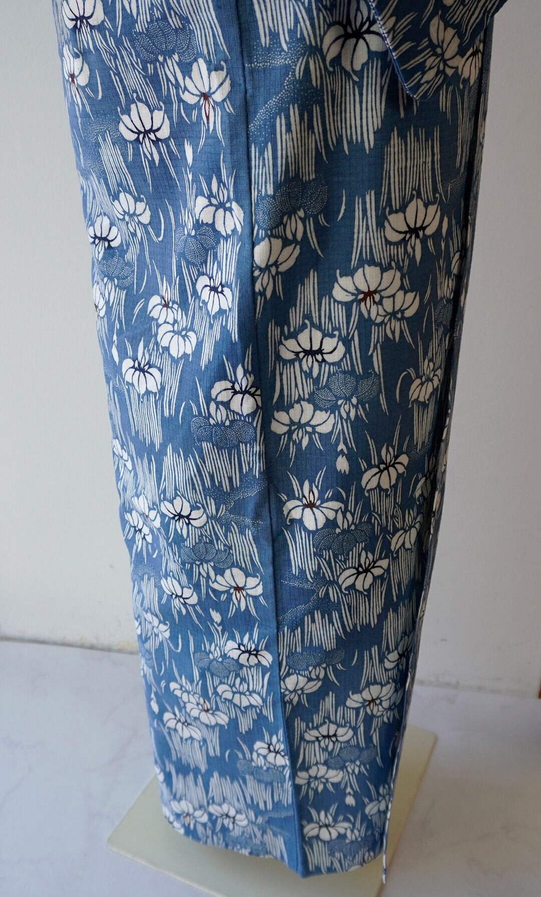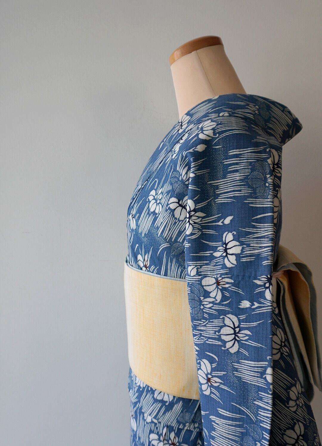 紺鼠色の綿紅梅地に、白の菖蒲柄が全面に