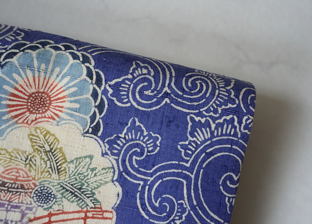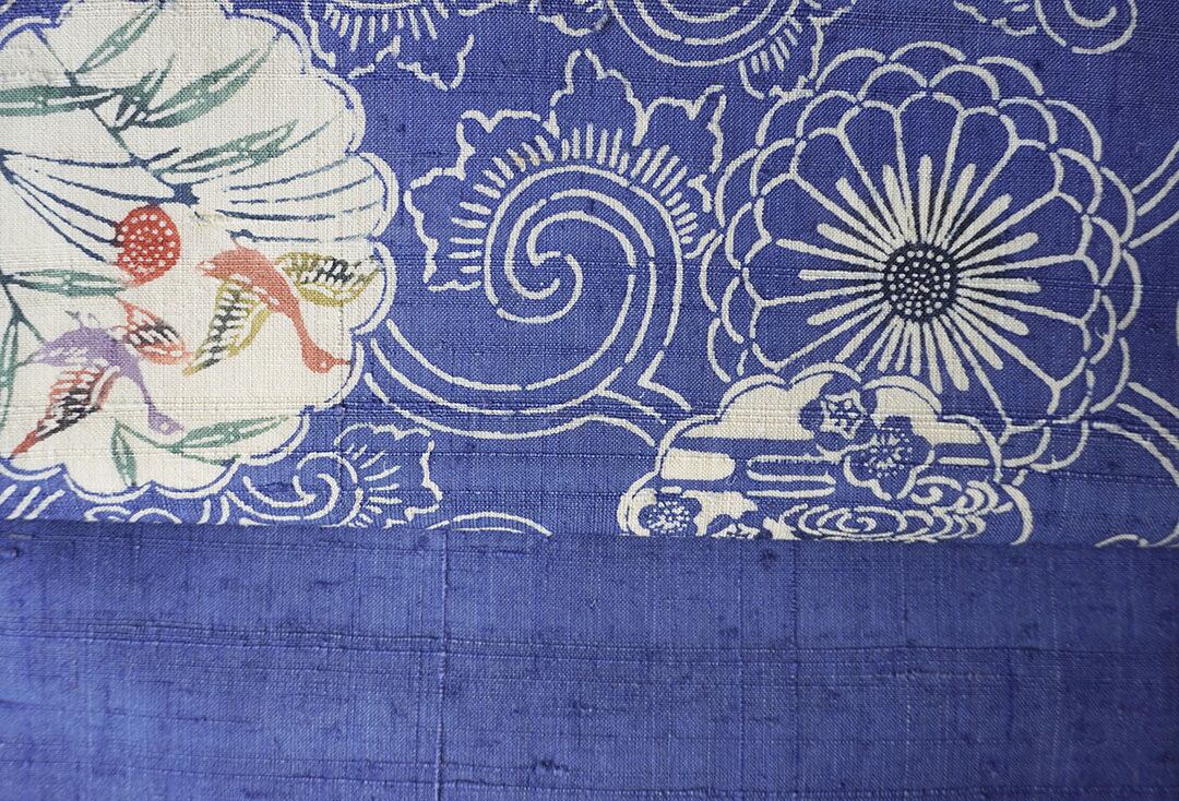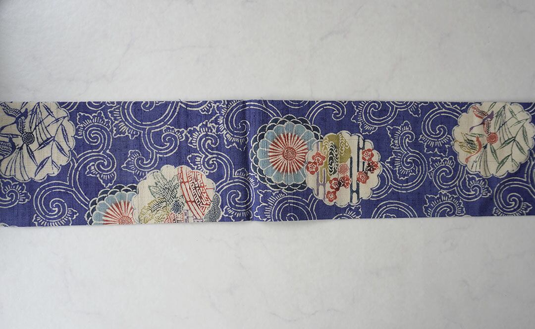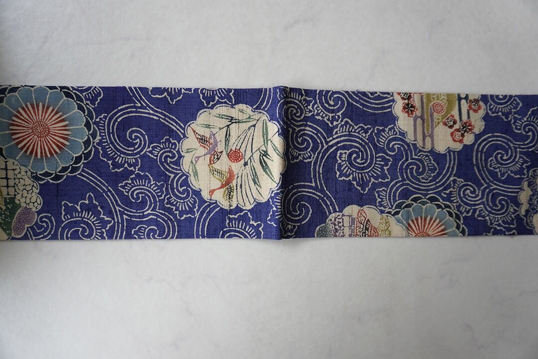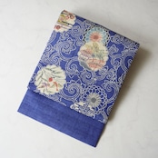【夏・なごや帯】青色地 唐草に花輪と風景柄 夏紬なごや帯
