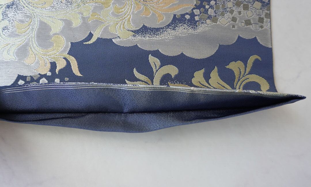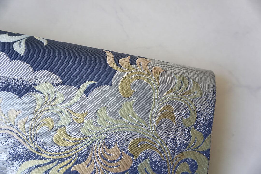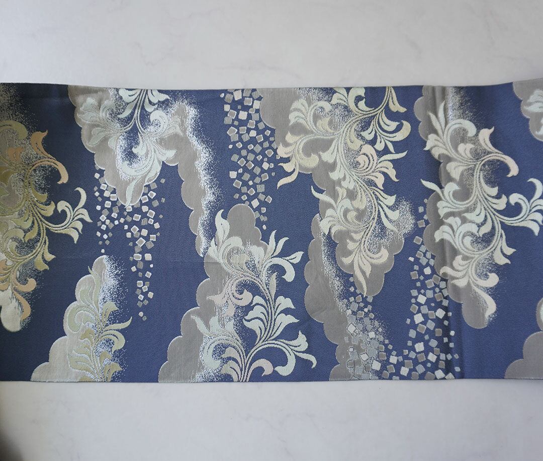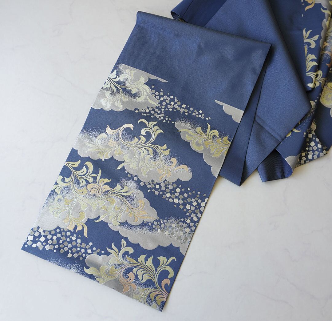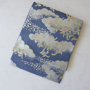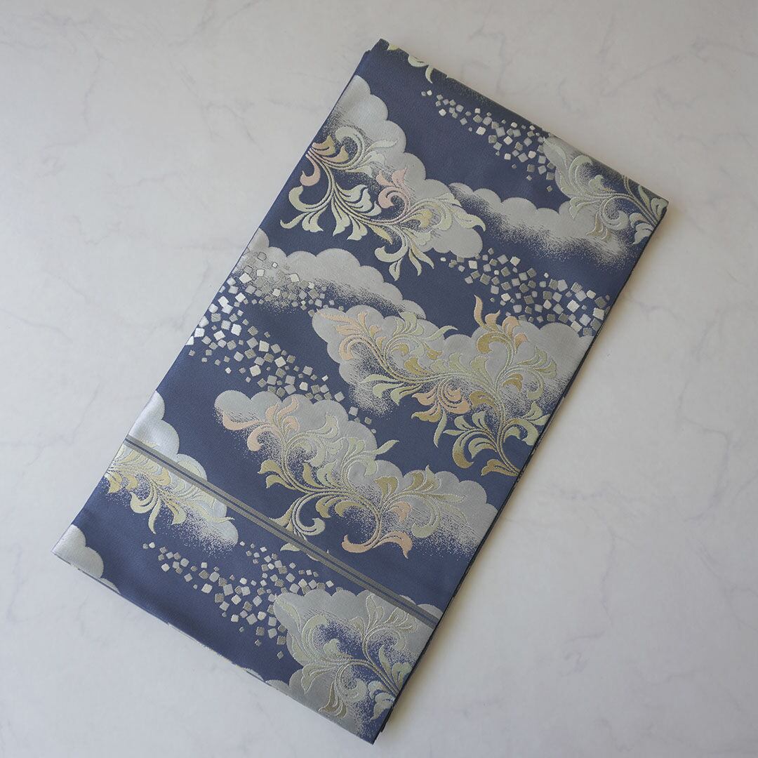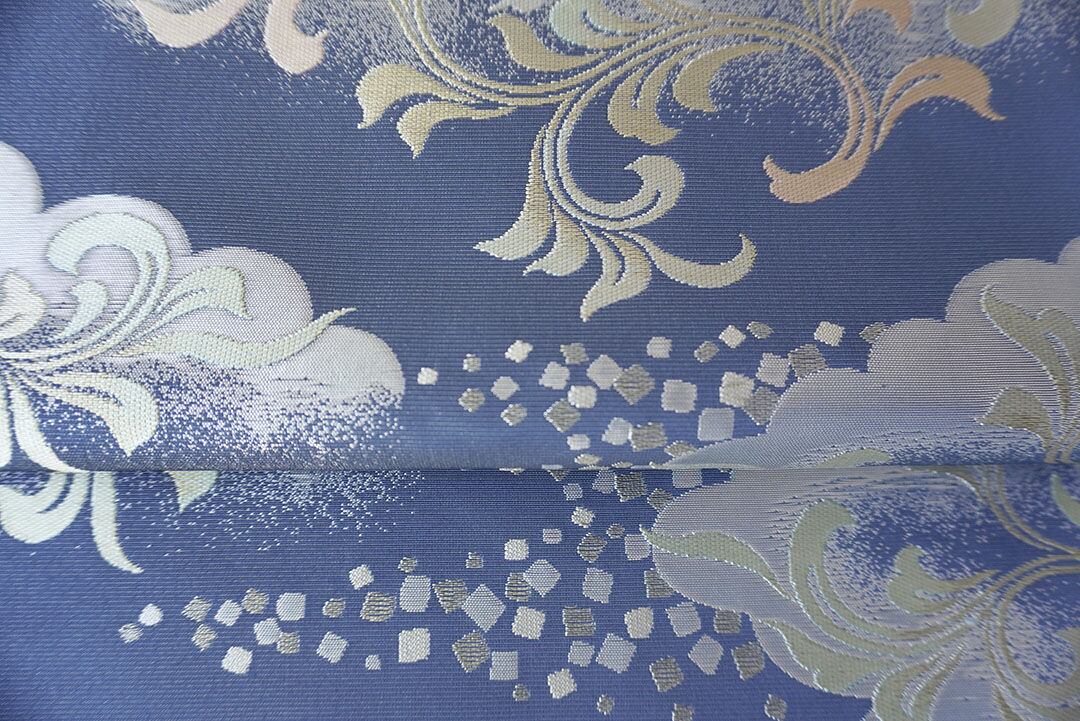 【ふくろ帯】川島織物製 紺鼠地 雲にアラベスクや箔散らし文様 ふくろ帯