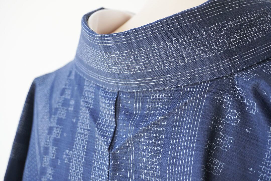 紺色地の幾何学文様の結城紬です。