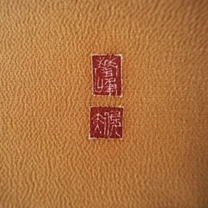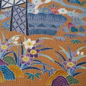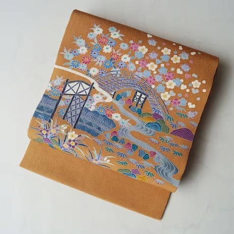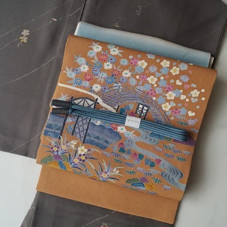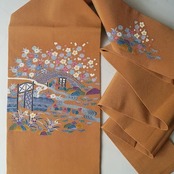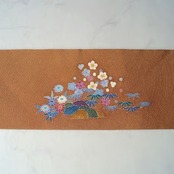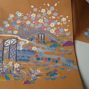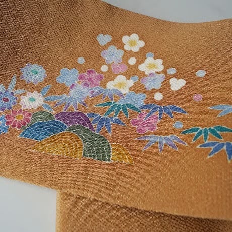 黄茶色地の縮緬に茶屋辻文に四季花の