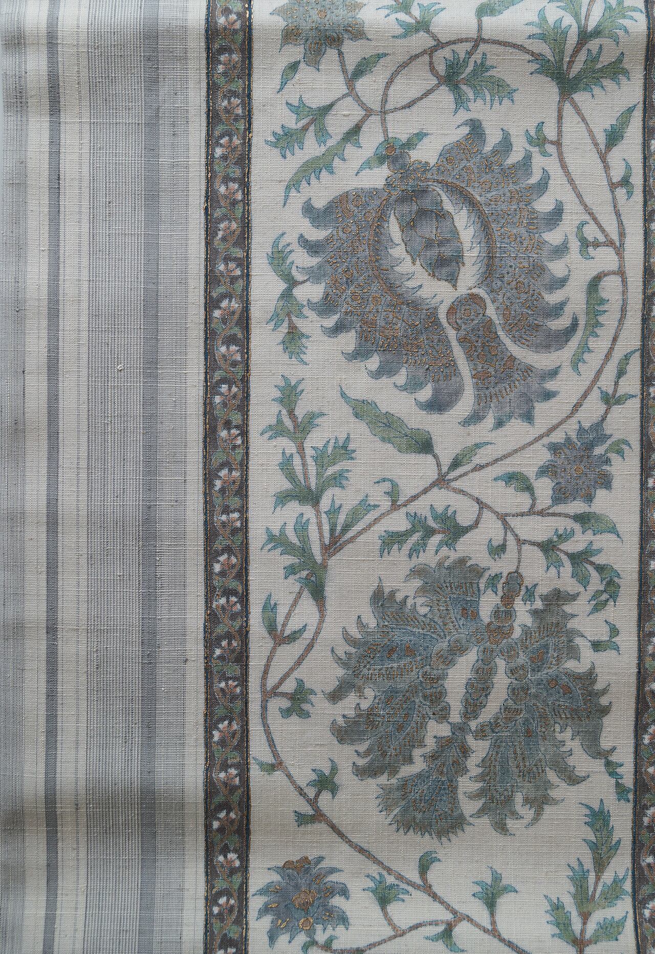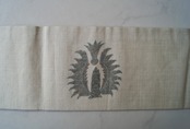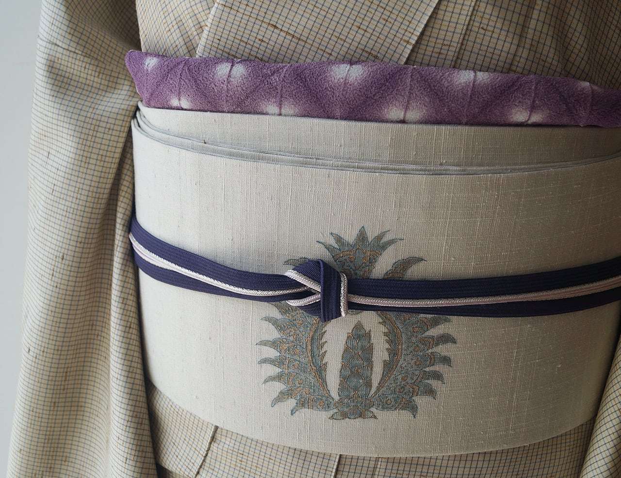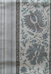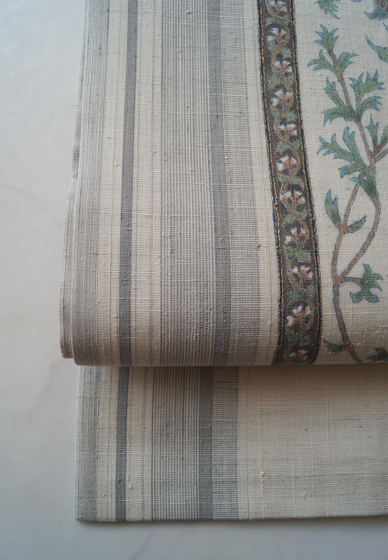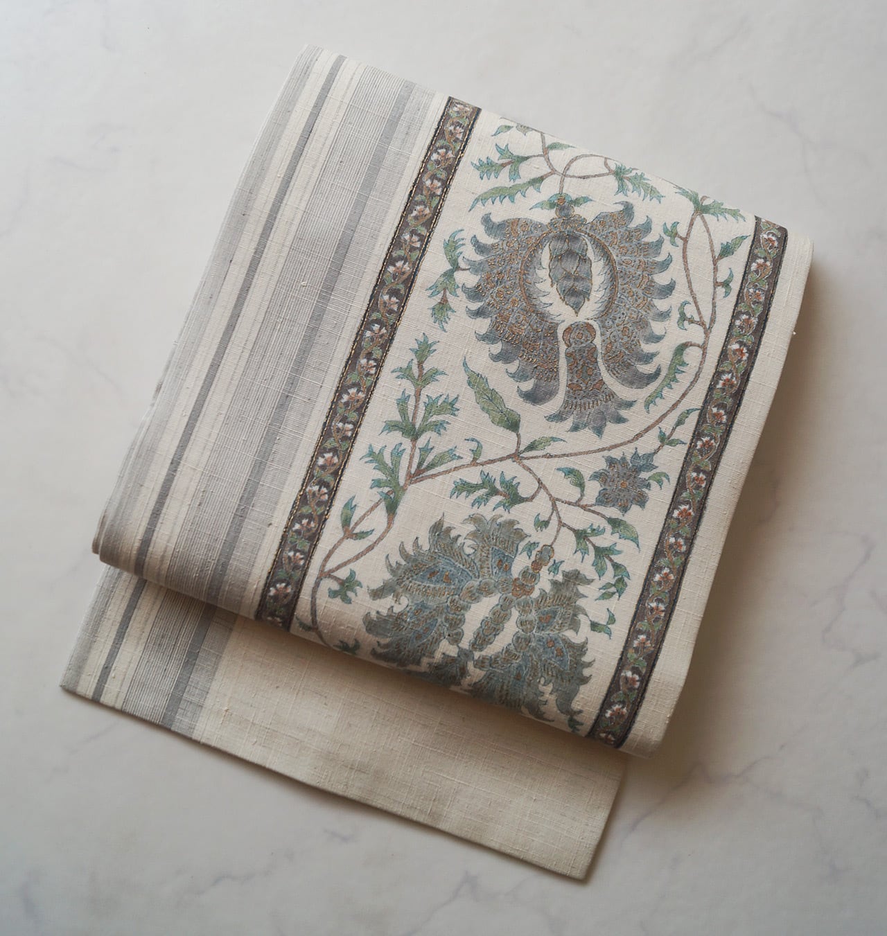 生成り地に縞に更紗文の紬地なごや帯です。