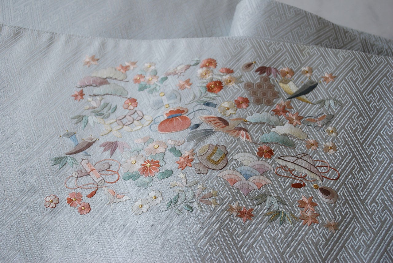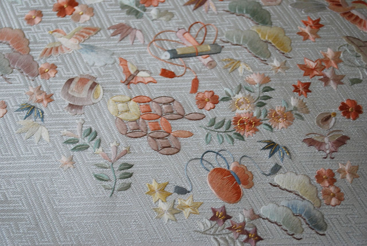 お太鼓と帯前にはなんとも可愛らしい宝尽くしの手刺繍。