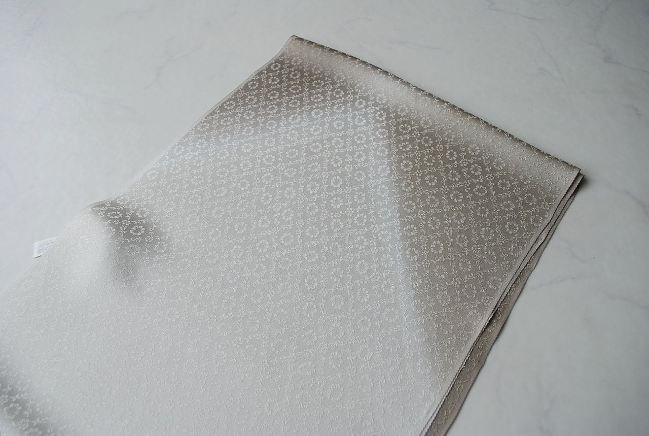華唐草の斜め格子文の中央に華が一つ配された地紋の帯揚げ。