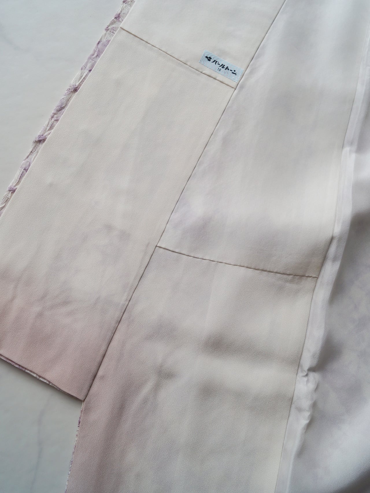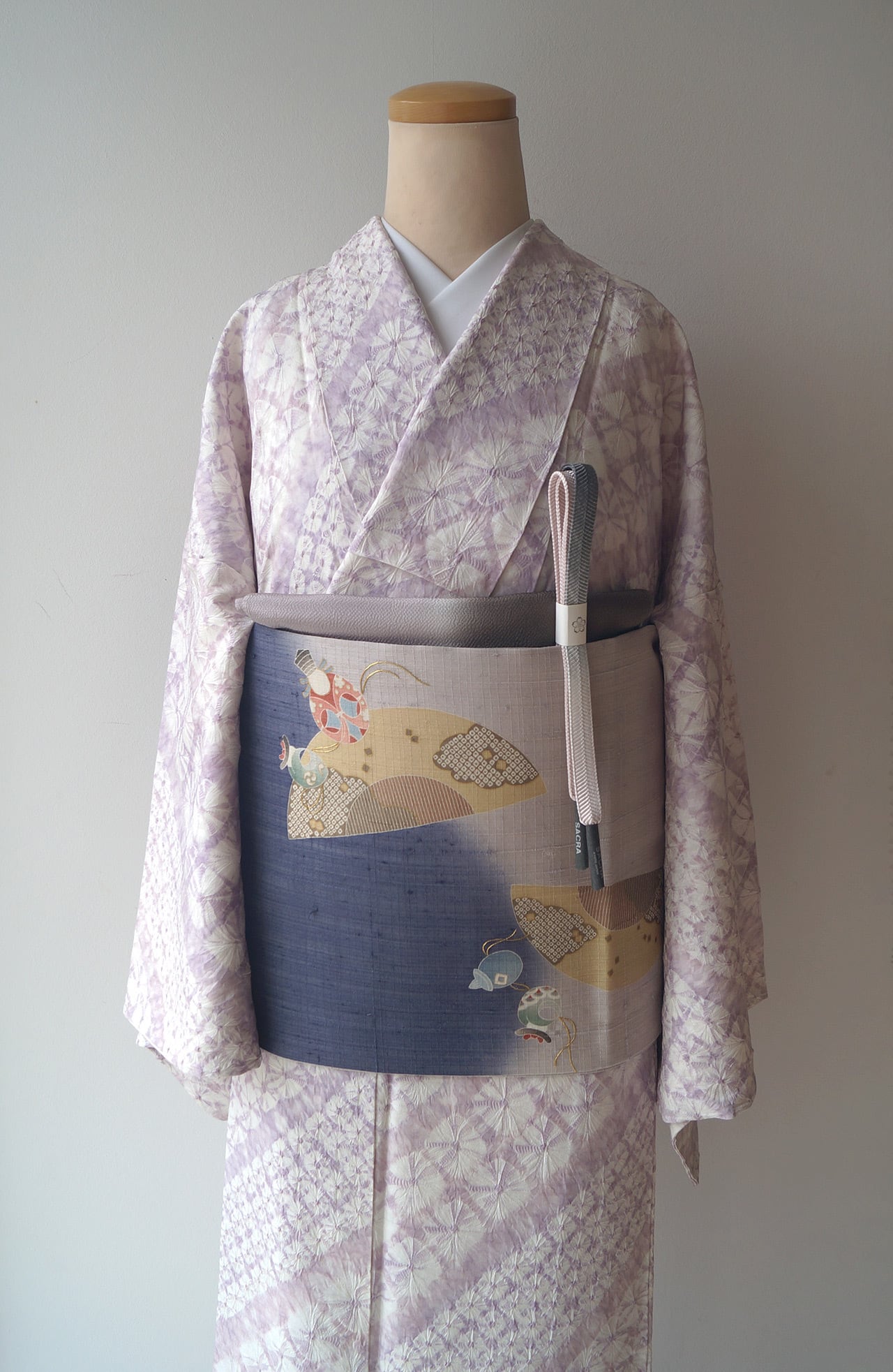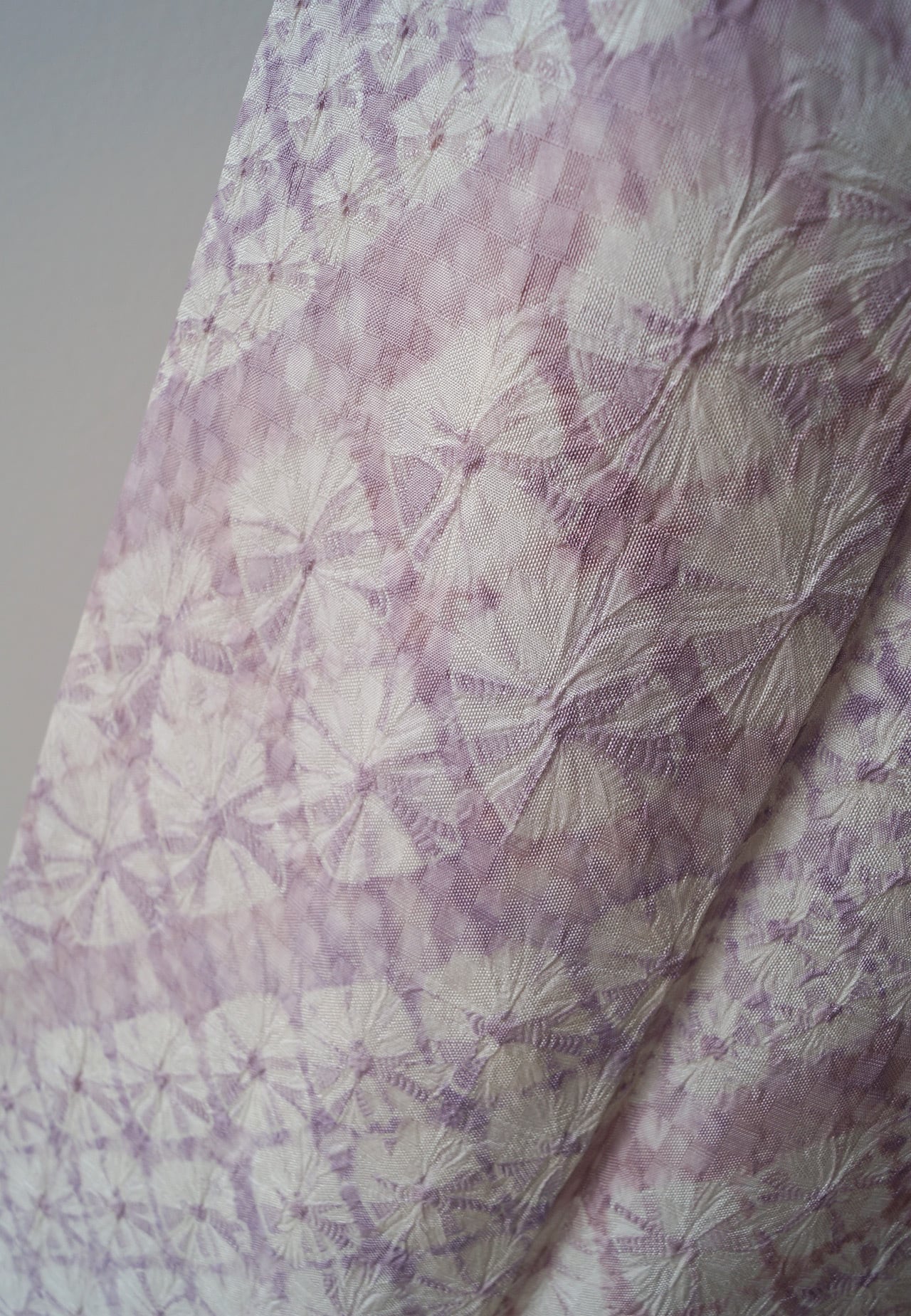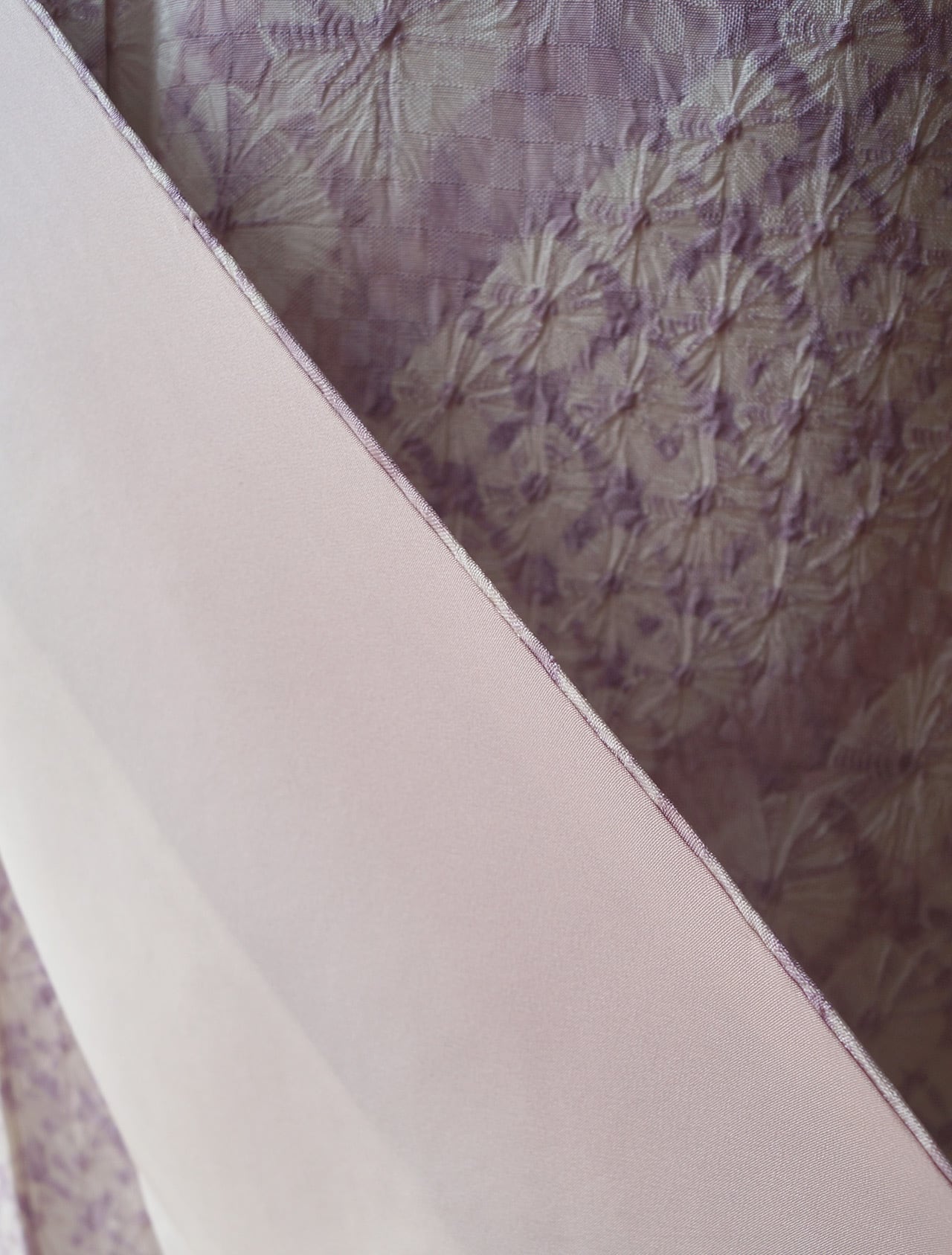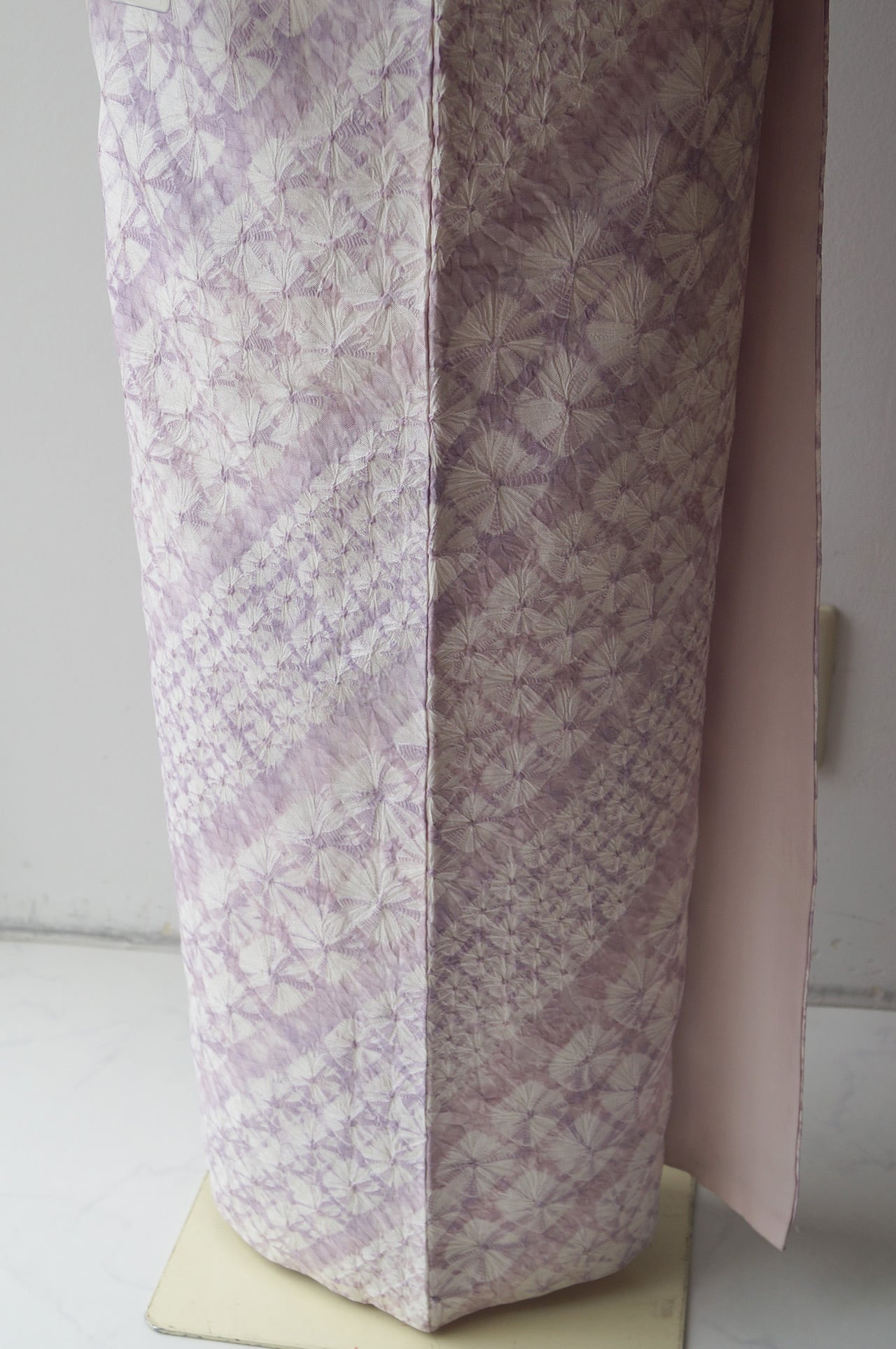 【袷】紅藤色×胡粉色 斜め手蜘蛛絞り柄 小紋 トールサイズ