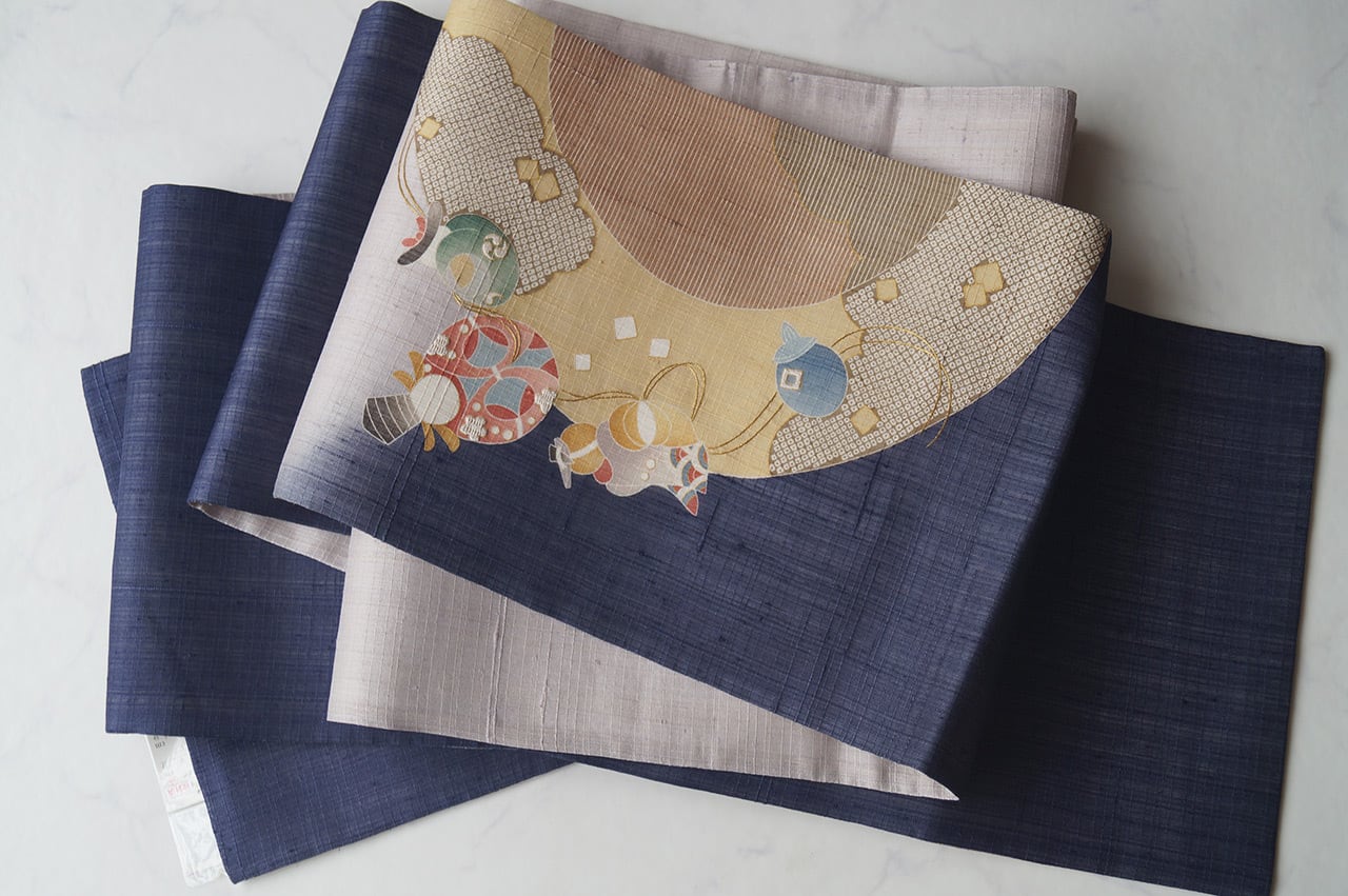 【ふくろ帯】灰紺地 櫛と玩具柄 しょうざん ふくろ帯