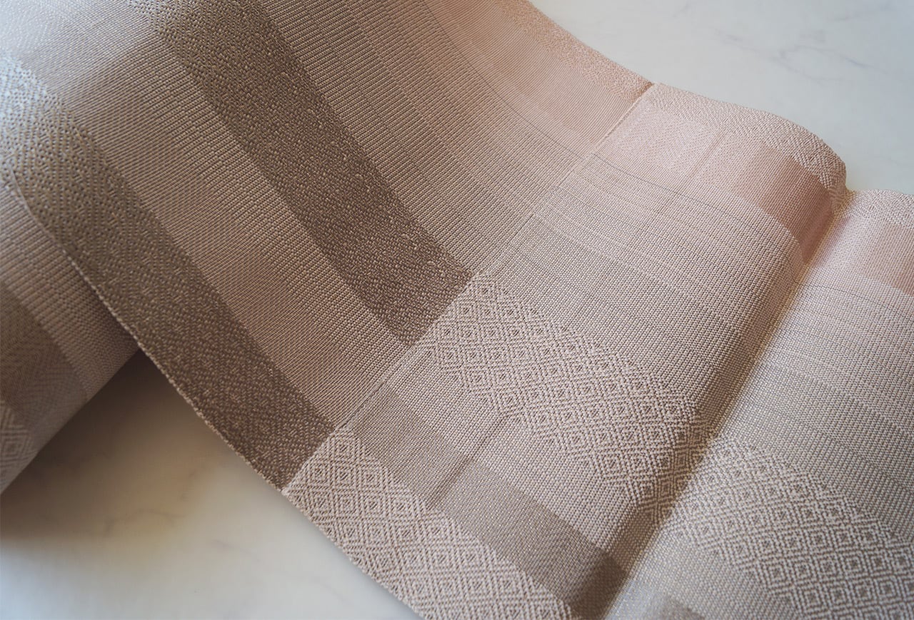 【なごや帯】手織り 灰梅色ランダム縞 なごや帯 長尺