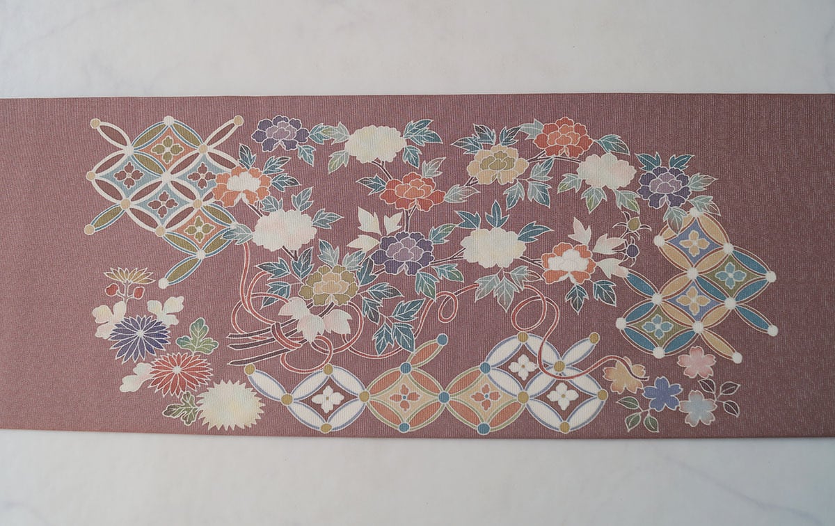 【なごや帯】退紅色 四季花に吉祥文 なごや帯