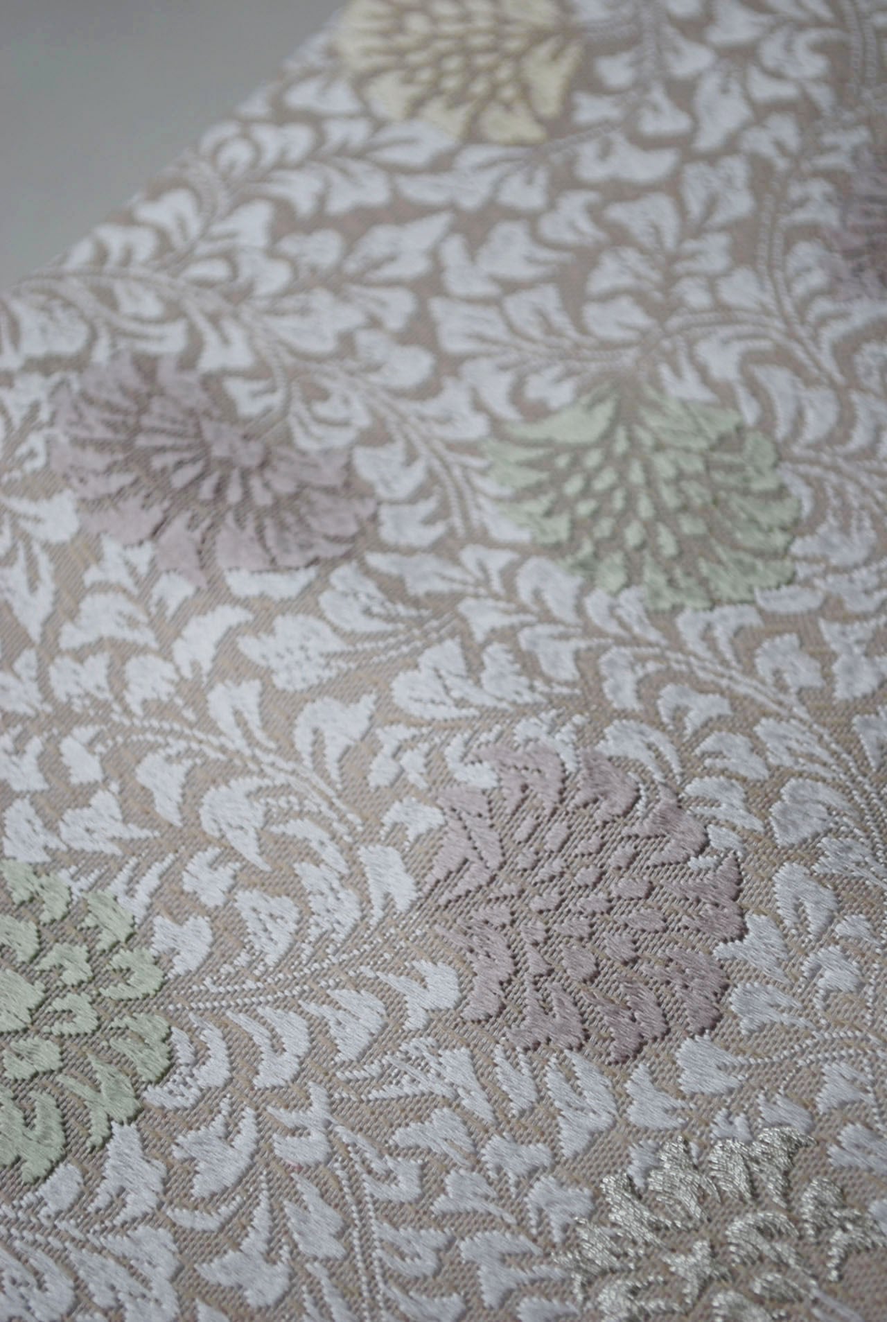 【なごや帯】西陣・ふくい製 ベージュ地淡色合わせ 華草文唐織なごや帯