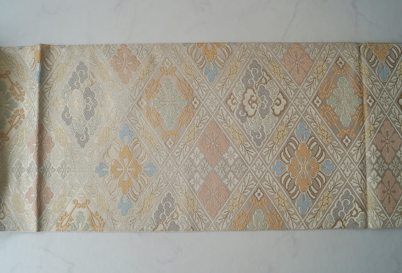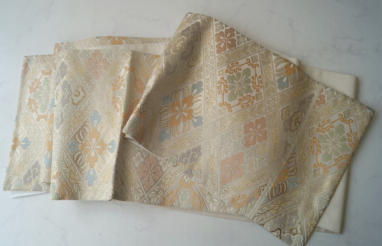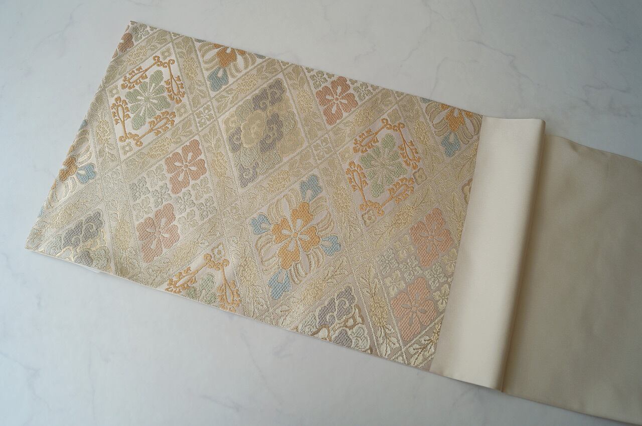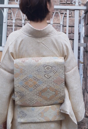 浅黄色に花菱文様ふくろ帯です。
