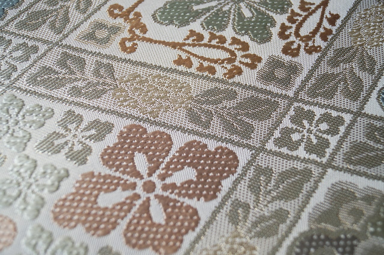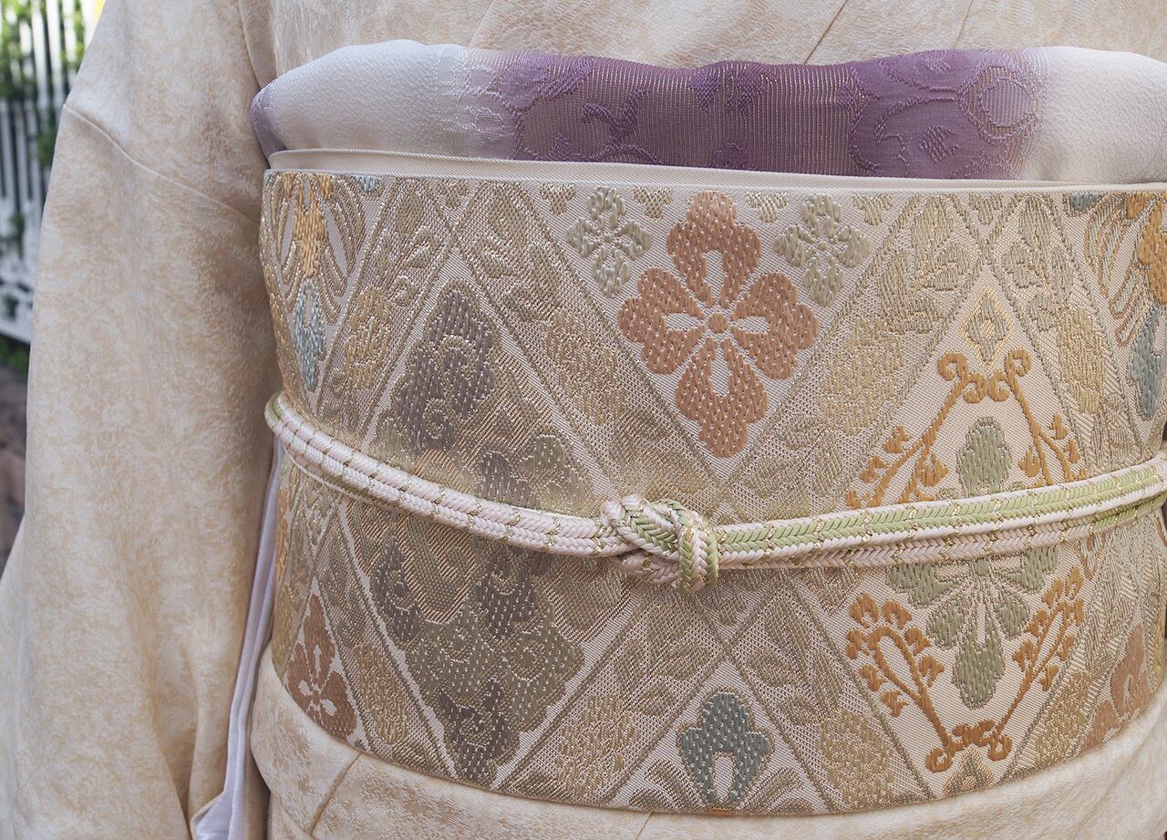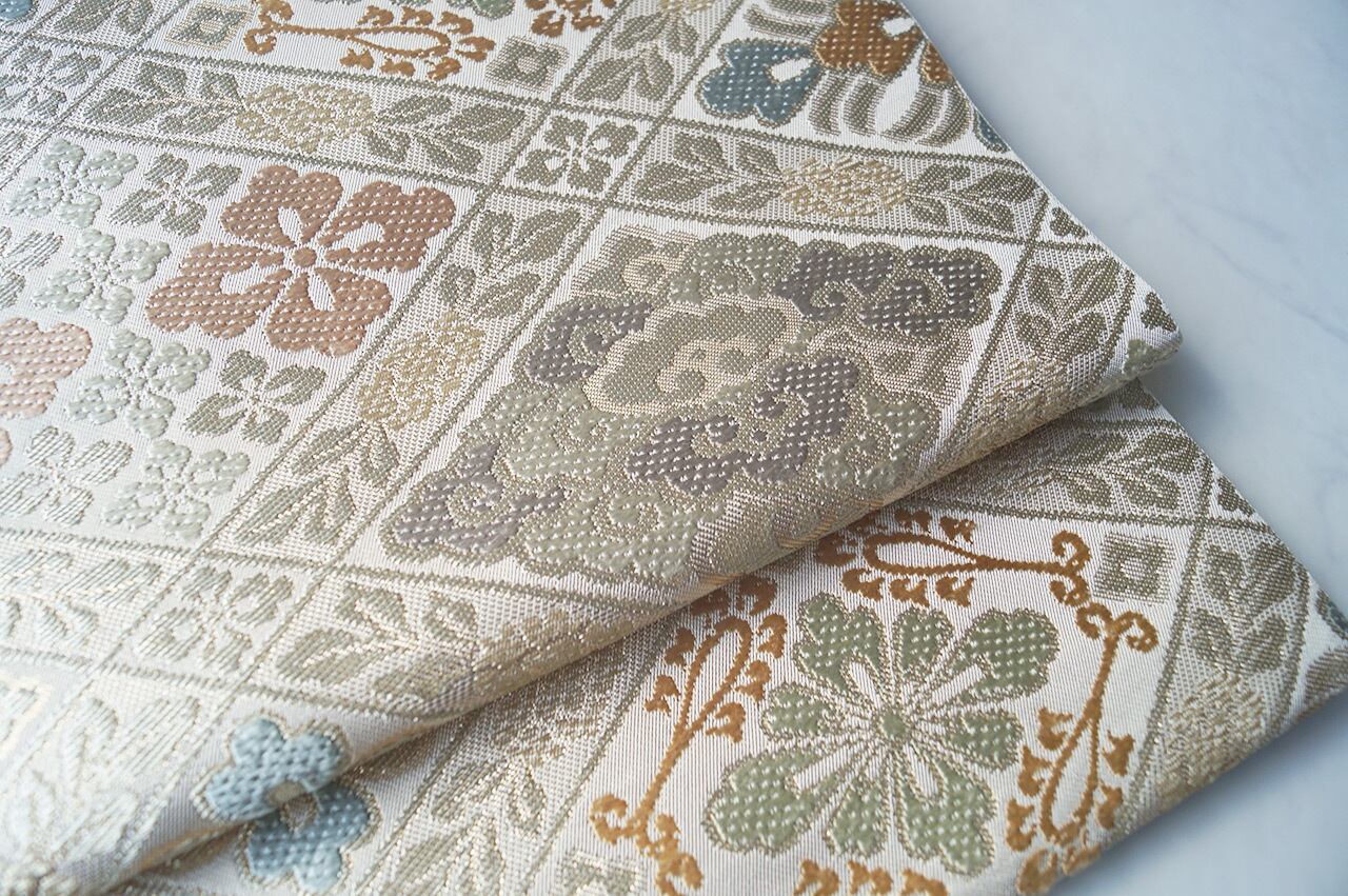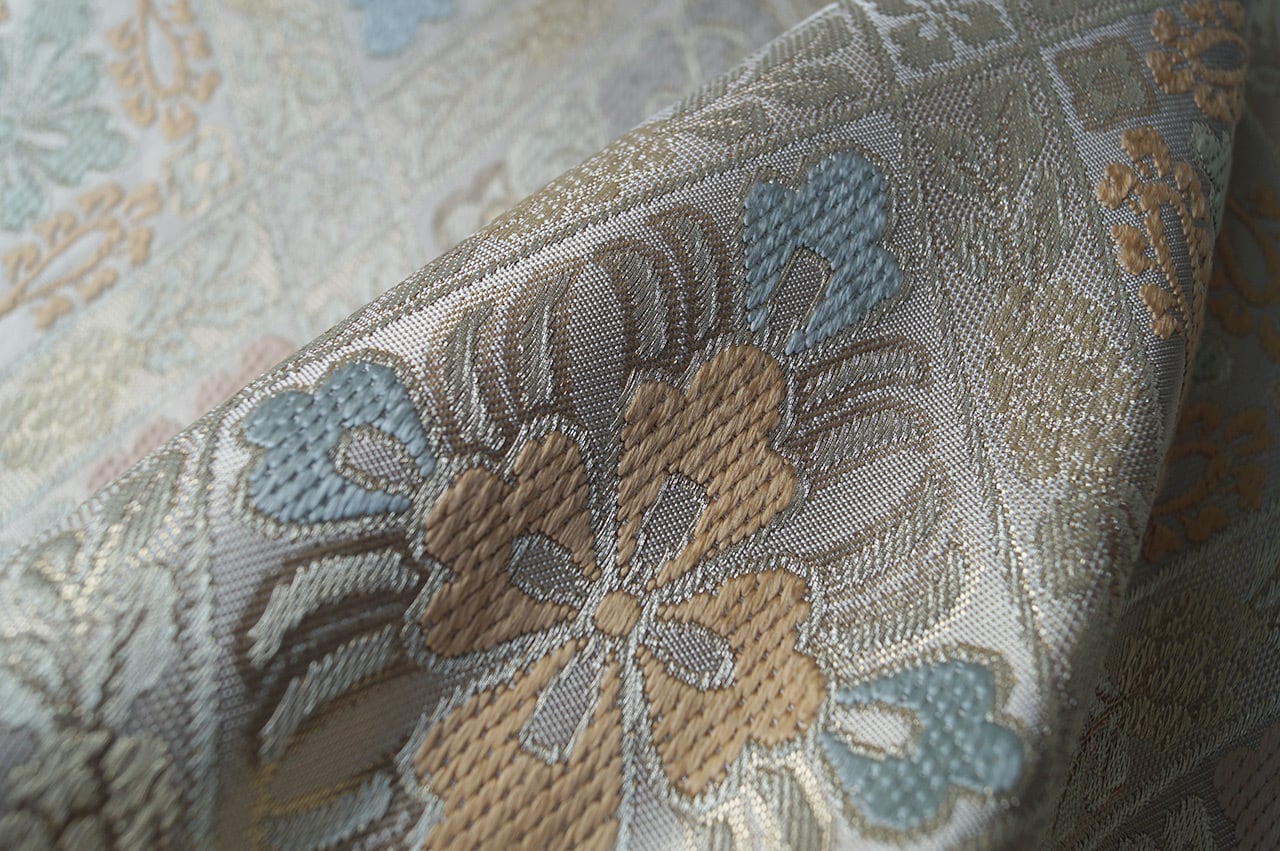 帯地の浅黄色の光沢と、花菱文に