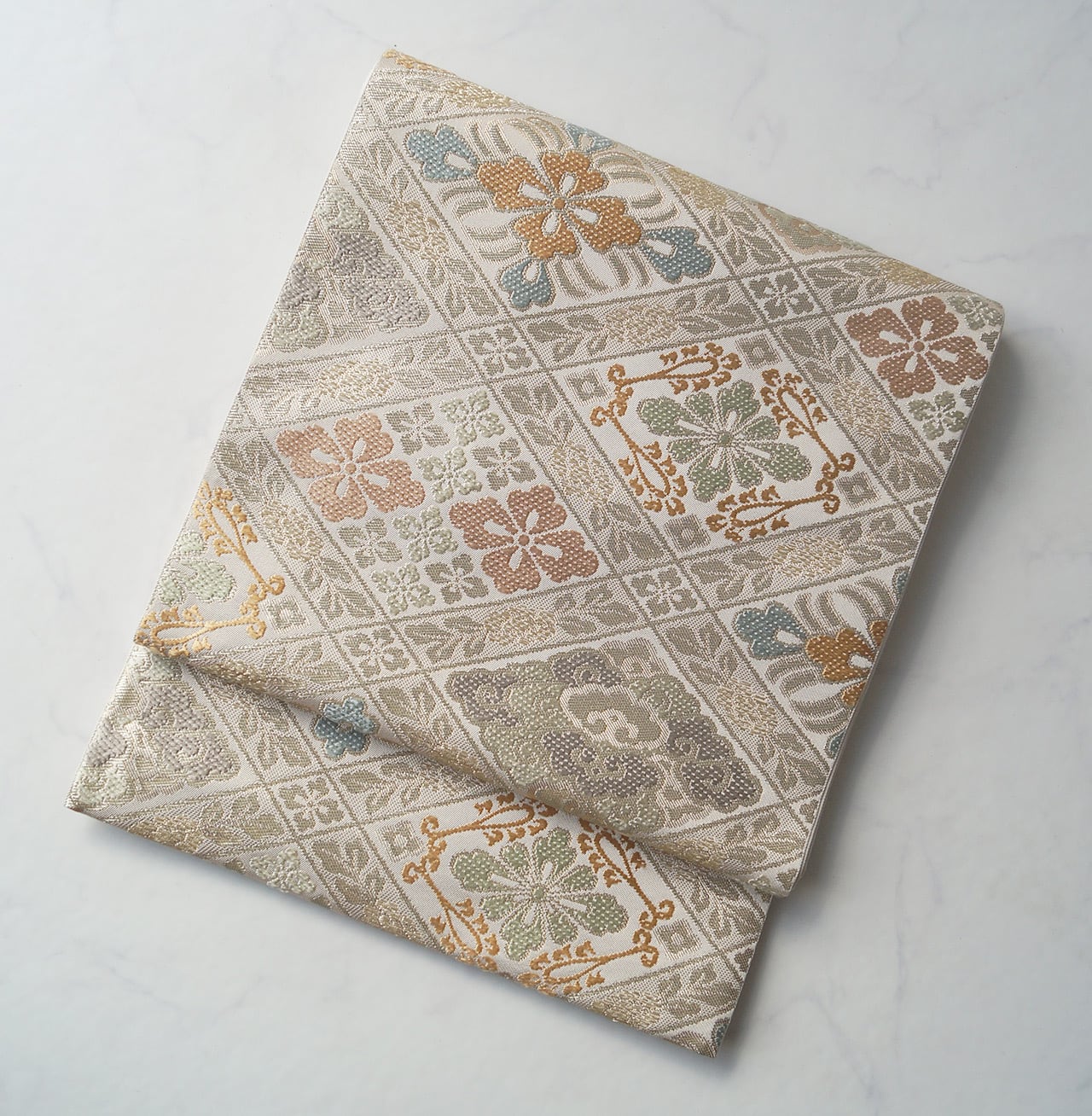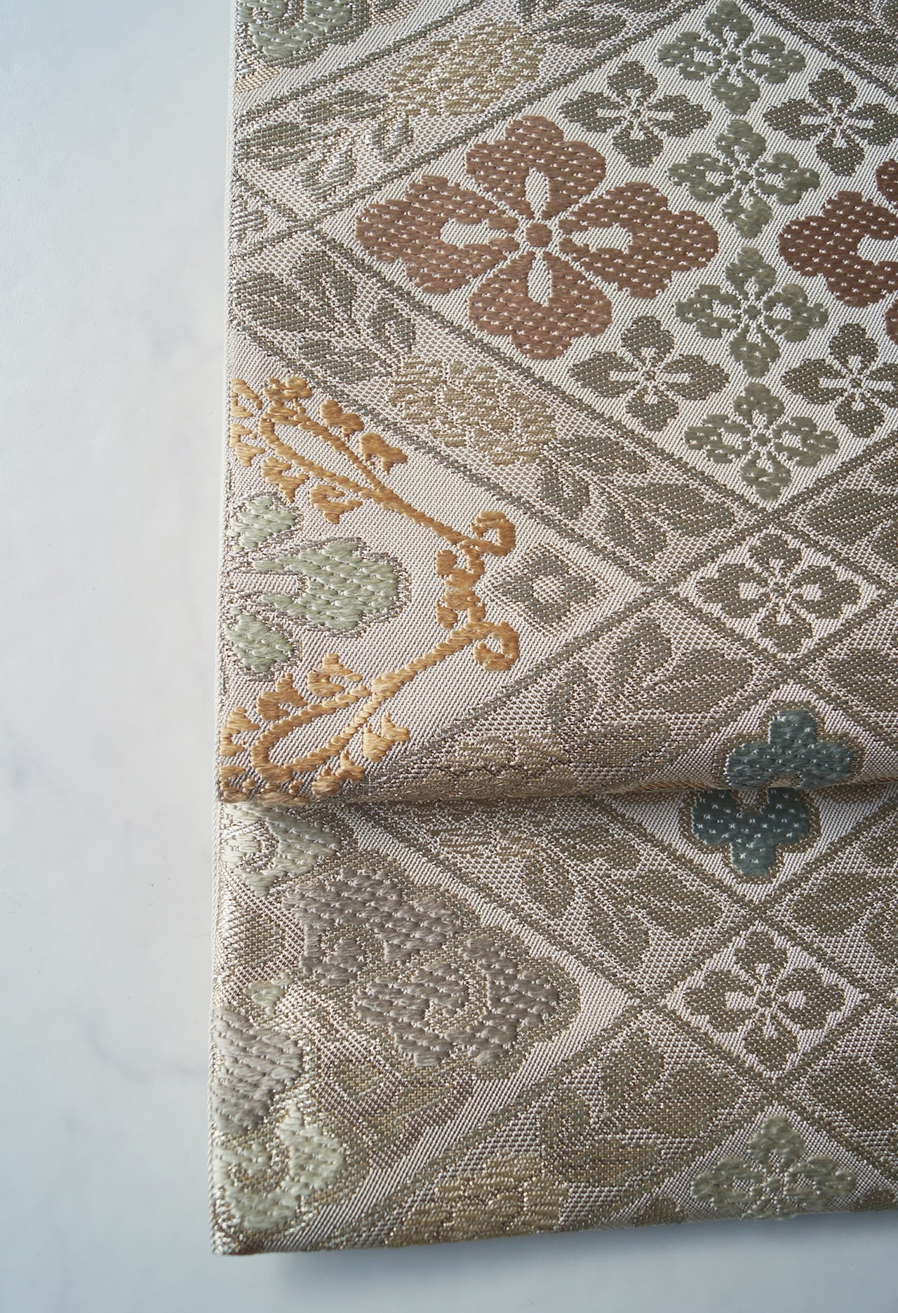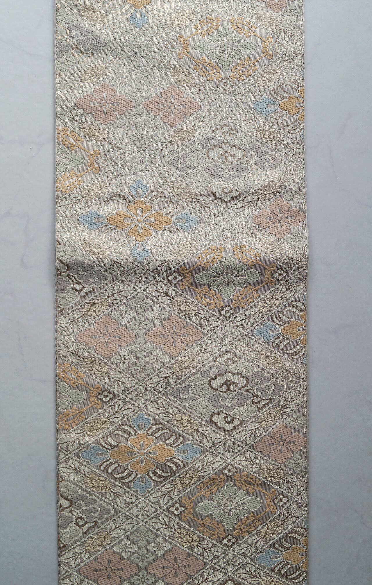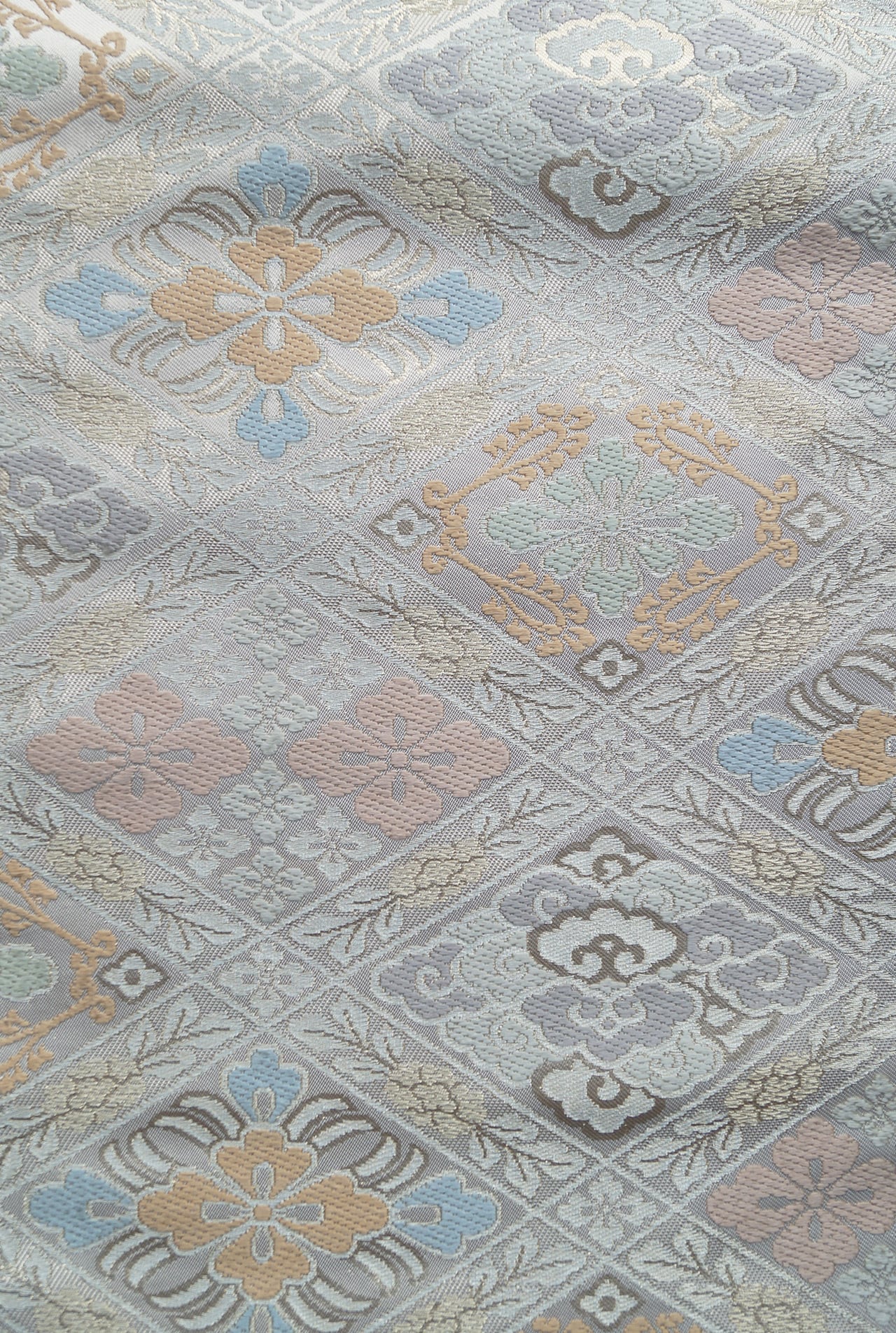 帯地の浅黄色の光沢と、花菱文に