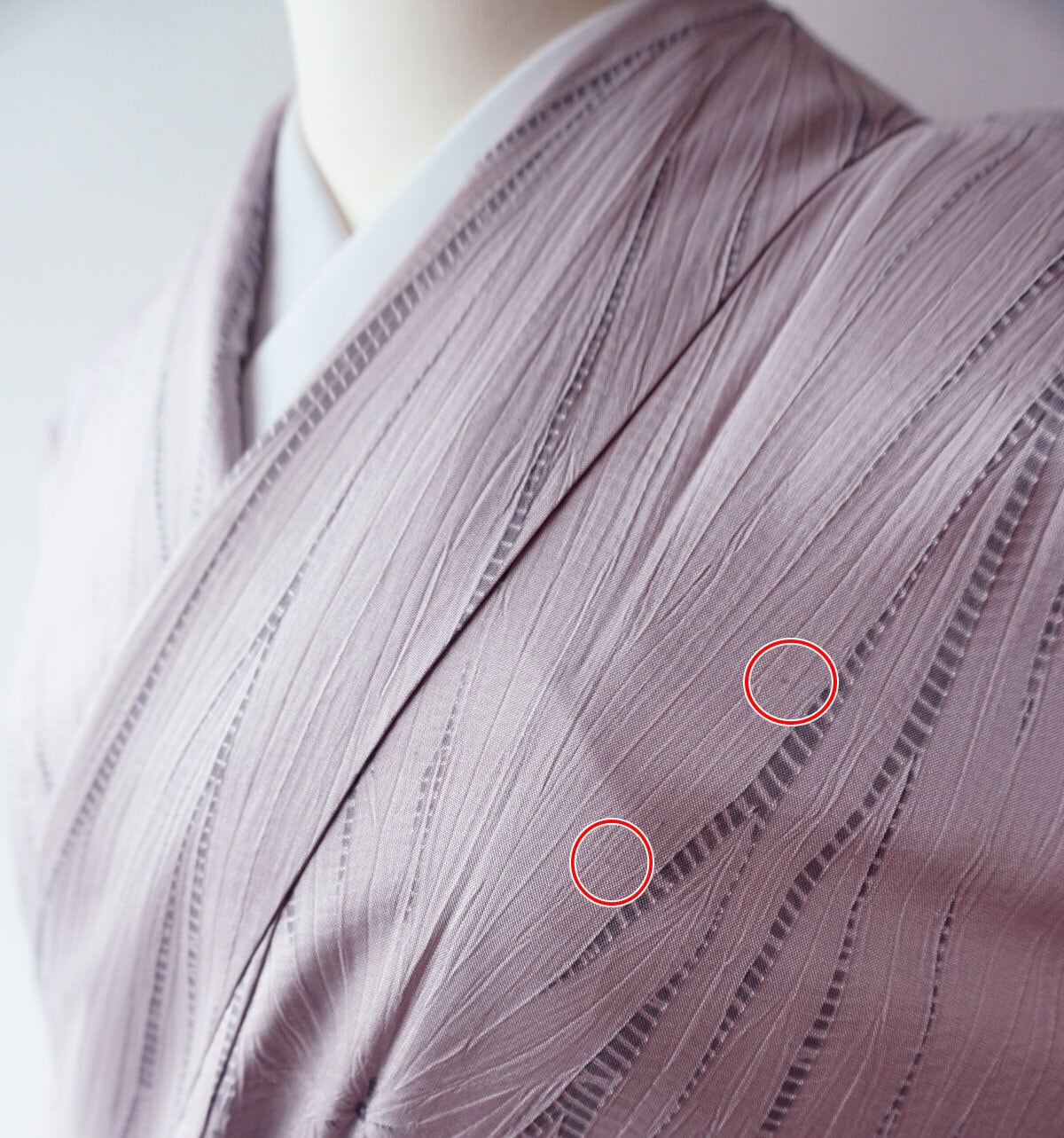 ・衿付近に数か所シミがあります(写真15.16)