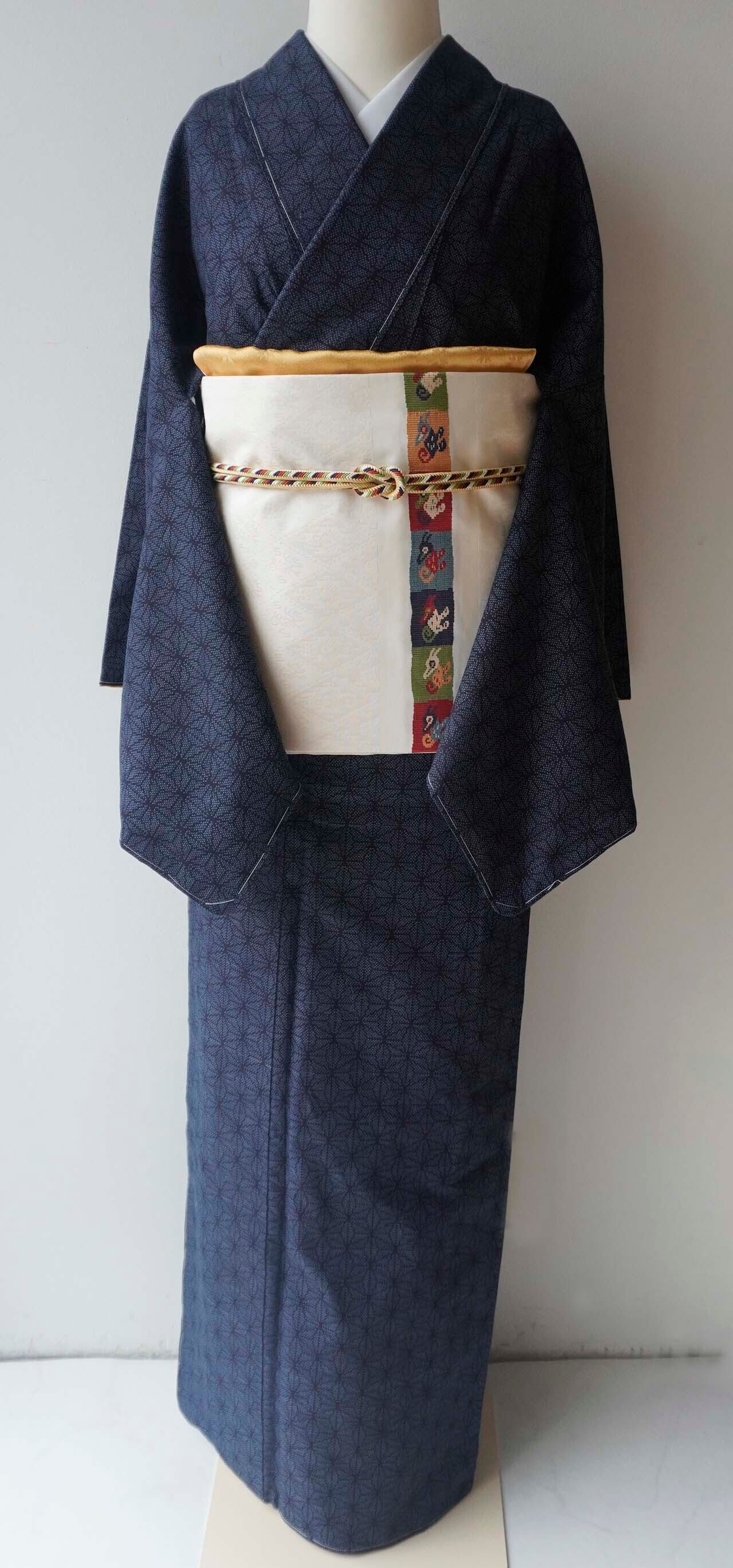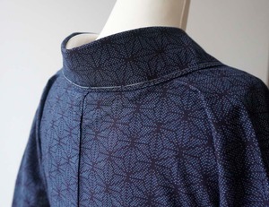 【袷】藍色地 綿薩摩 麻の葉文 紬