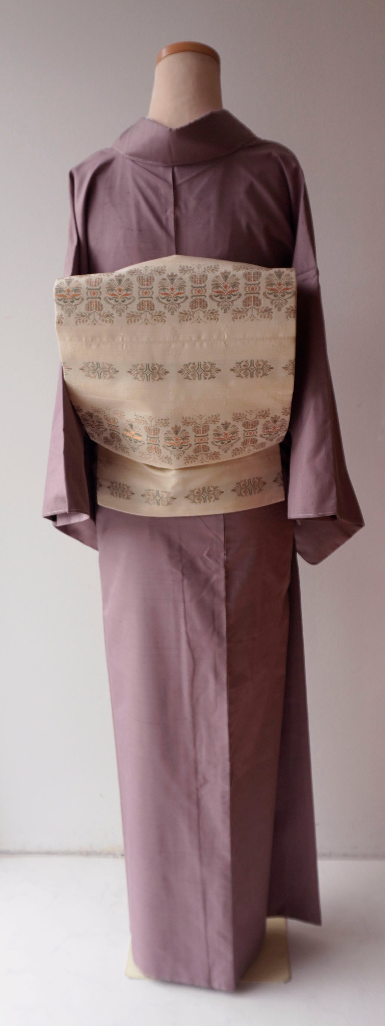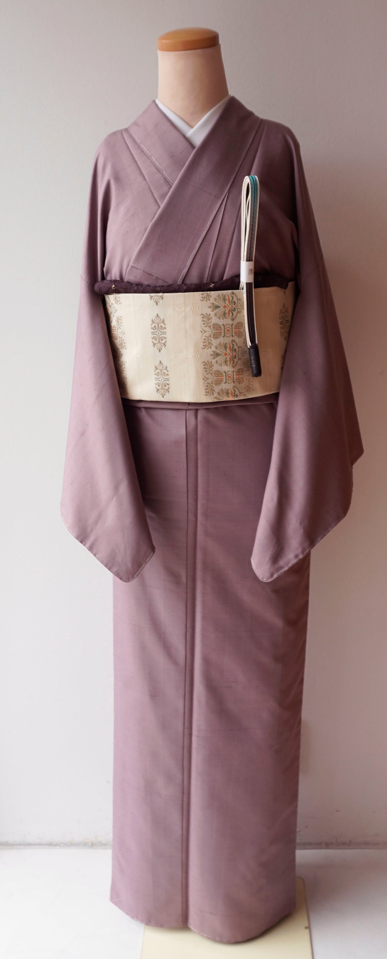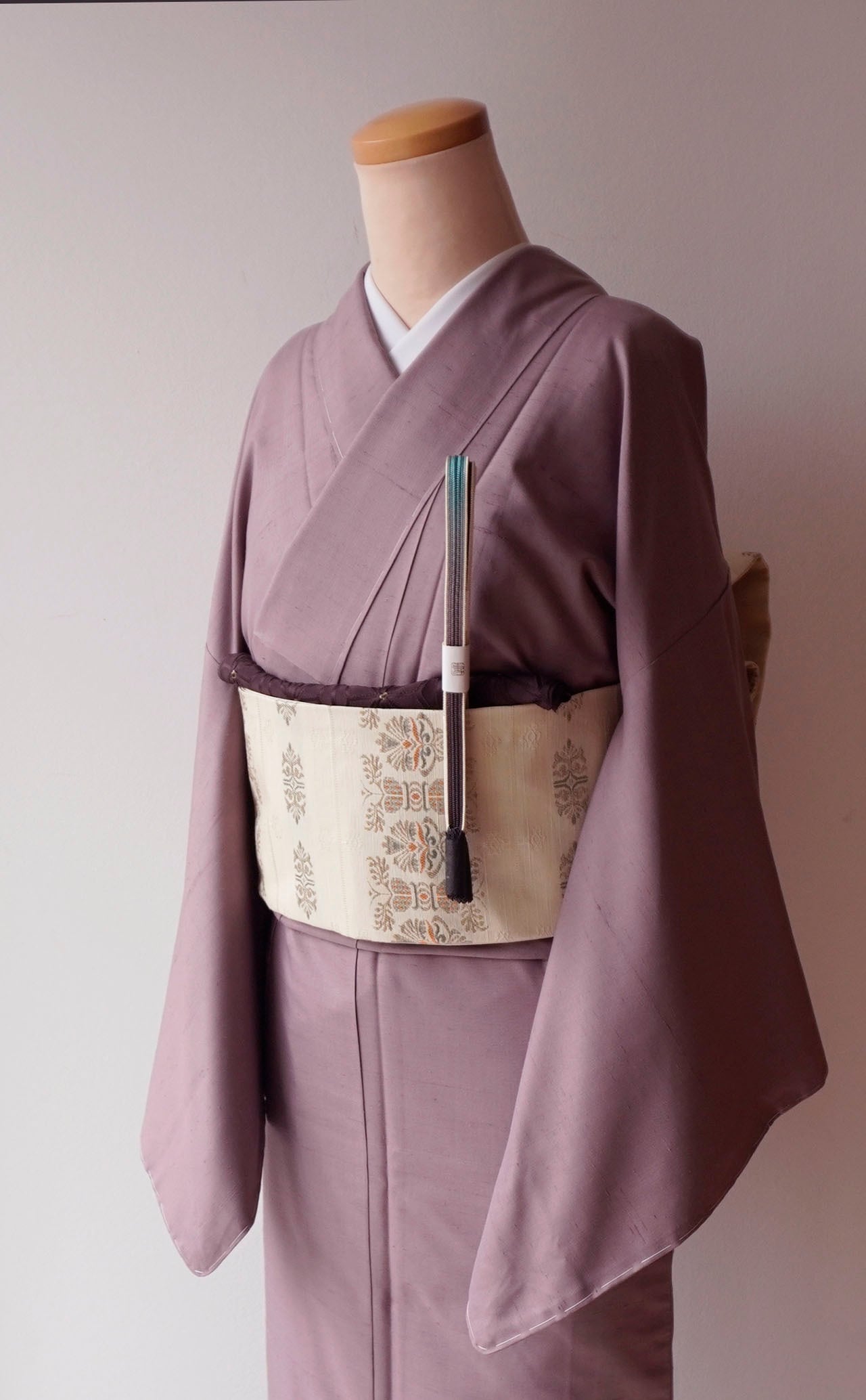 灰味がかった淡い赤紫系のお色の無地紬です。