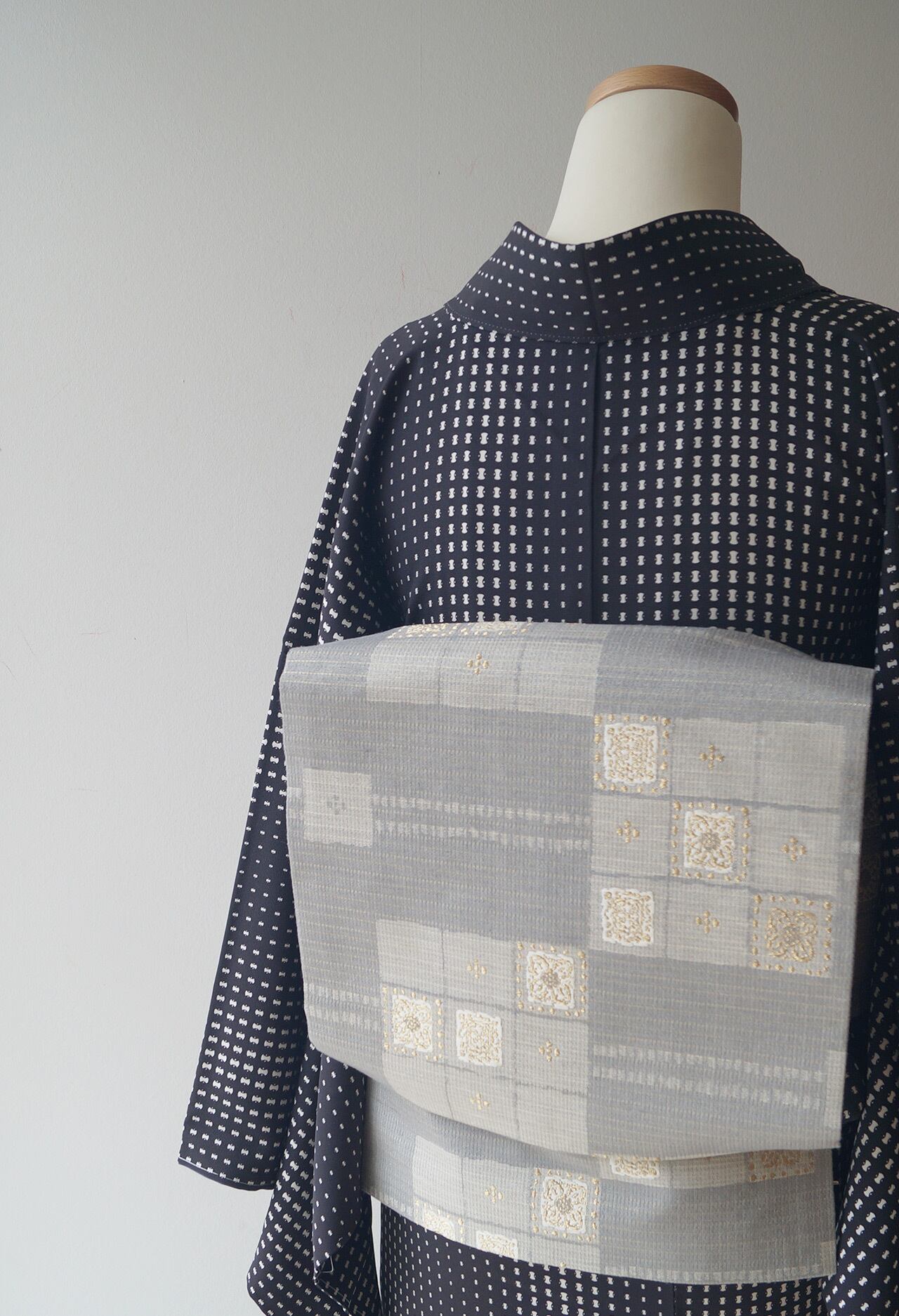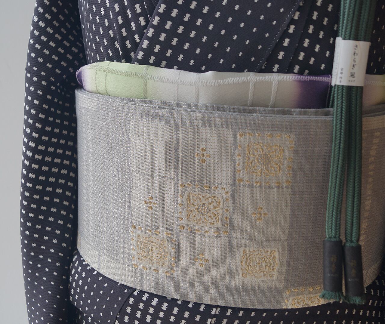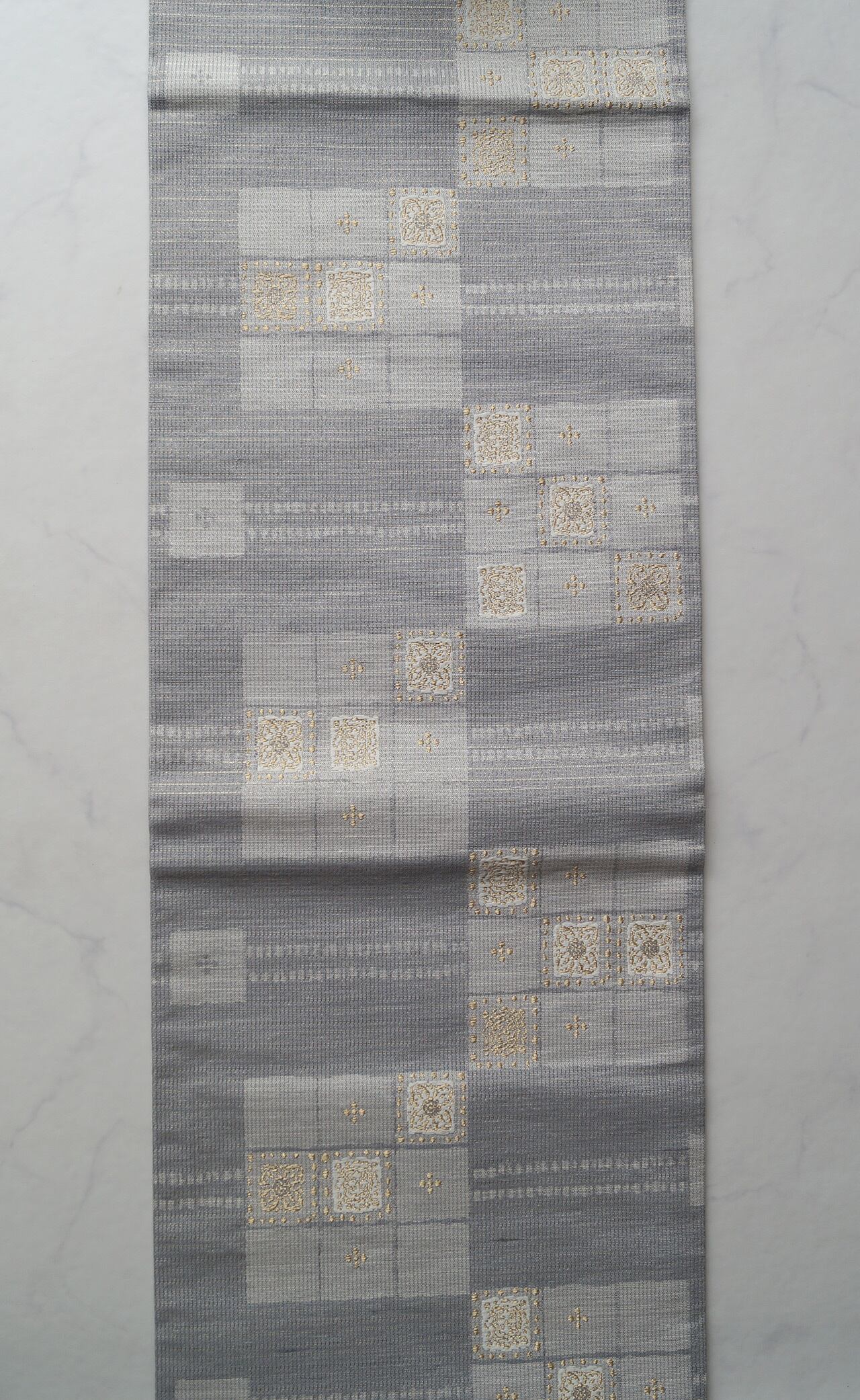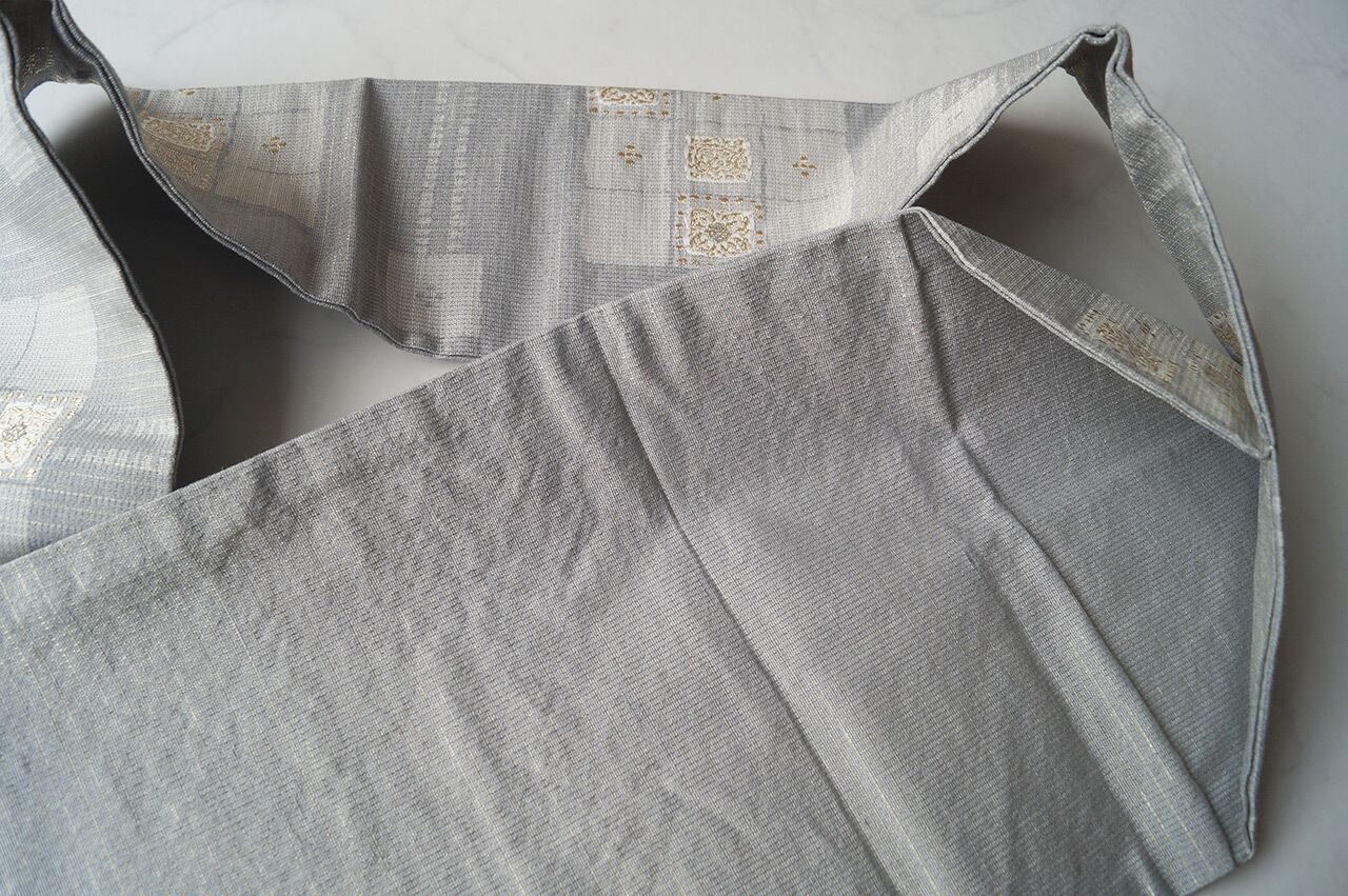 灰青地変わり市松文の紬地なごや帯です。