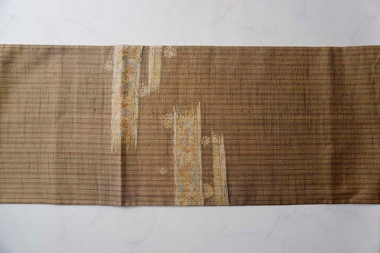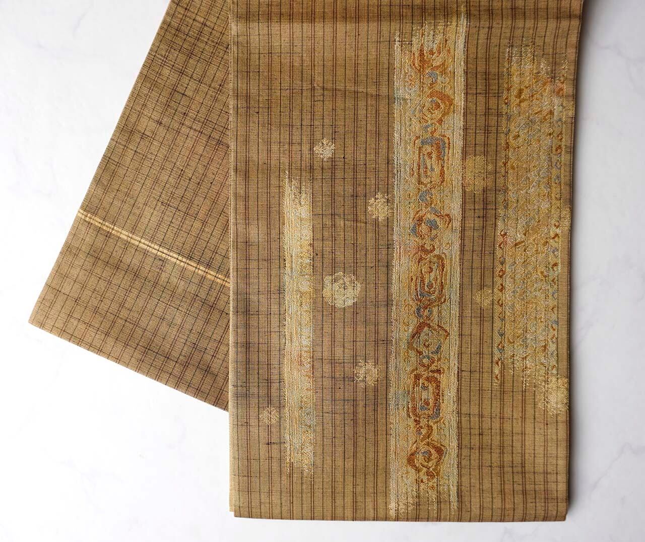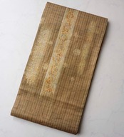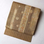 【ふくろ帯】黄唐茶色地 縞に抽象柄×花丸文 ふくろ帯