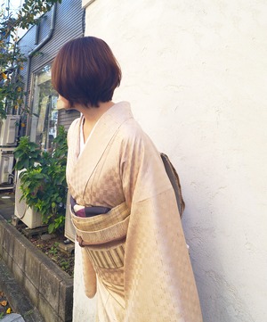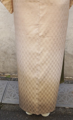 【袷】肌色 市松地紋裾暈かし ぜんまい紬 附下げ