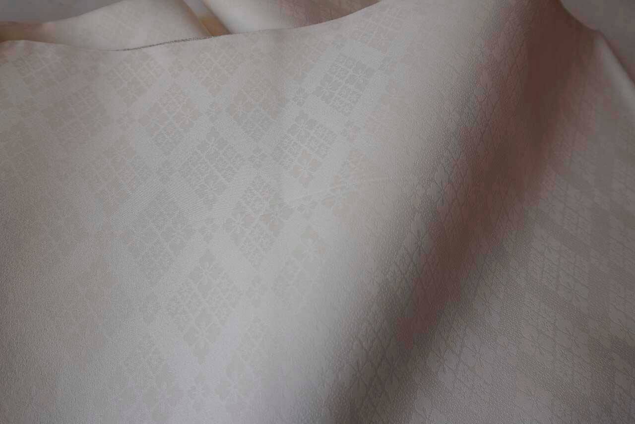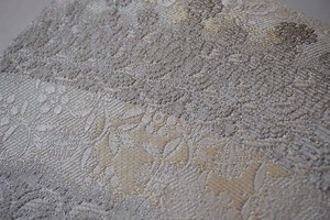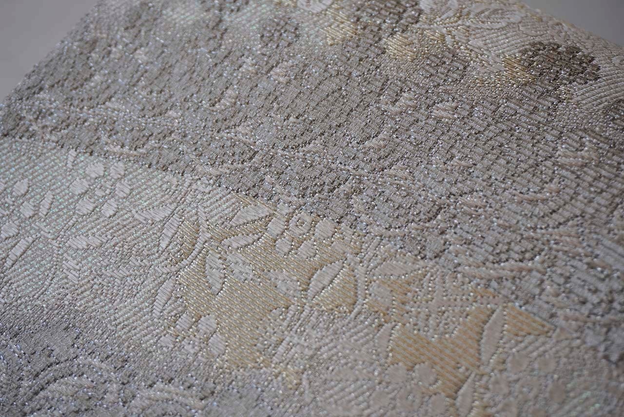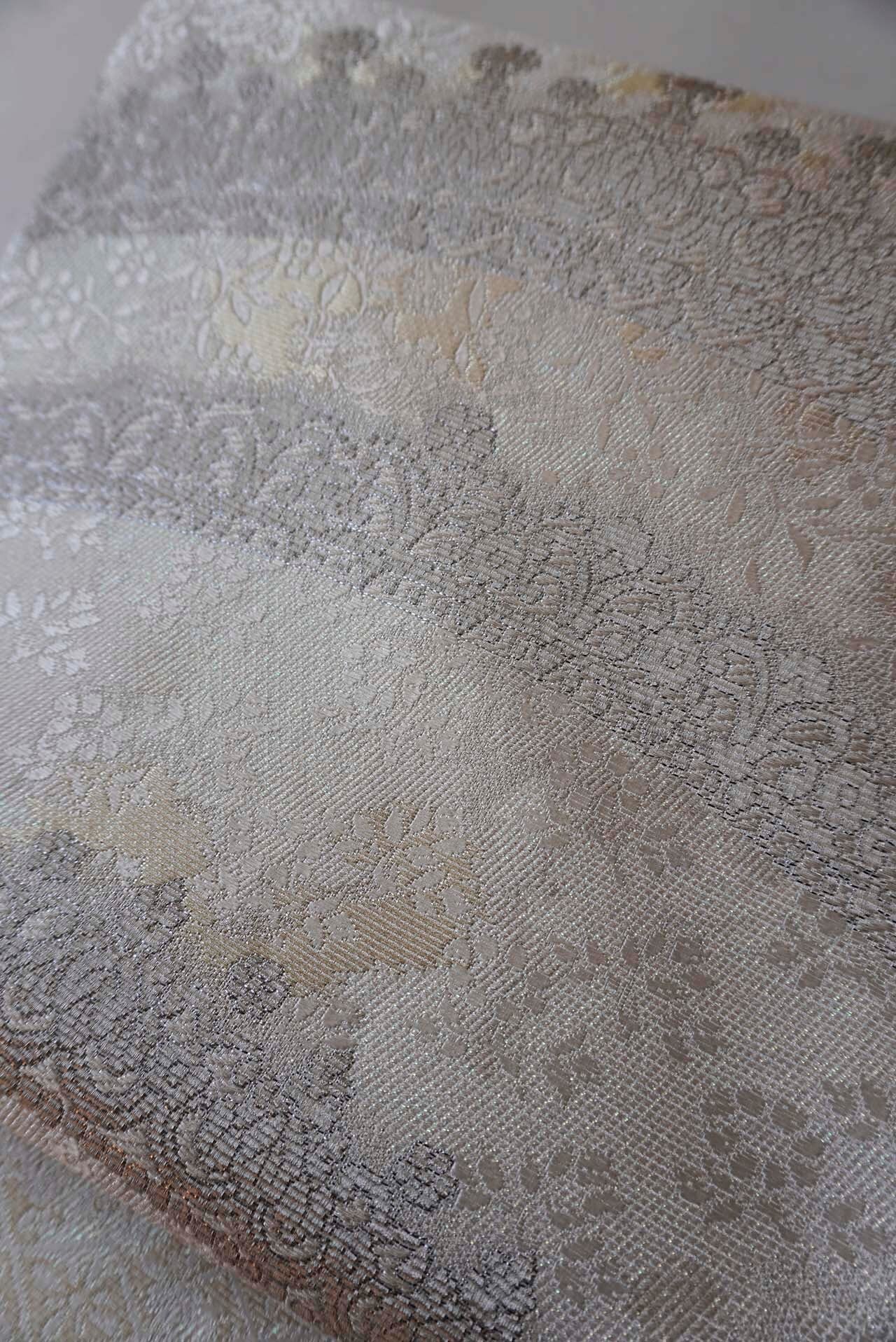 帯地には控えめな唐織で花菱、葵のお花、花唐草の