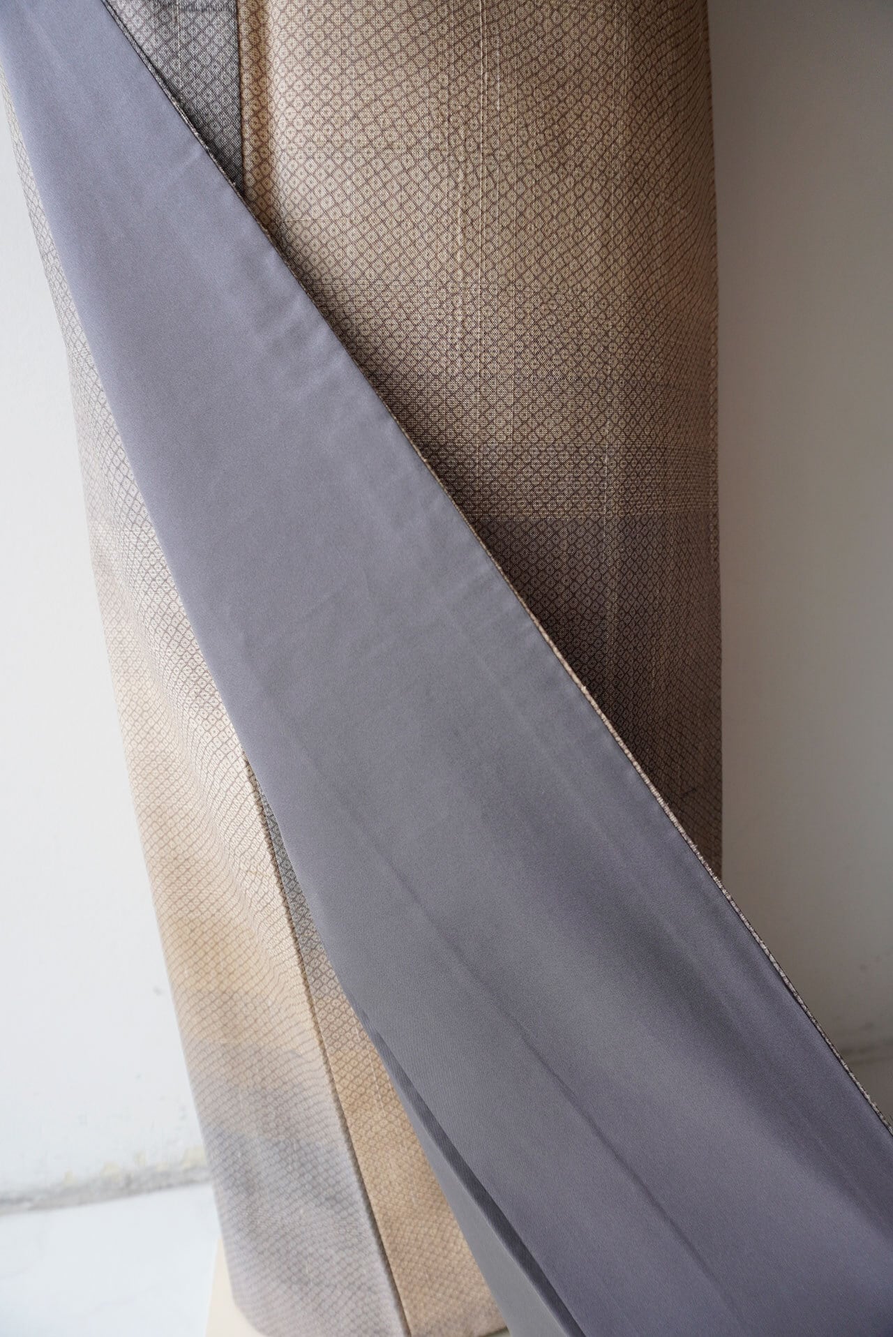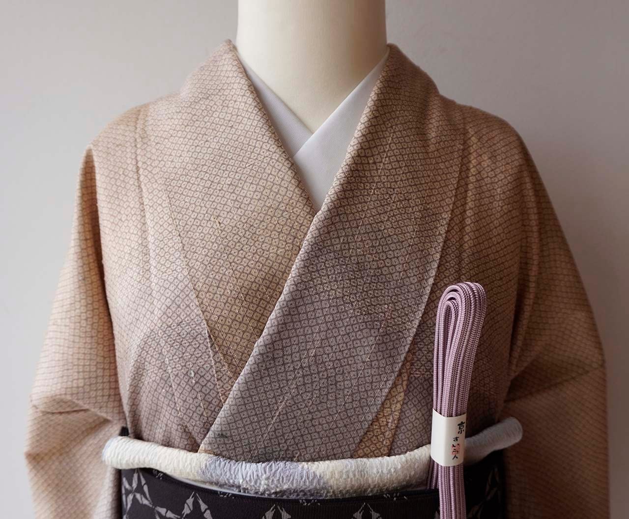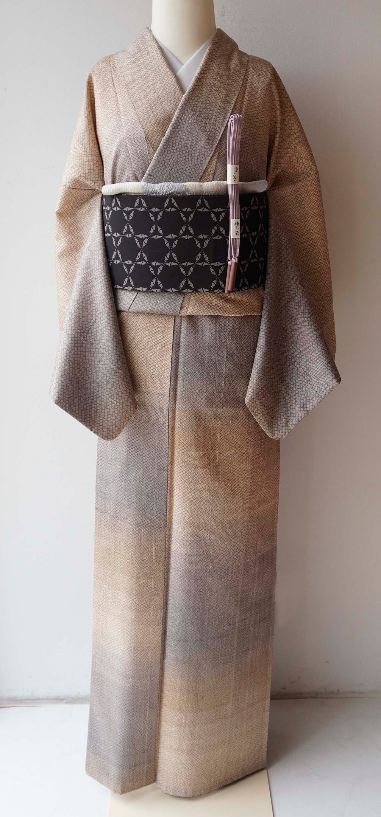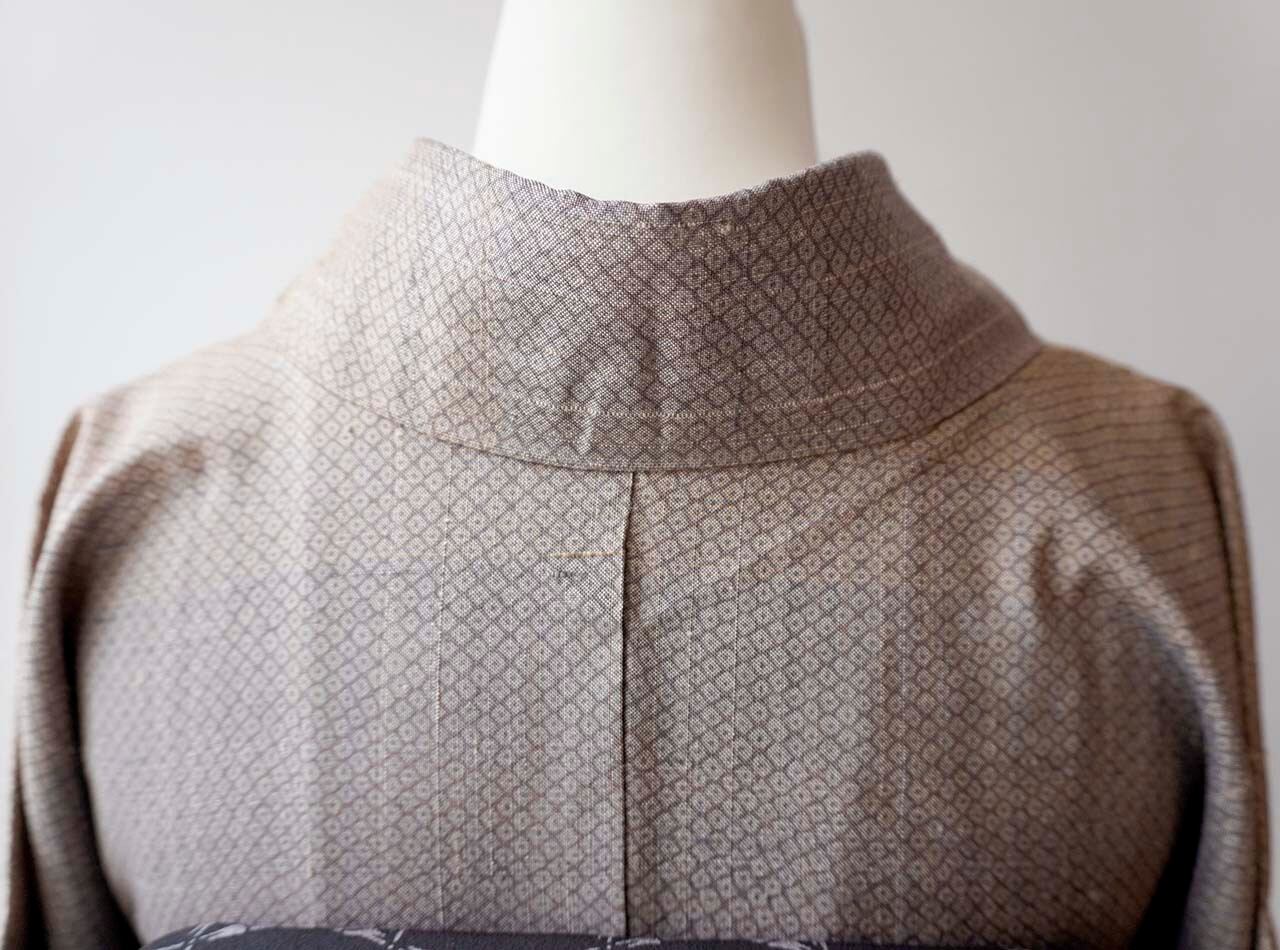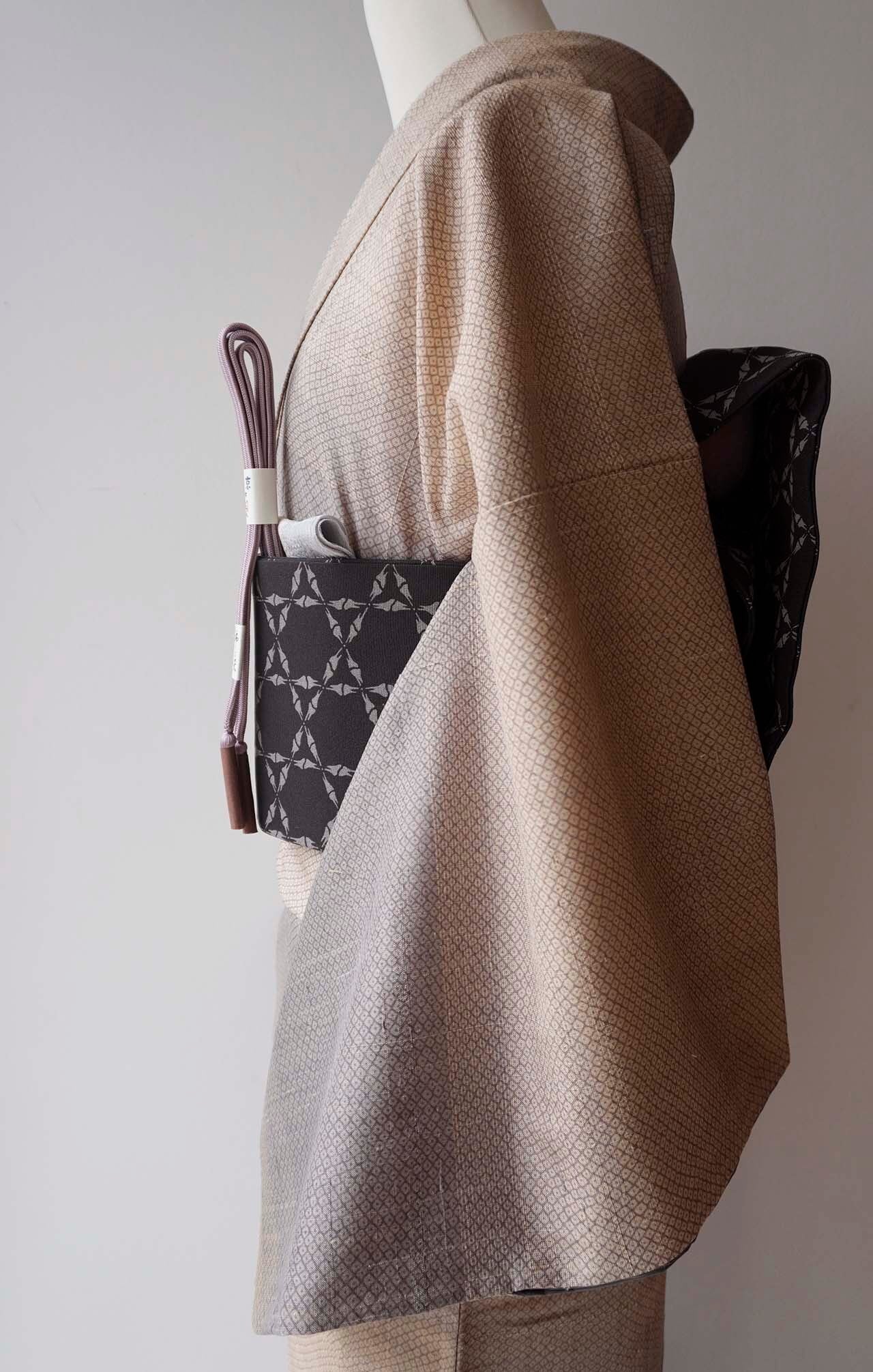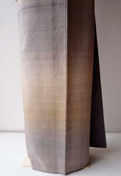 【袷】鳩羽鼠色~ベージュ系横段暈かし織り 疋田文 紬 プチサイズ