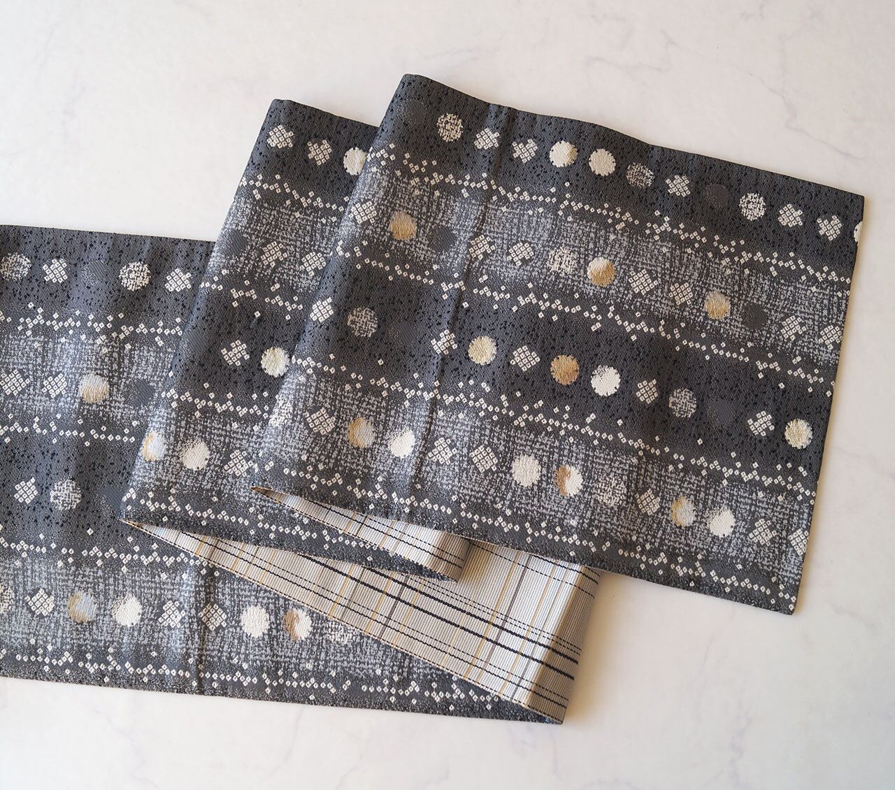 二つの文様が織りなす奥行きのある柄行きで、