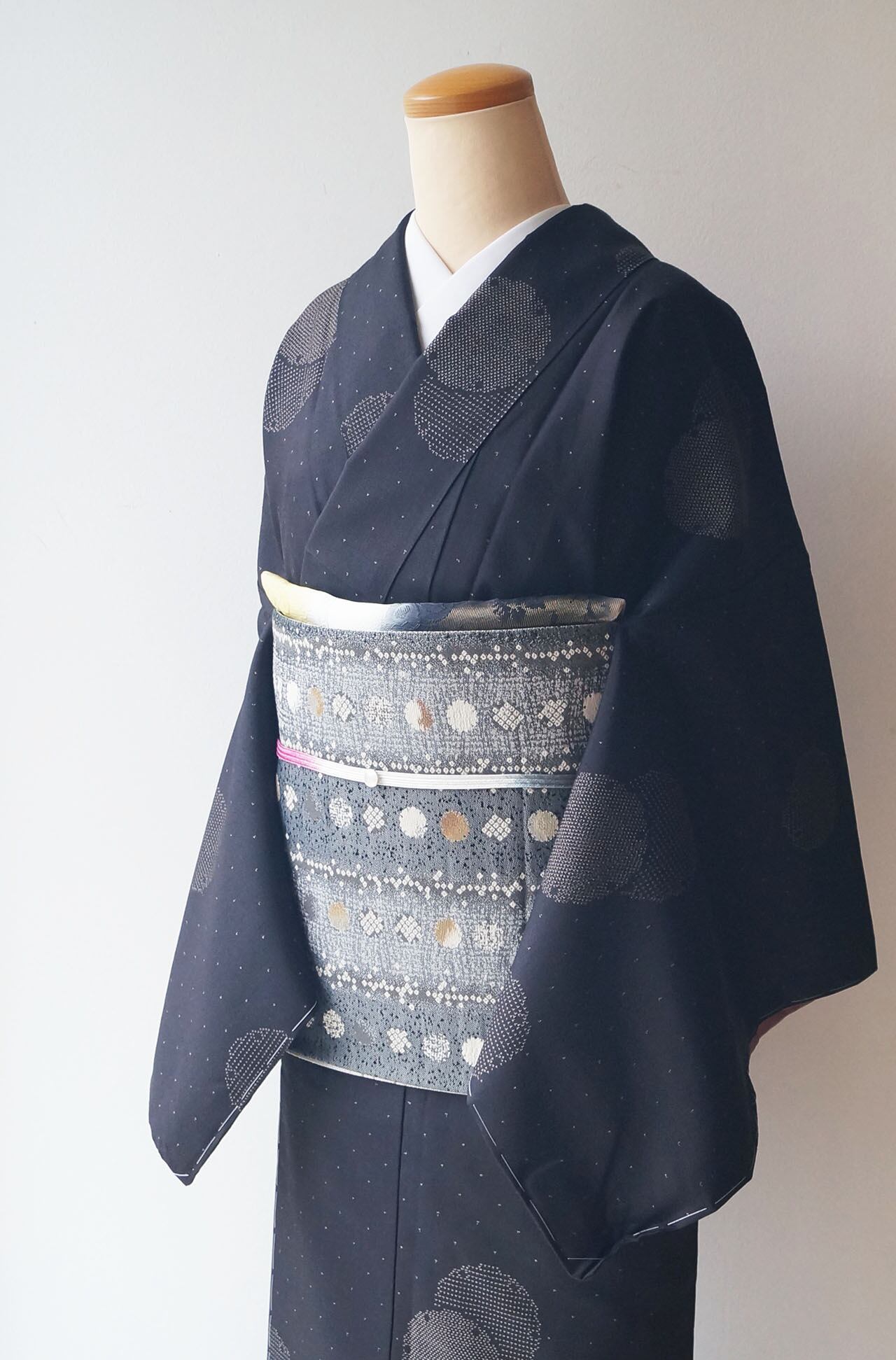 雪輪文は白の疋田文や灰青、金糸銀糸などで