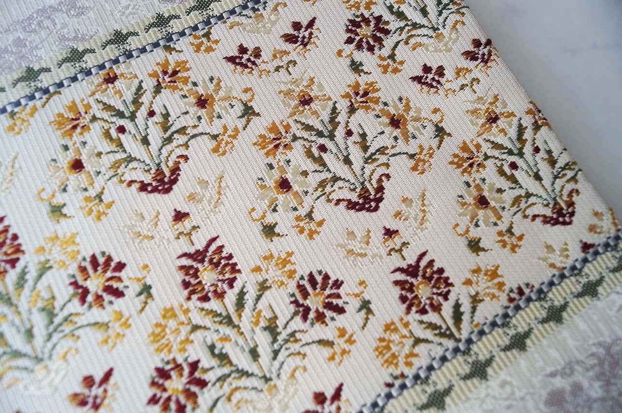 柔らかな紫色の花文を配した地紋を